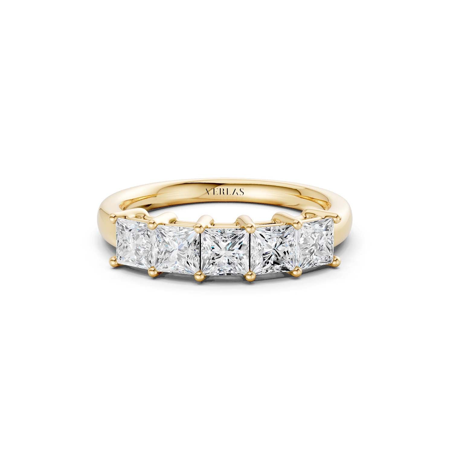 A scintillating 5-stone princess-cut ring of the best lab-made diamonds results in an unrivaled display of brilliance. A timeless beauty, this princess-cut scintillating row of diamonds on the band adds to its charm.