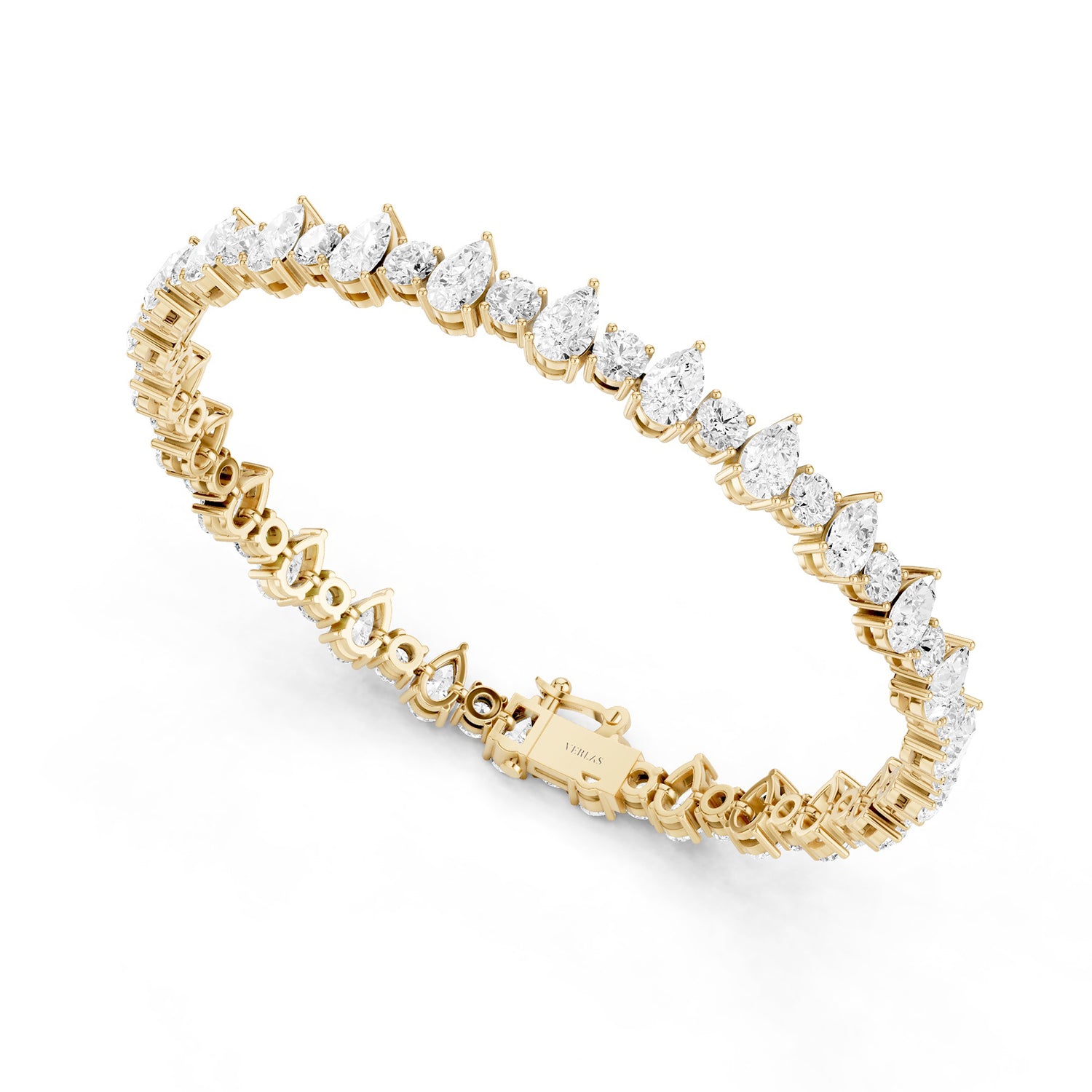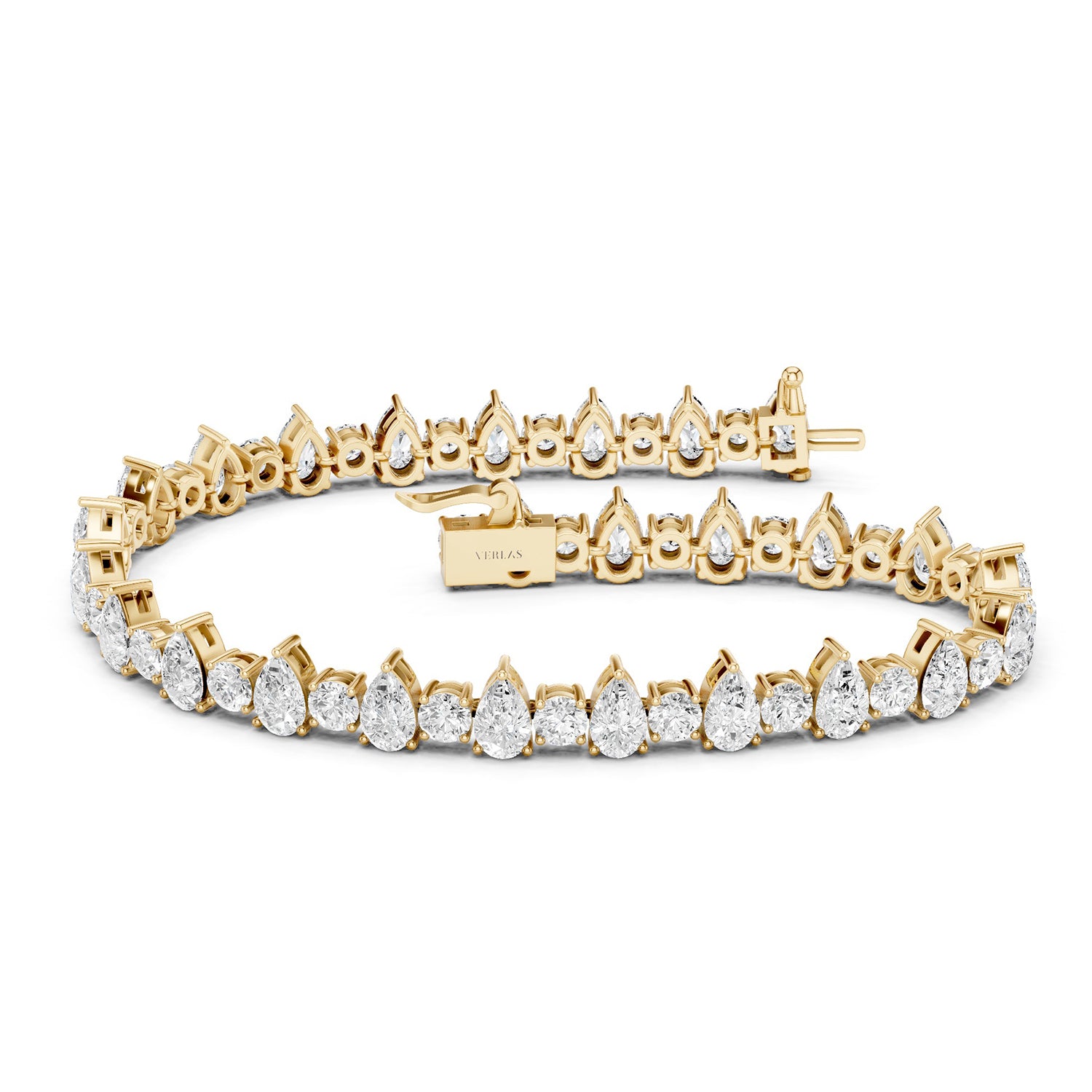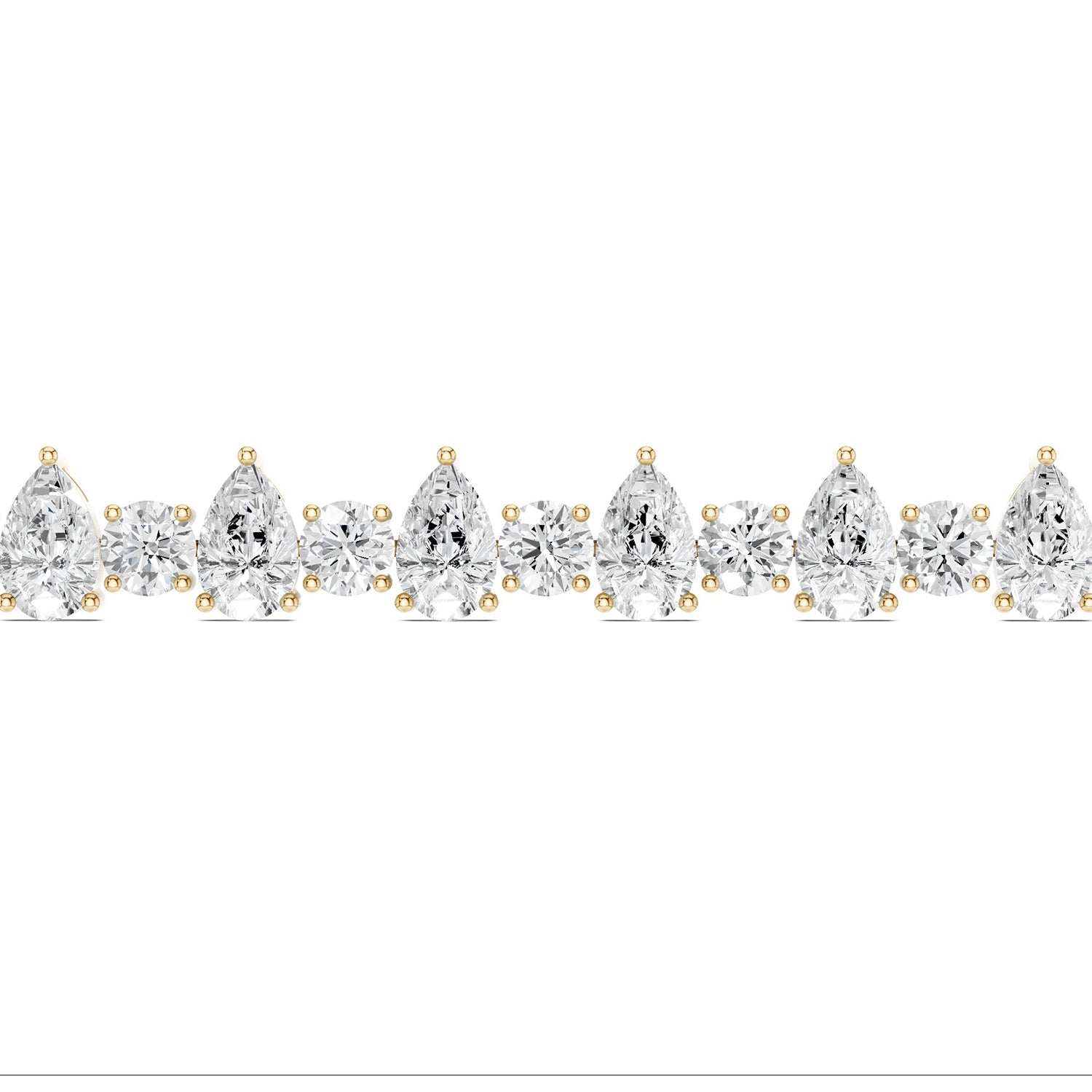 Unveil a masterpiece of elegance and modern sophistication with our 10 Ct. Alternating Pear & Round Diamond Tennis Bracelet. Each meticulously crafted lab-grown diamond—alternating between timeless round brilliance and graceful pear shapes—creates a mesmerizing dance of light that captures attention with every move. The diamonds are securely nestled in prong settings, ensuring maximum brilliance while maintaining durability for everyday elegance or dazzling evening wear. With an open box clasp that offers a secure fit, experience the radiant charm of this iconic diamond bracelet design and let it become your signature of timeless sophistication.