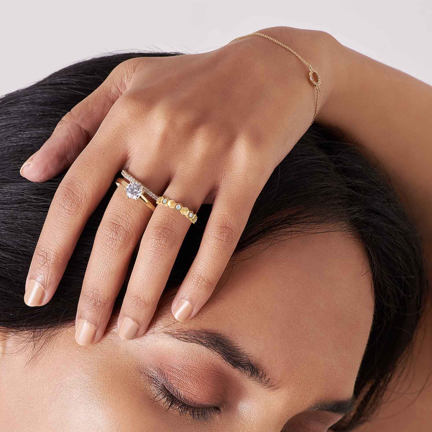 Exquisite and modern, this gold hexagon band features alternating diamonds set in a captivating design. The intricate craftsmanship and attention to detail are evident at every glance. Its contemporary and unique style make it a perfect choice for those seeking a sophist. . . Read More