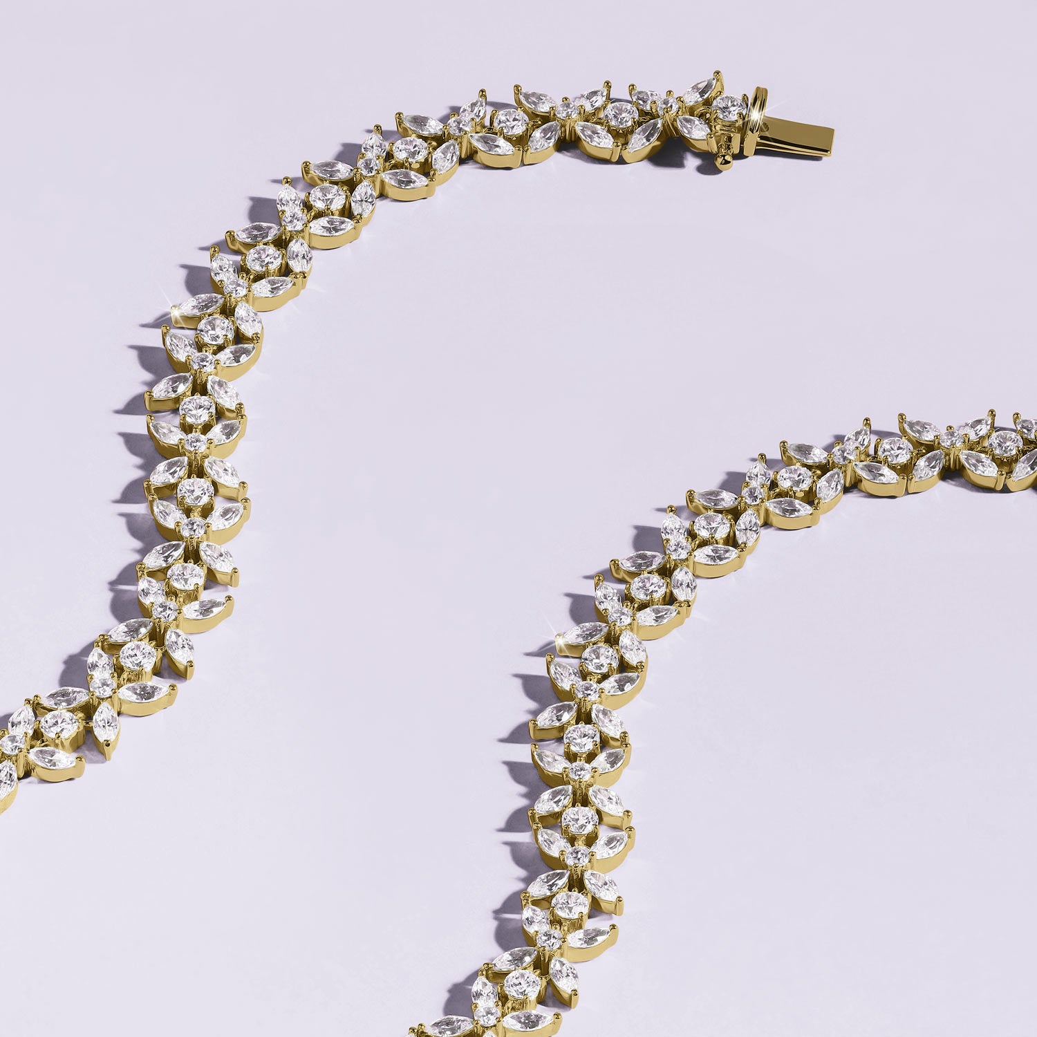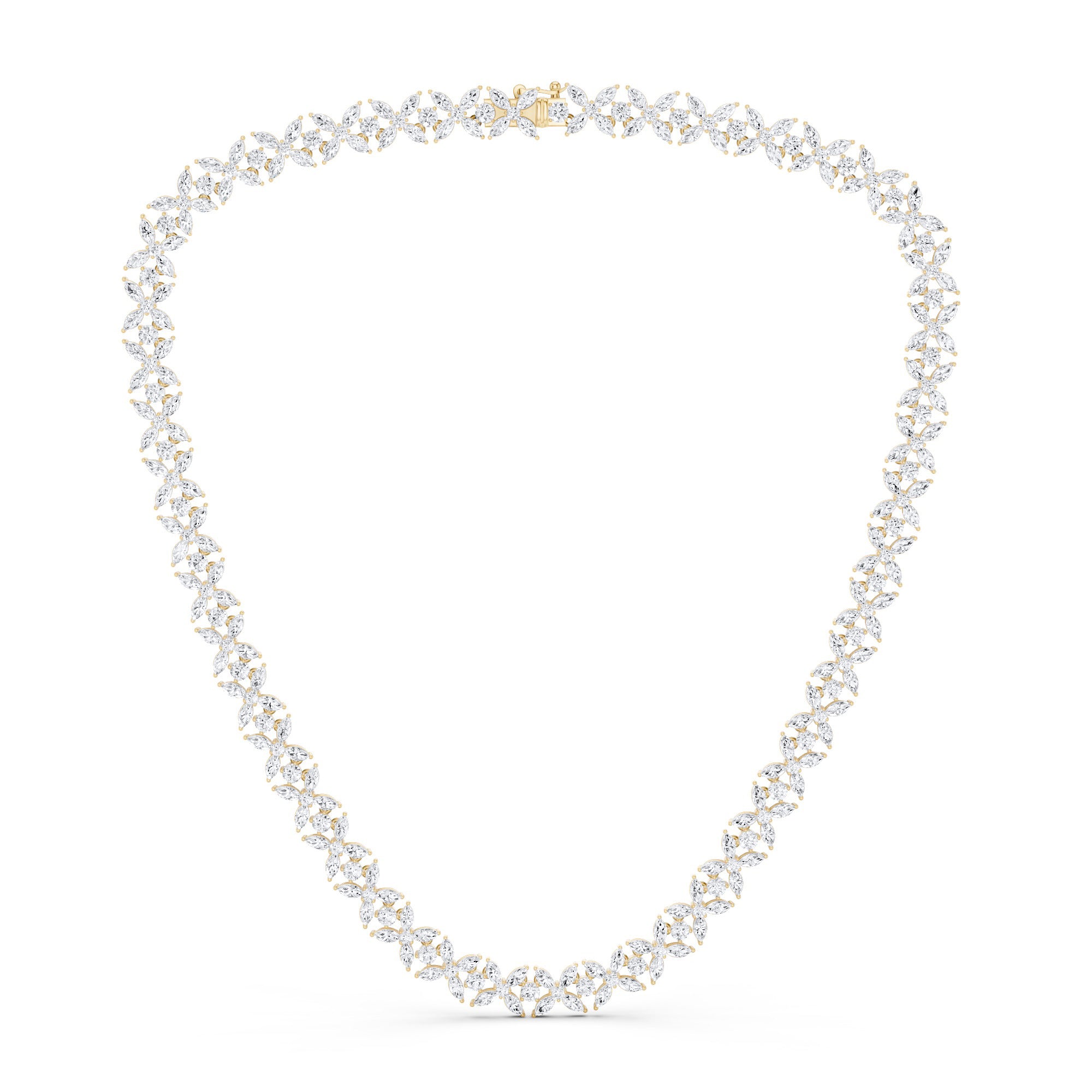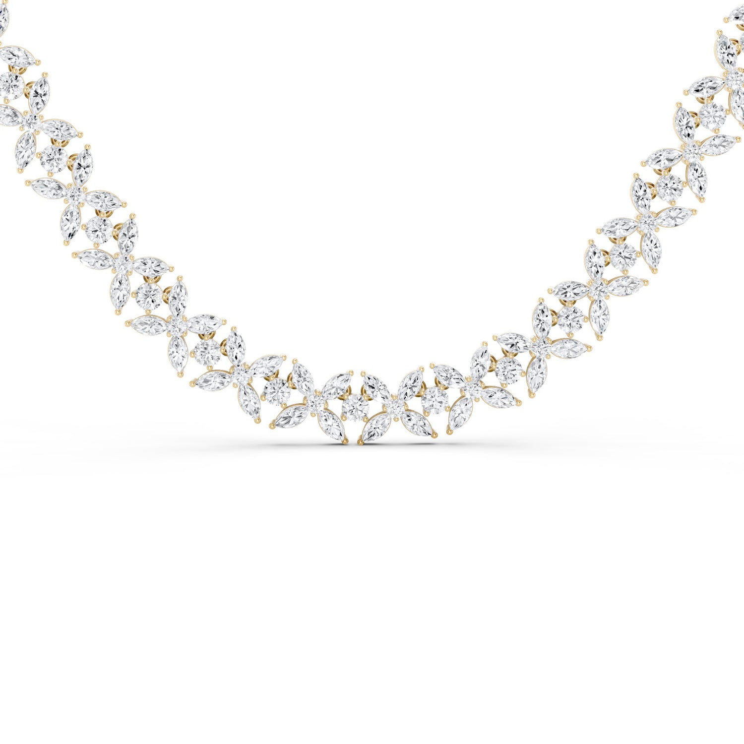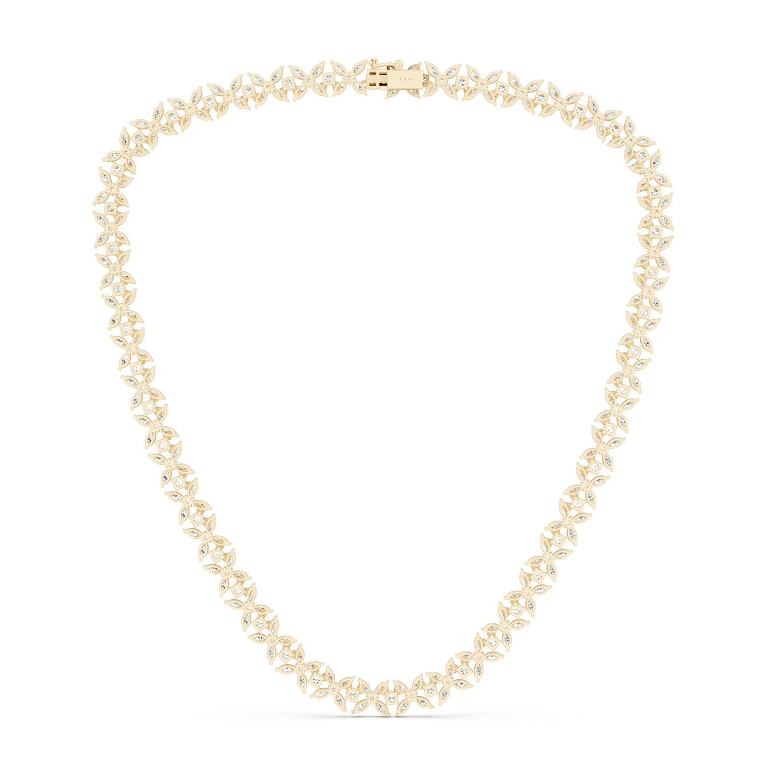 Unveil a symphony of elegance with the Alyssa Bouquet Tennis Necklace. This breathtaking diamond necklace features a full row of enchanting diamond florets, meticulously arranged on a luxurious solid gold chain. Each floret, a delicate bouquet of four marquise diamonds encircling a brilliant round-cut diamond at its heart, is seamlessly separated by additional round-cut diamonds, creating a continuous dance of sparkle and sophistication. Designed to be a true statement piece, the Alyssa Bouquet Tennis Necklace is the perfect accessory for weddings, bridal wear, or any special occasion where you want to shine with unparalleled grace.