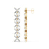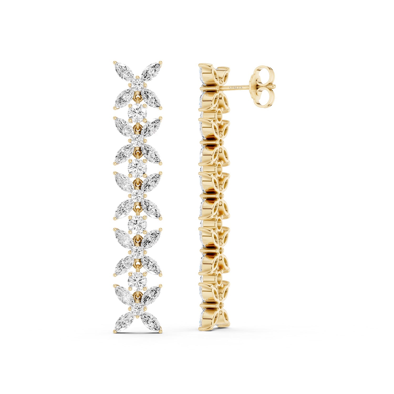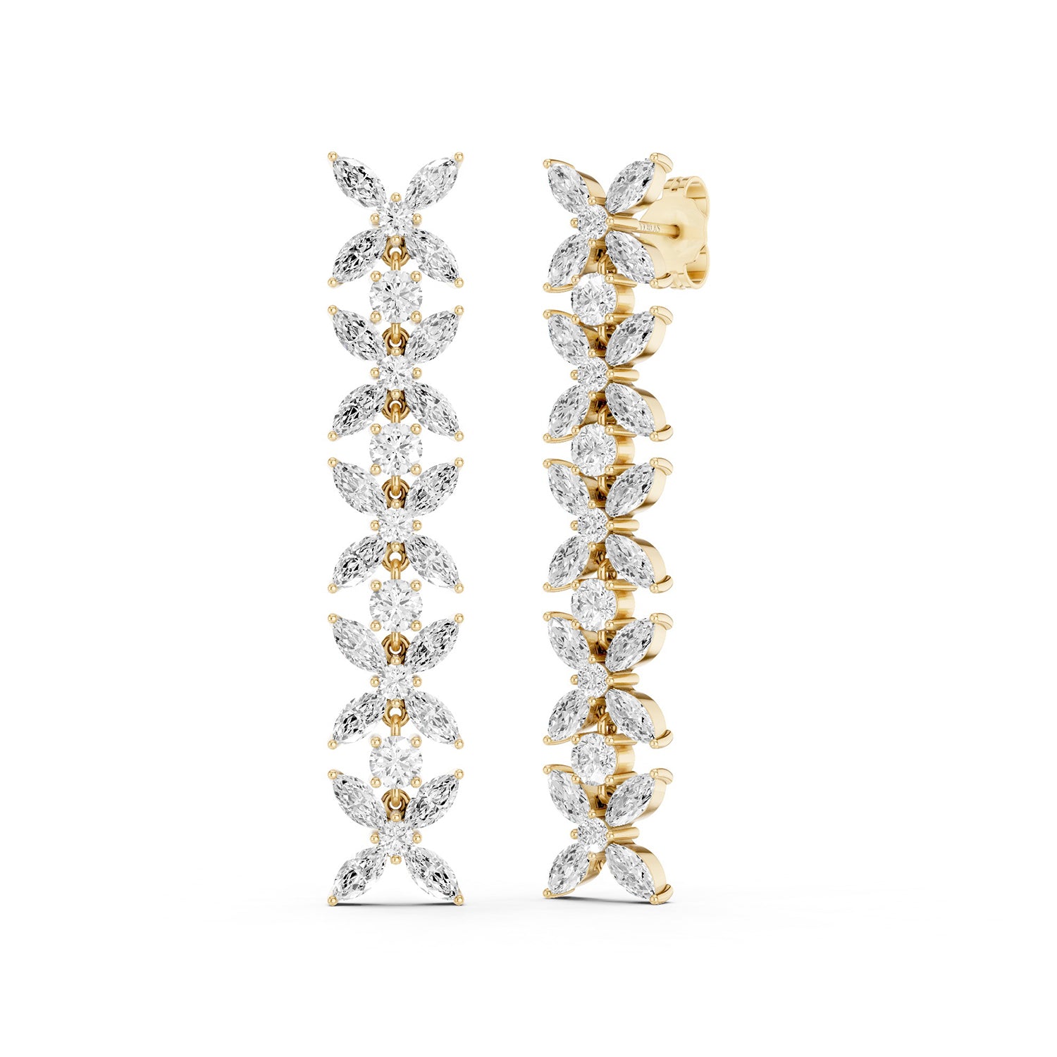 Unveil your inner radiance with the Alyssa Marquise cascading Dangler Earrings. These exquisite earrings are adorned with five diamond florets, each crafted with marquise diamond petals and a round diamond at the center. Set within a flexible gold garland, the diamonds create a stunning cascade that catches the light with every movement. The lustrous lab-grown diamonds shimmer down the garland like a meteor shower, adding a dazzling touch to your presence. As they sway gently, these diamond earrings captivate attention, making them the perfect accessory to elevate any evening look with elegance and flair.