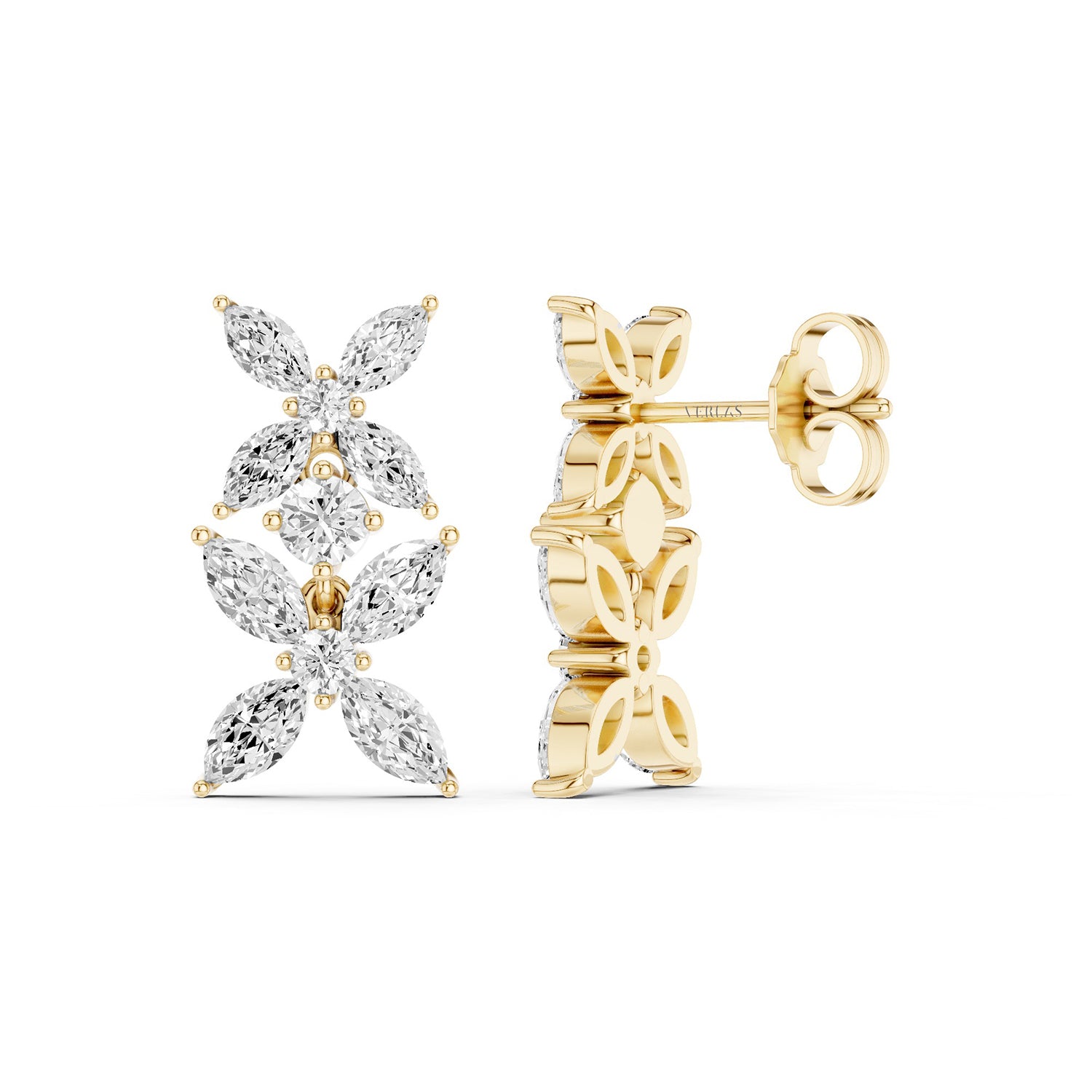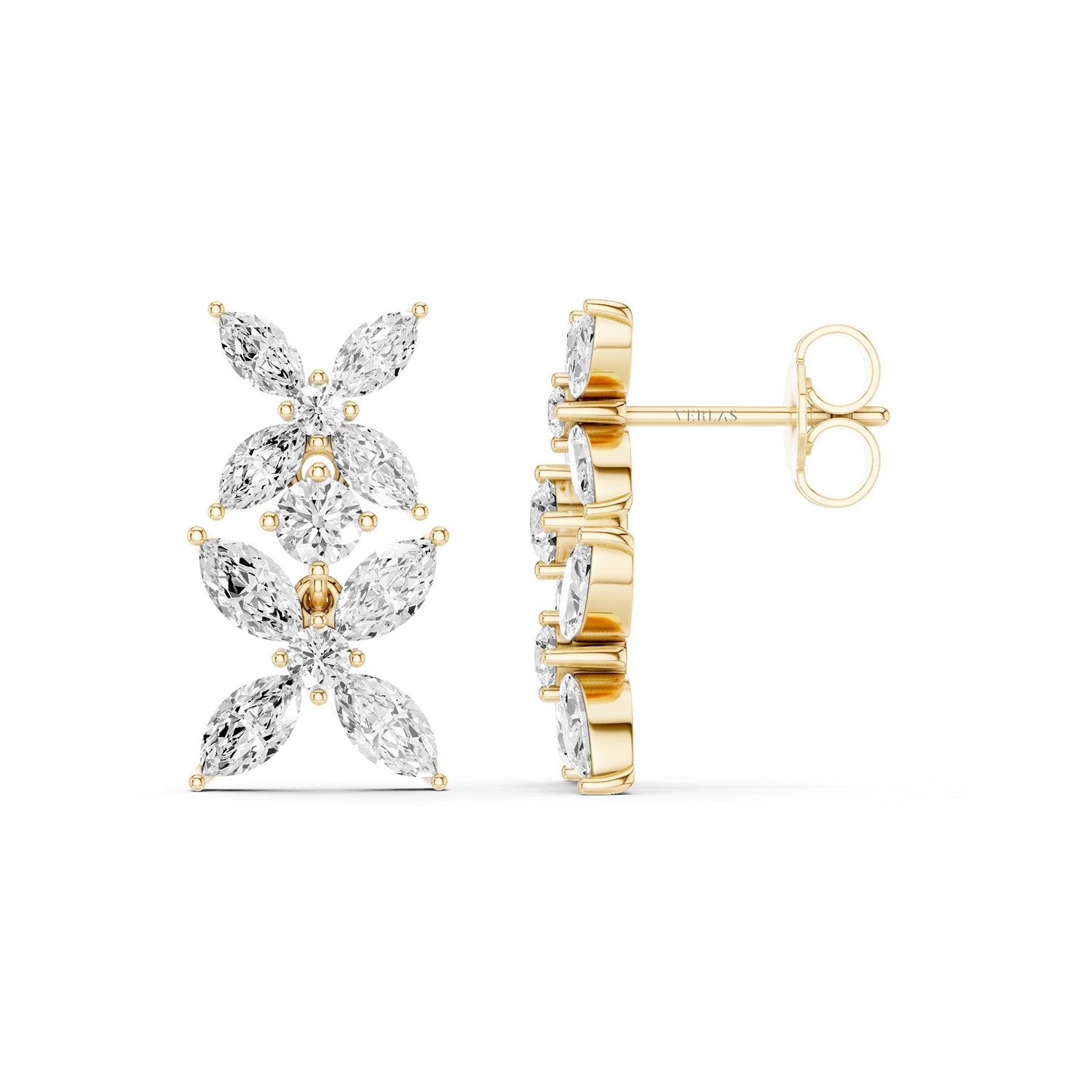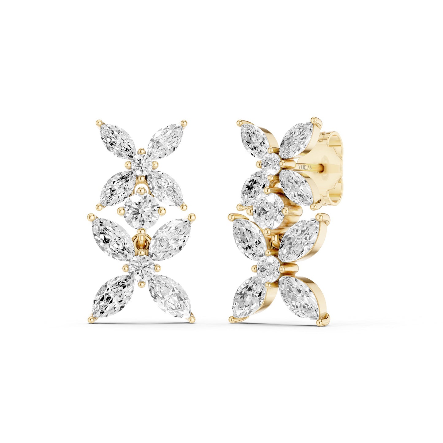 These Alyssa Marquise Drop Earrings feature a floral pattern of marquise diamonds, arranged in both small and large florets to create a breathtaking design. Each floret is intricately connected by a single lab-grown round diamond, adding a touch of brilliance and sophistication. The meticulous arrangement of marquise diamonds and the seamless integration of the central round diamond highlights the exceptional design and craftsmanship of these diamond drop earrings. Perfect for making a refined statement, they capture both modern elegance and timeless beauty.