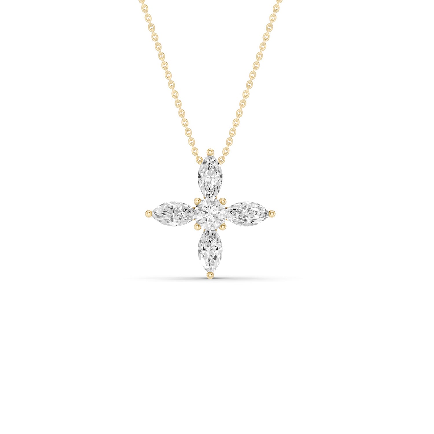 Discover the captivating elegance of the Alyssa Marquise Pendnat Necklace, where sustainable luxury meets timeless design. Crafted with precision, this diamond pendant necklace features marquise-cut lab-grown diamonds in a dynamic X-shaped pattern. Each petal's radiant sparkle enhances the round lab-grown diamond at the center, creating a harmonious blend of sophistication and modern design. This necklace is ideal for those who value both exquisite craftsmanship and ethical choices in their jewelry.
