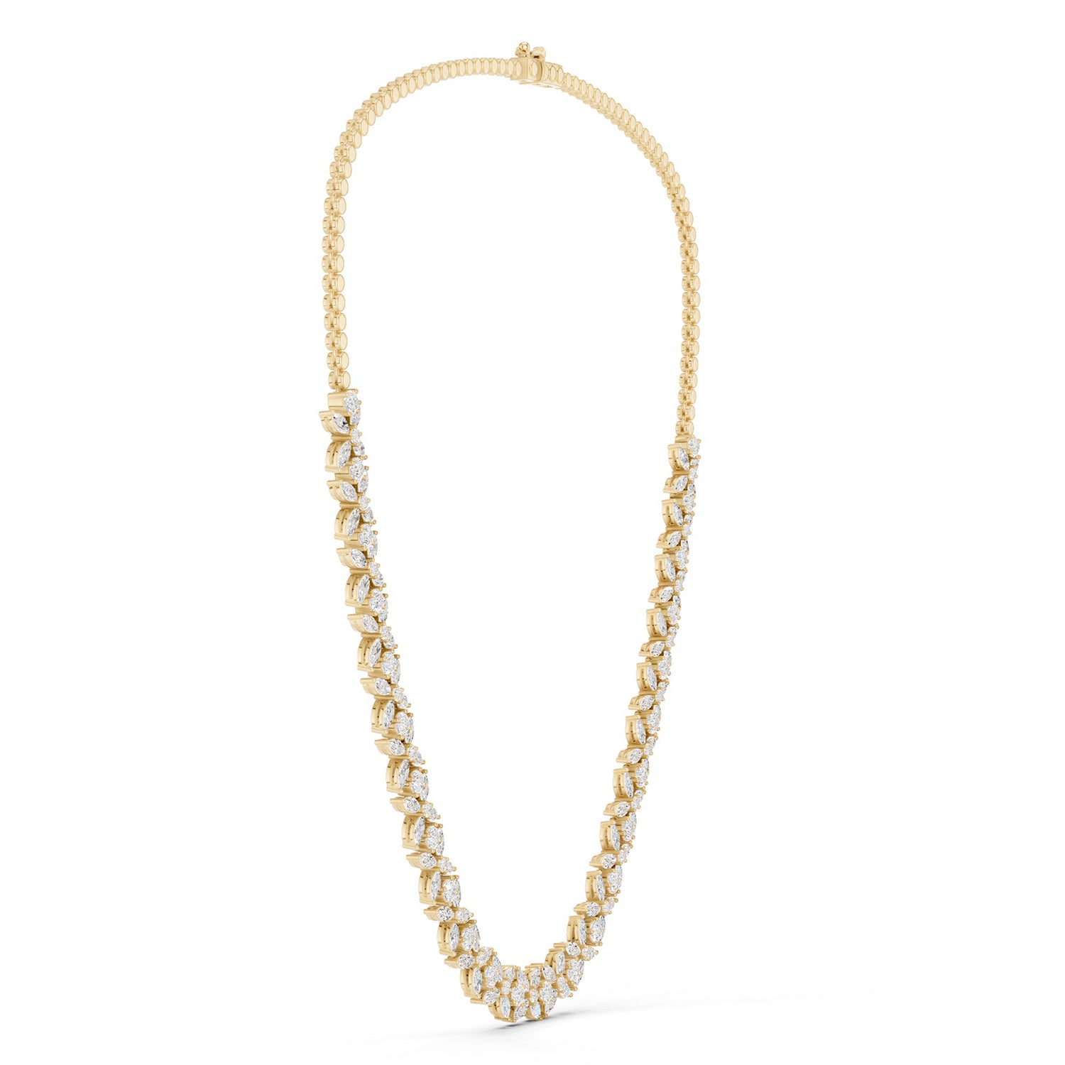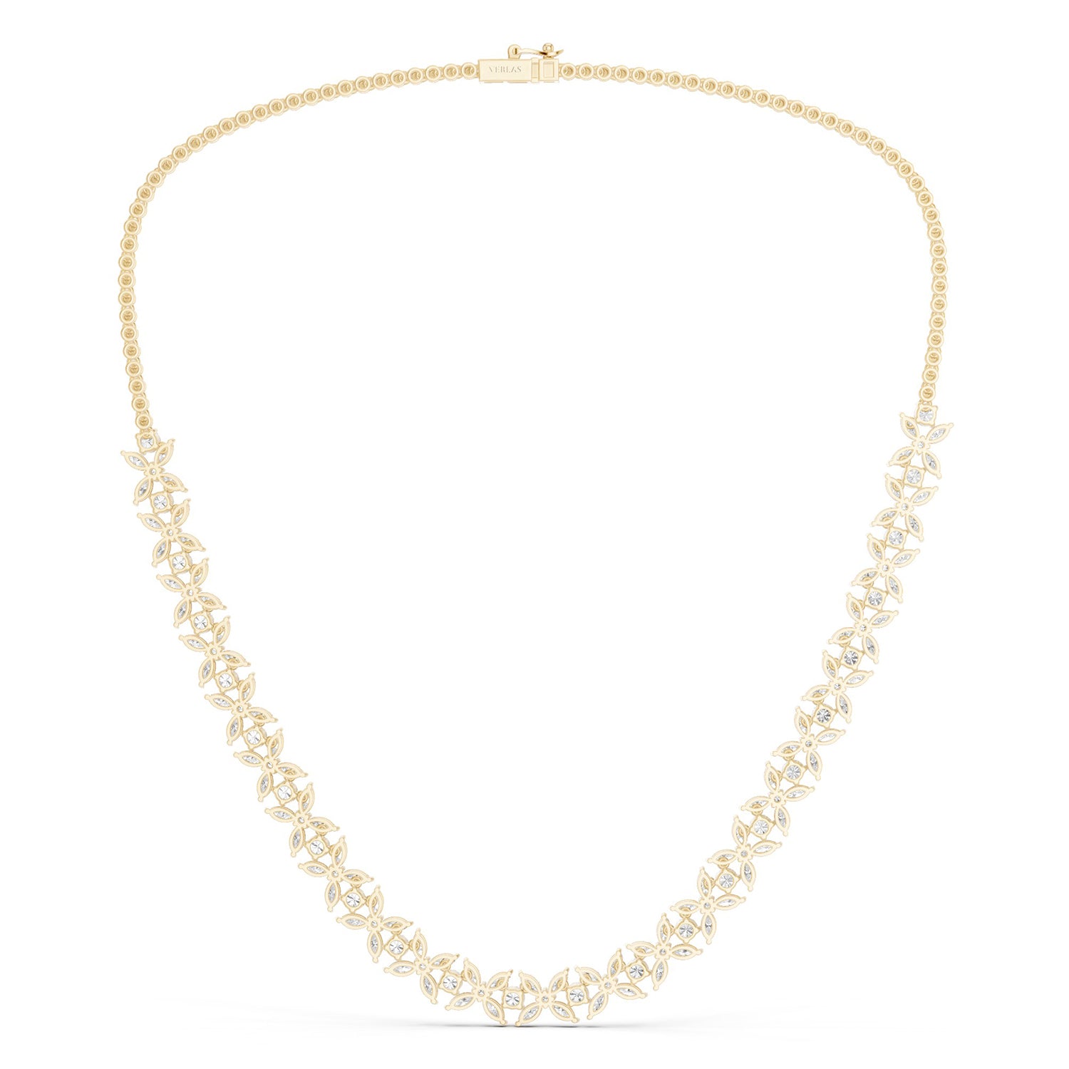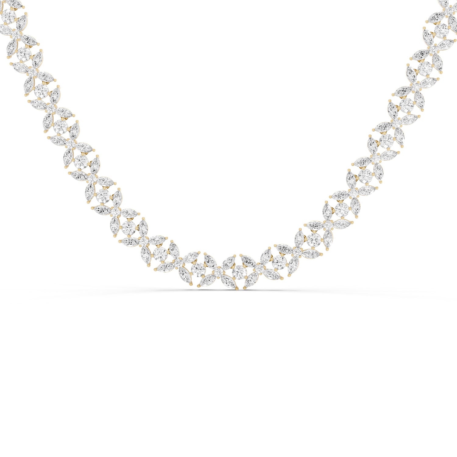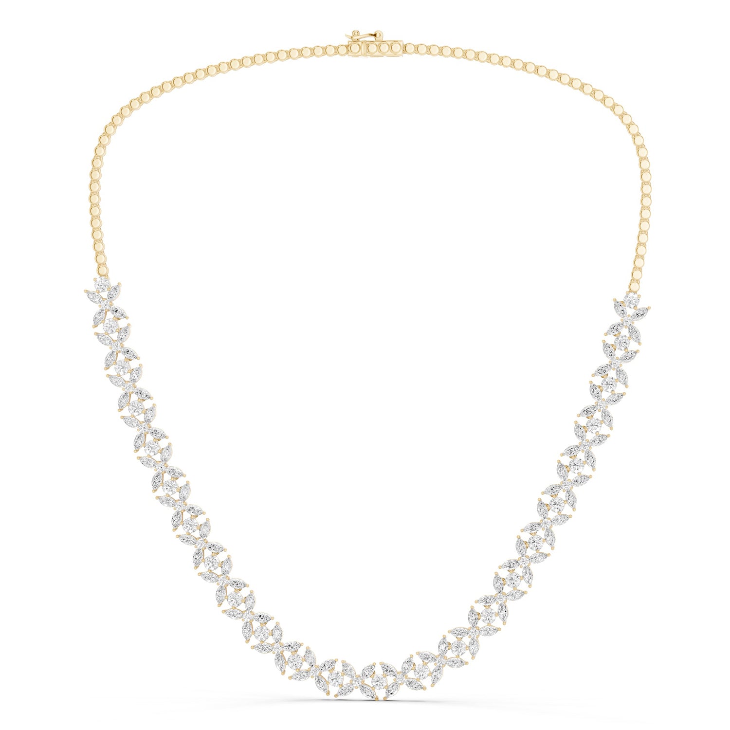 Embrace timeless elegance with the Alyssa Marquise Radiant Tennis Necklace. This exquisite piece features 23 dazzling diamond florets, each artfully arranged on a lustrous solid gold chain. Every floret is a masterpiece, crafted from four marquise-cut diamonds surrounding a brilliant round-cut diamond at the center, with each floret separated by a sparkling round-cut diamond for added brilliance. Whether you're walking down the aisle or attending a glamorous soirée, this statement diamond necklace adds a touch of sophistication and glamour to any look. Its versatile design also effortlessly complements bridal wear, making it the perfect choice for your special day.