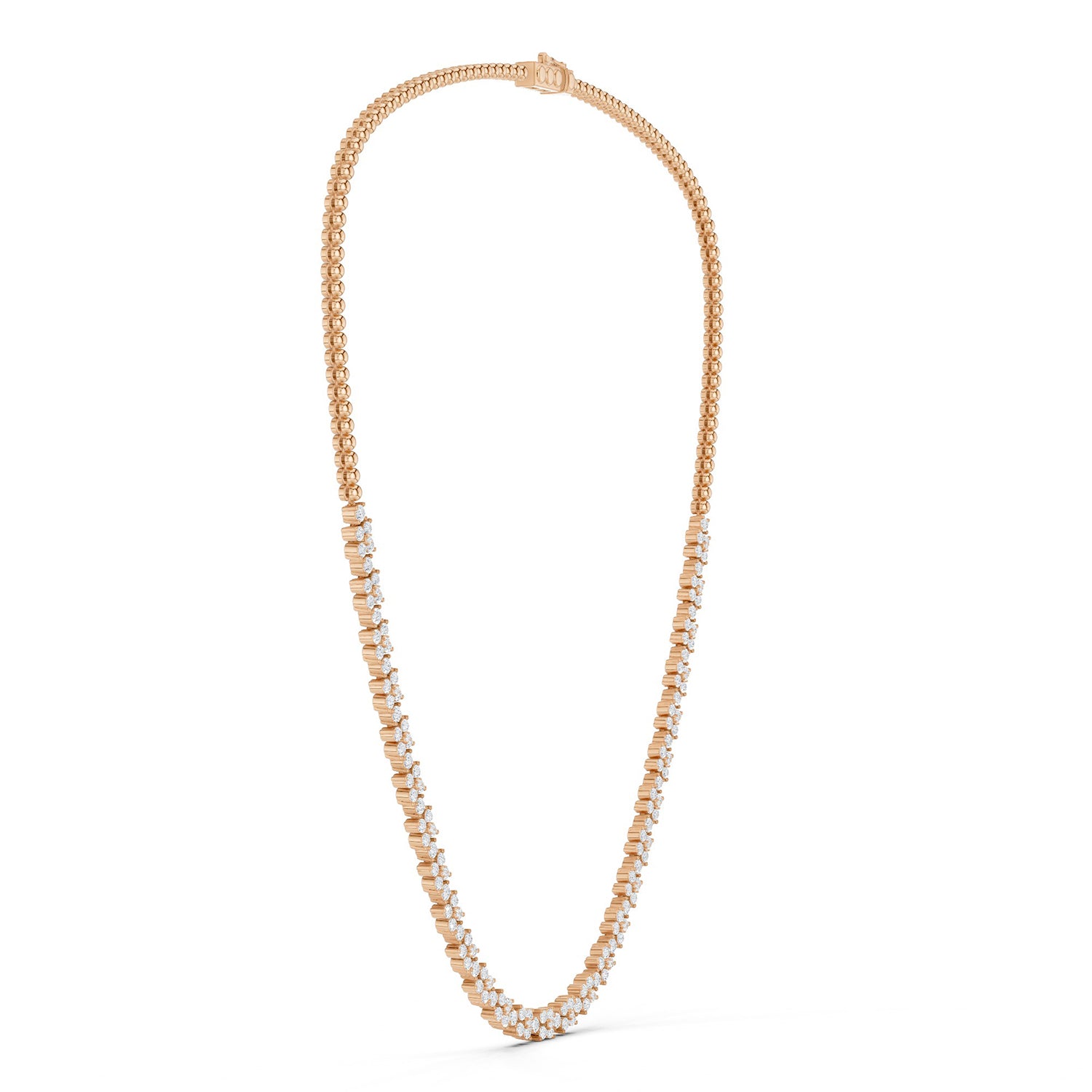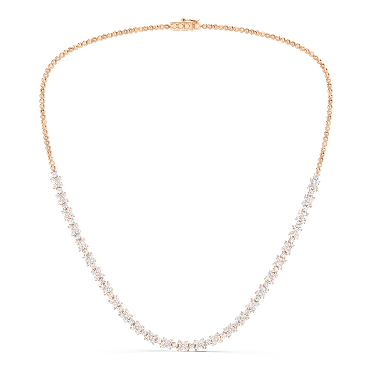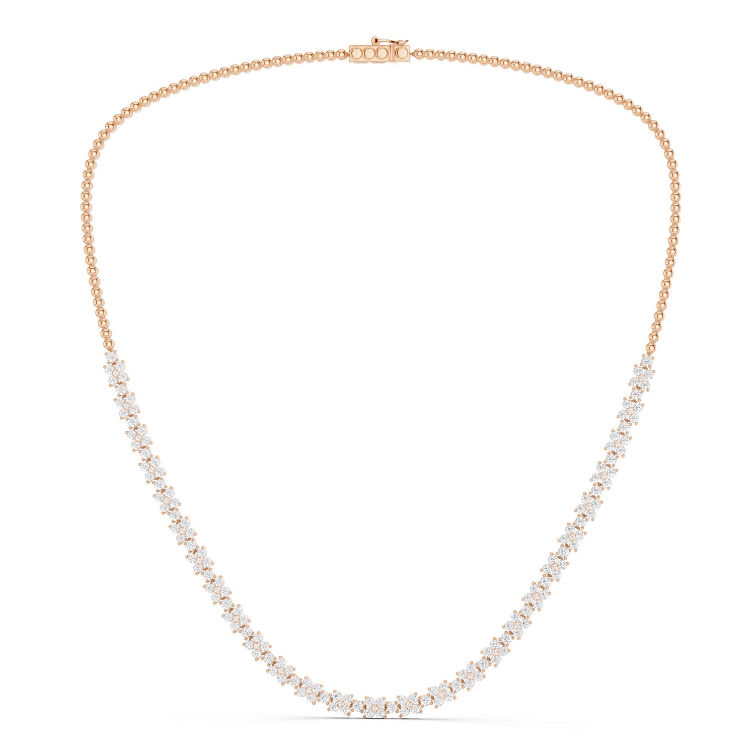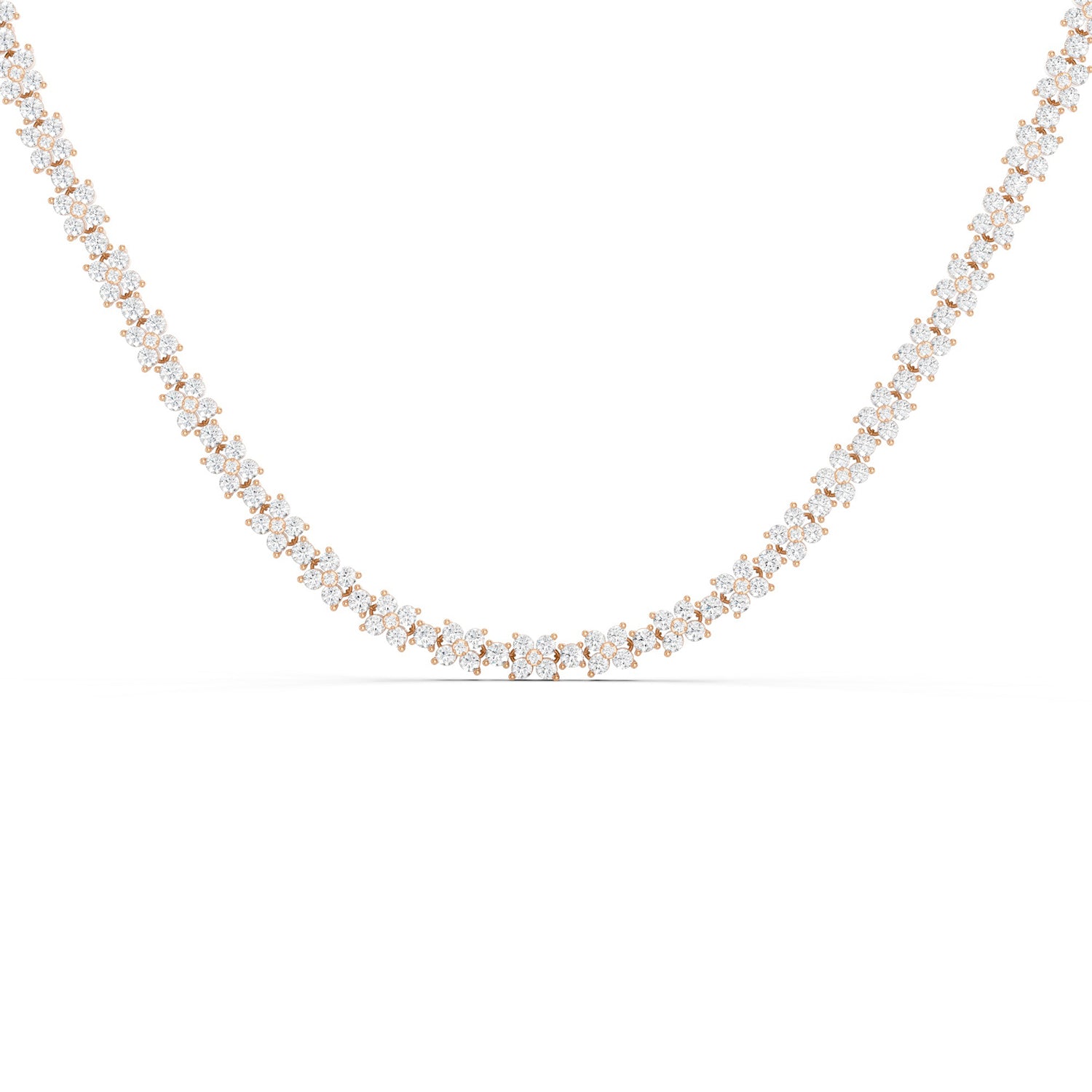The Alyssa Radiant Bouquet Necklace showcases 27 diamond florets blooming on a solid gold necklace. Each floret comprises 5 round-cut diamonds and is separated by a round-cut diamond. A true statement piece, this necklace is also highly versatile and can be styled with any other jewelry you might wear.