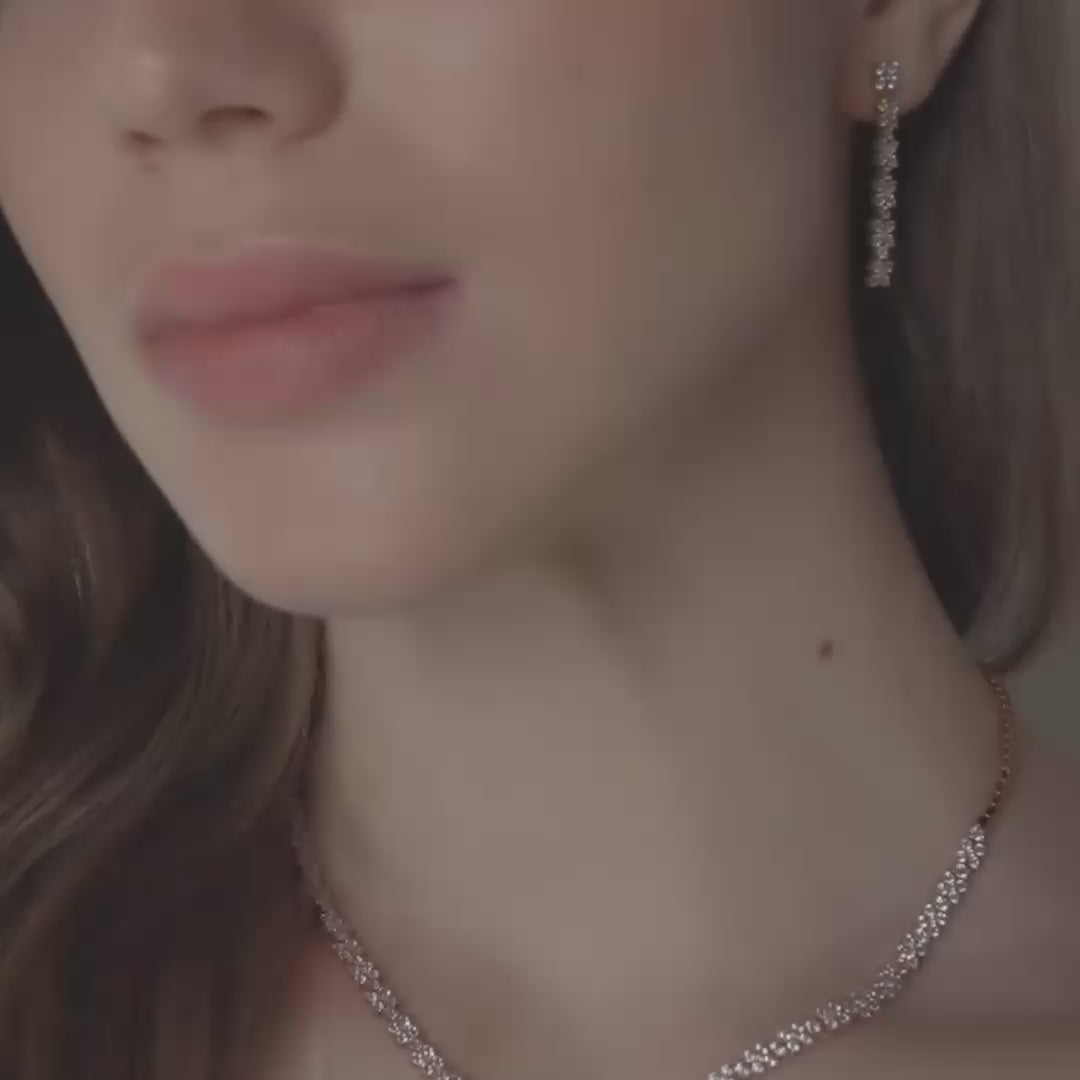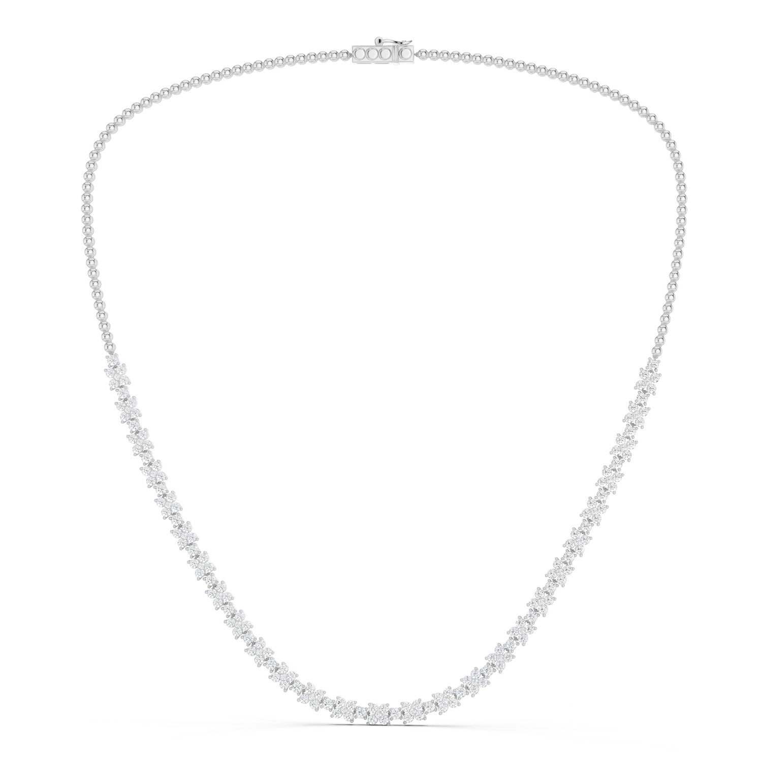 The Alyssa Radiant Bouquet Necklace showcases 27 diamond florets blooming on a solid gold necklace. Each floret comprises 5 round-cut diamonds and is separated by a round-cut diamond. A true statement piece, this necklace is also highly versatile and can be styled with any other jewelry you might wear.