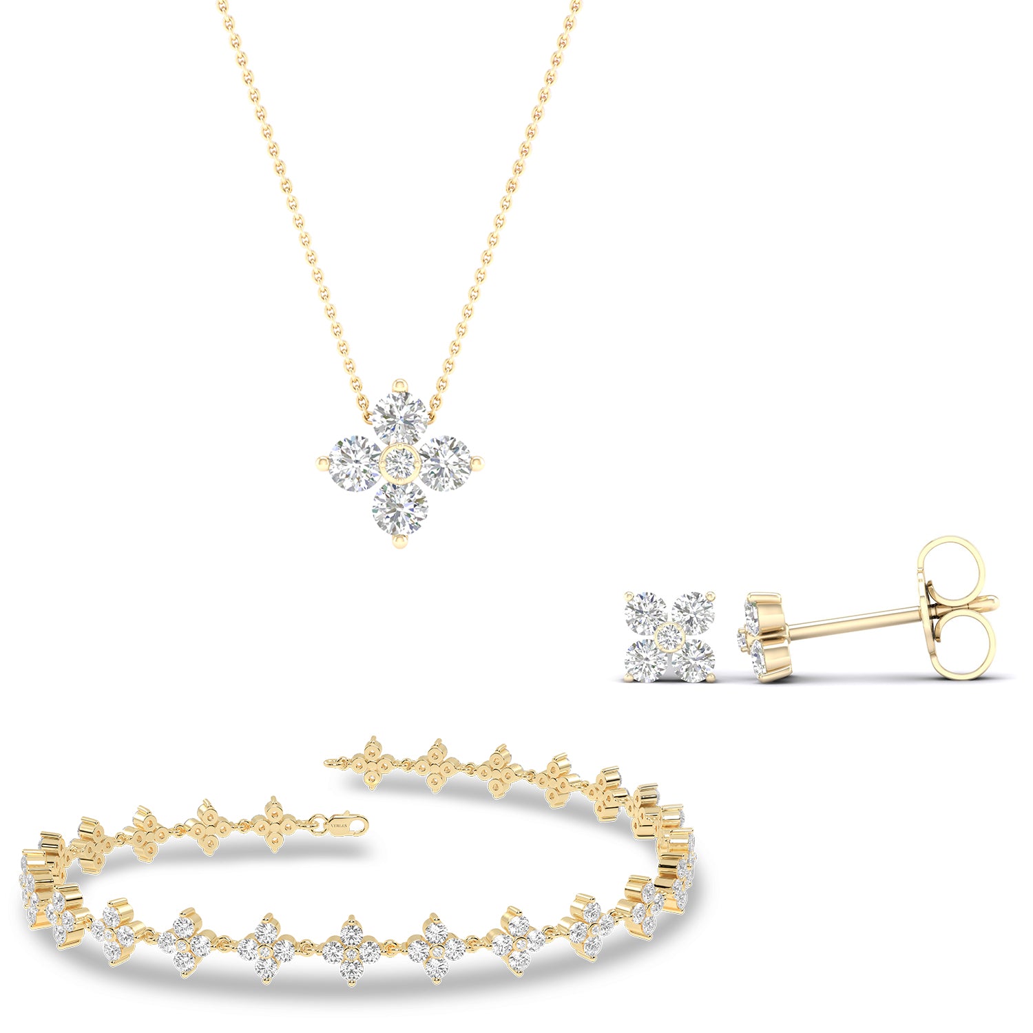 Alyssa diamond jewelry 2.5 Ct. gift set embodies true elegance.Each of the 3 designs is meticulously crafted to resemble delicate and enchanting flowers, capturing the essence of blooming beauty making perfect to express your everlasting love.