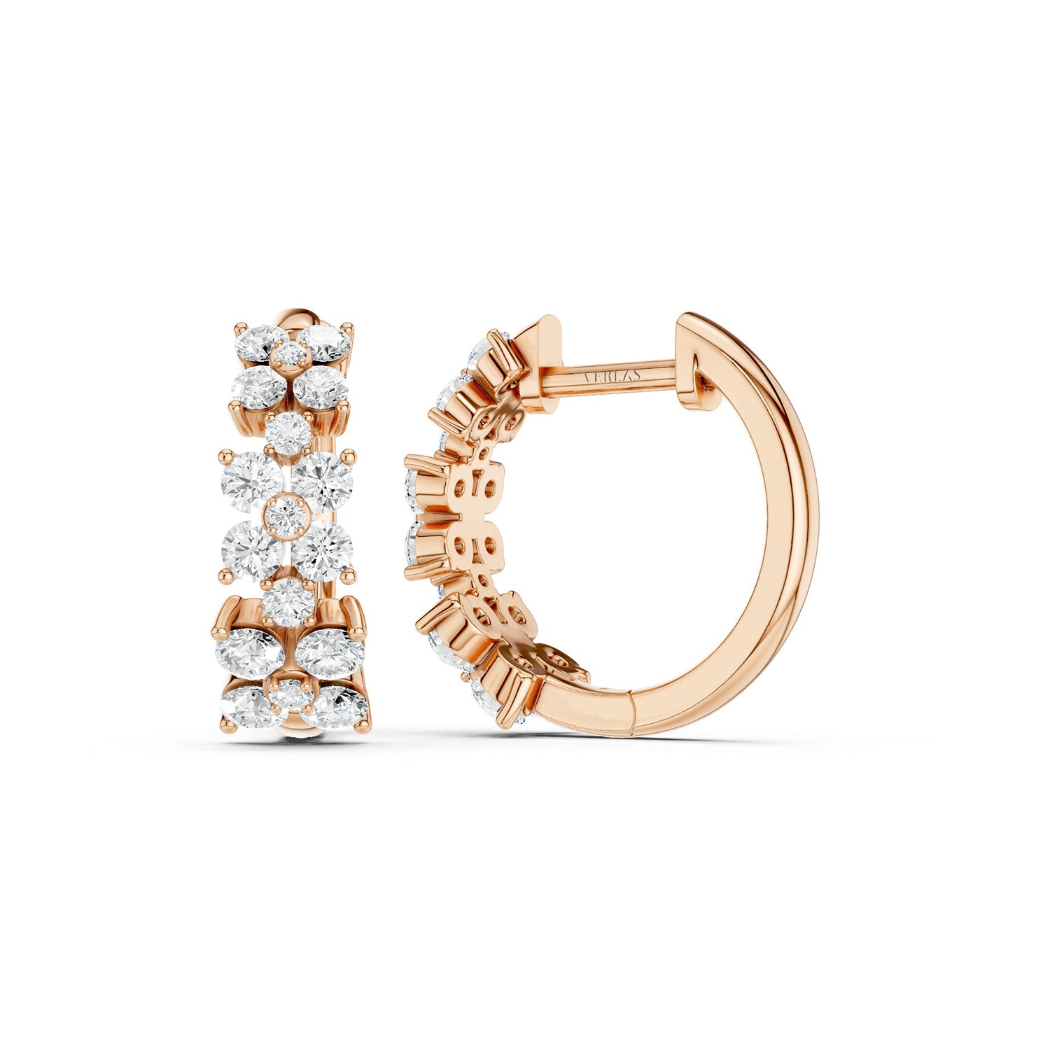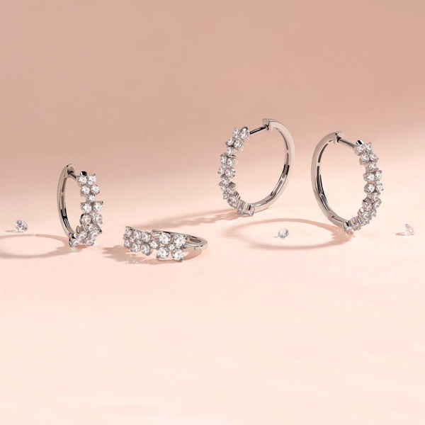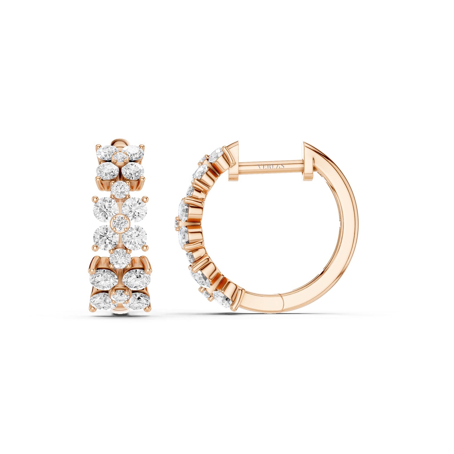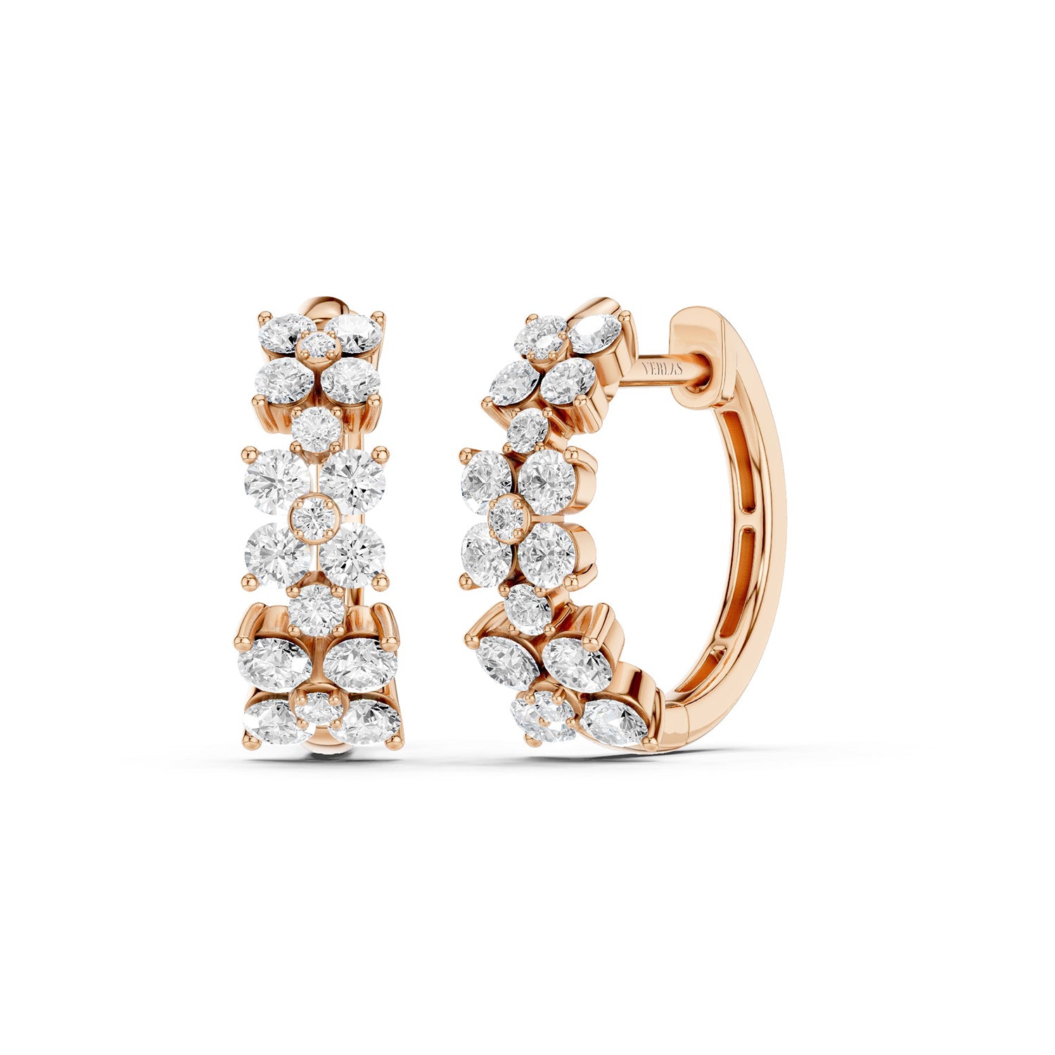 The Alyssa Tres Floral Hoops are a celebration of the sumptuous allure of Mother Nature. It is a pair of beautiful golden hoops adorned with three diamond florets. Each floret features 4 round diamonds centered around and separated by a single diamond. As the light casca. . . Read More