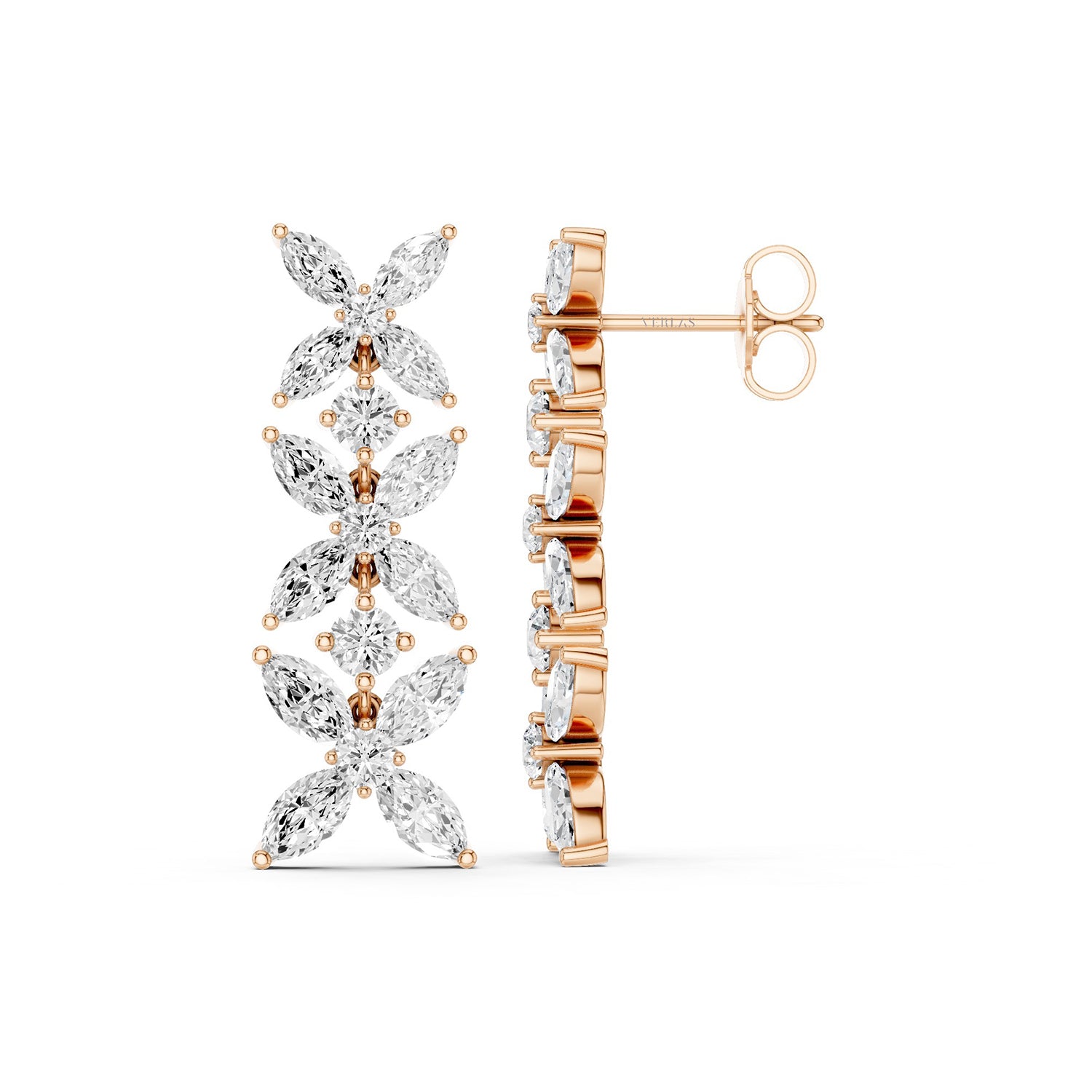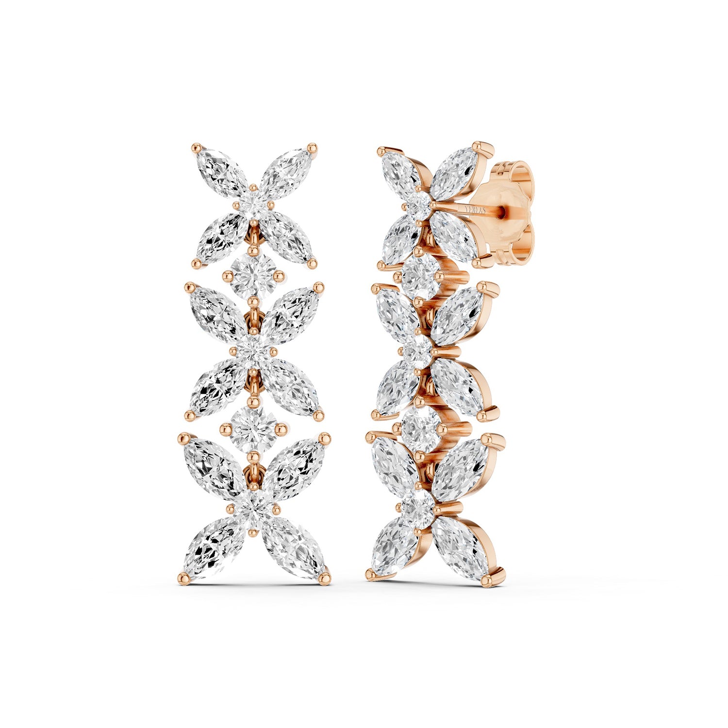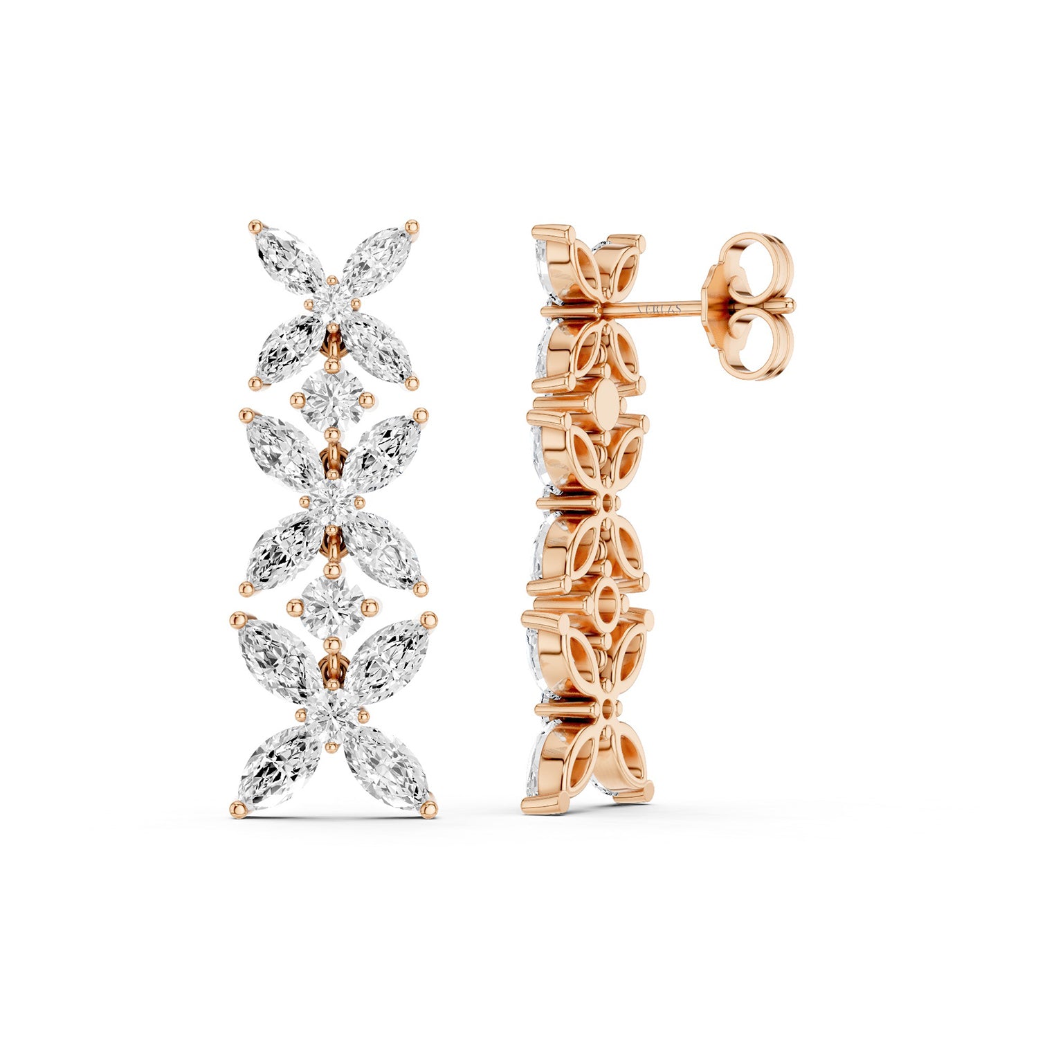 Experience the allure of sophisticated design with the Alyssa Tres Marquise Drop Earrings. These stunning diamond earrings feature three exquisite floral motifs, each crafted from marquise-cut diamonds that form elegant petals. Separated by radiant round lab-grown diamonds, the floral elements create a mesmerizing drop effect that captures the light beautifully. Each diamond is perfectly set, showcasing the intricate detailing and refined artistry of these diamond drop earrings. Perfect for making a statement, these drop earrings blend timeless elegance with modern sophistication.