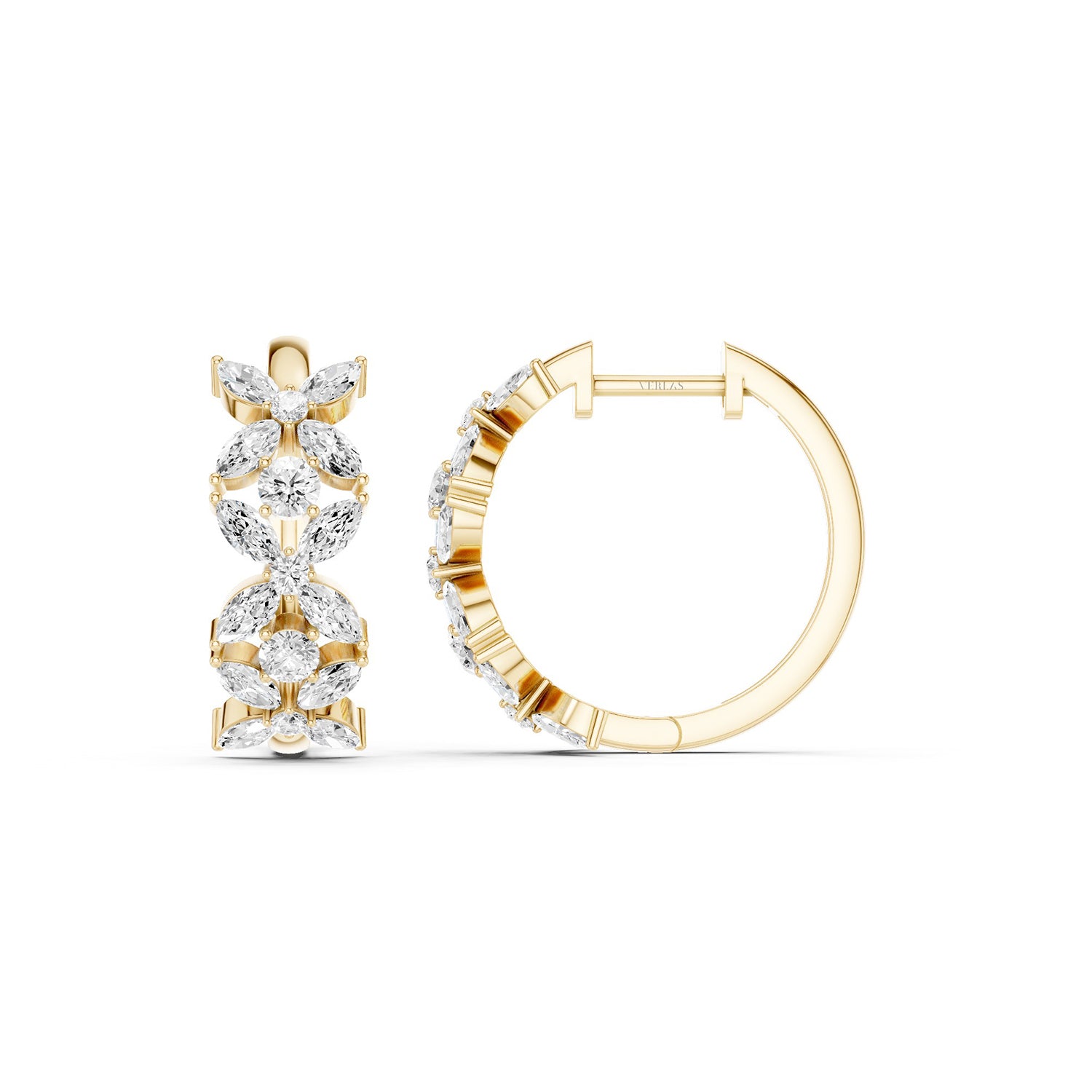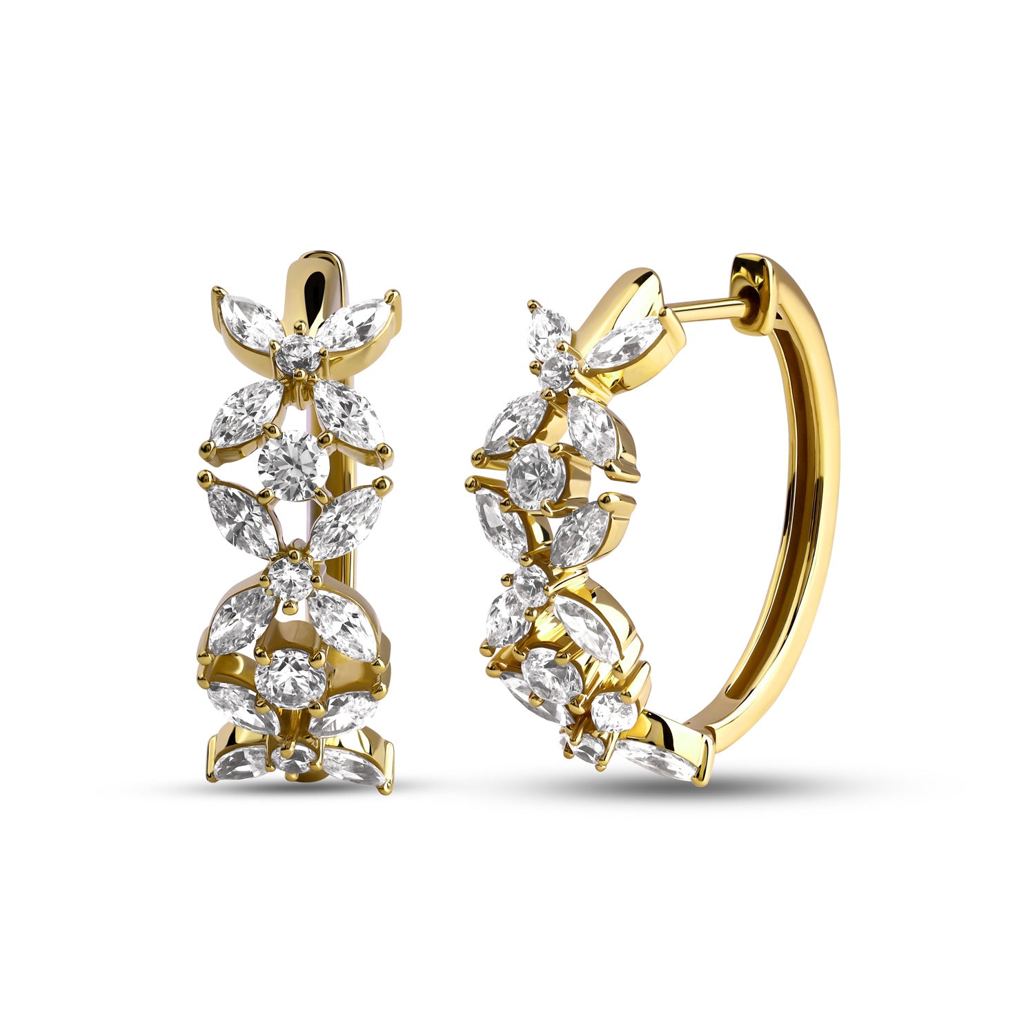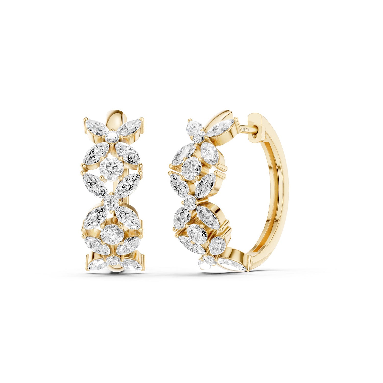 Embrace the radiant beauty of nature with the Alyssa Tres Marquise Huggies. These exquisite golden huggies feature three floral motifs. Each floret is intricately designed with four marquise diamonds, centered around and separated by a single diamond, capturing the essen. . . Read More