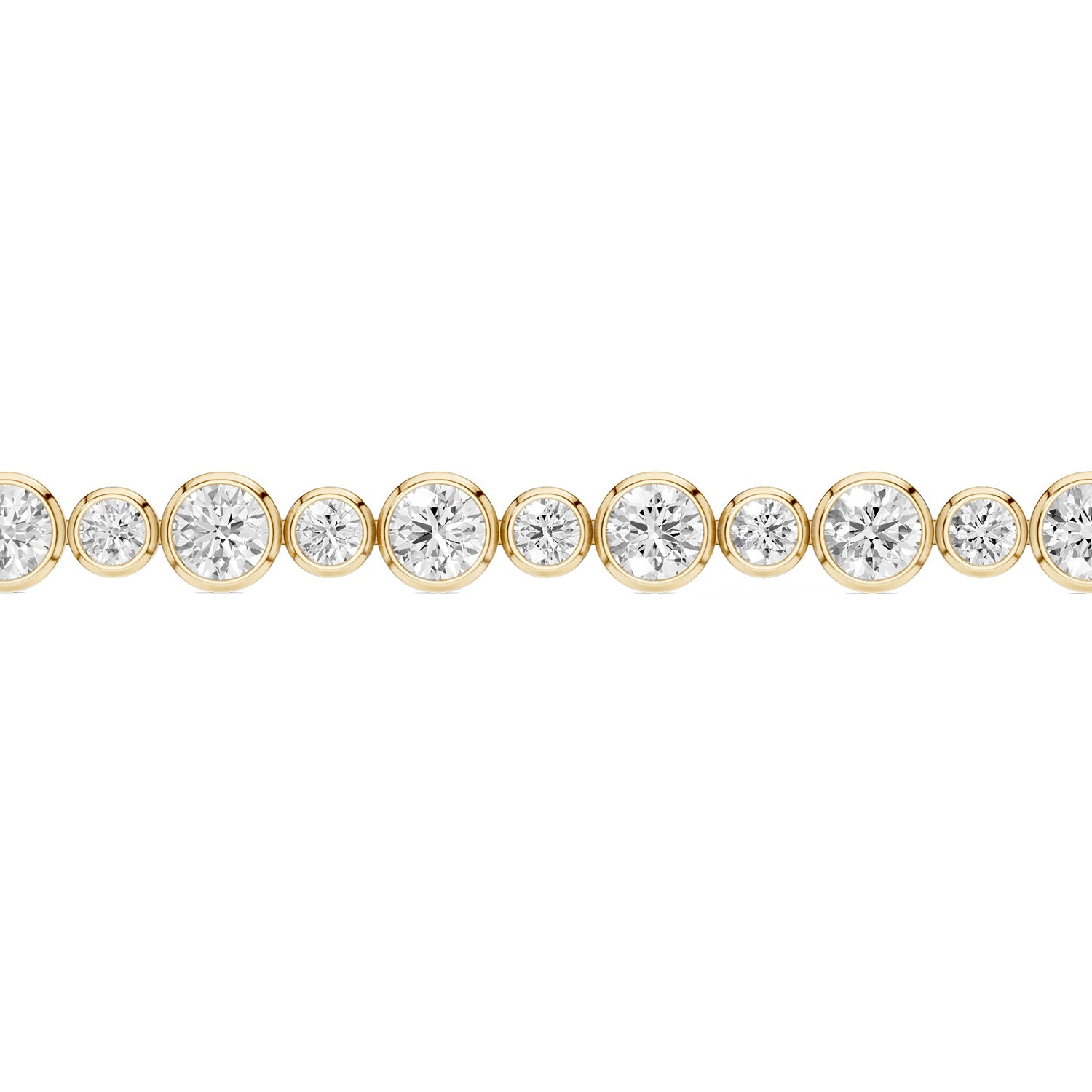 Add a touch of modern elegance to your jewelry collection with the Asymmetrical Bezel-Set Round Tennis Bracelet. This unique piece features a row of sparkling lab-grown diamonds, masterfully arranged in an alternating pattern of larger and smaller stones. The sleek bezel setting not only enhances each diamond’s brilliance but also provides a smooth, secure fit, perfect for daily wear or special occasions. The asymmetrical design adds an unexpected twist to the classic tennis bracelet, making it a stylish choice. Pair it with a matching bezel-set diamond necklace for a coordinated look, or stack it with your favorite bangles for a chic, layered vibe.