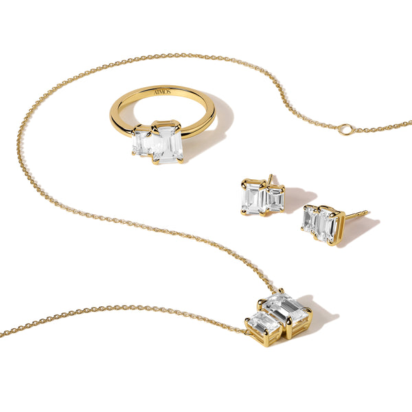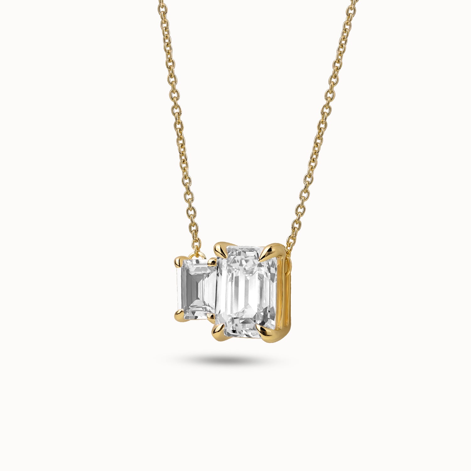 This two stone necklace features one large and one small emerald-cut diamond set within solid gold prongs on a delicate chain necklace. The differing sizes remind you of the growth you have achieved and the steps you have taken to get there. This lab-grown diamond necklace has the elegance and allure that will bolster any wardrobe.