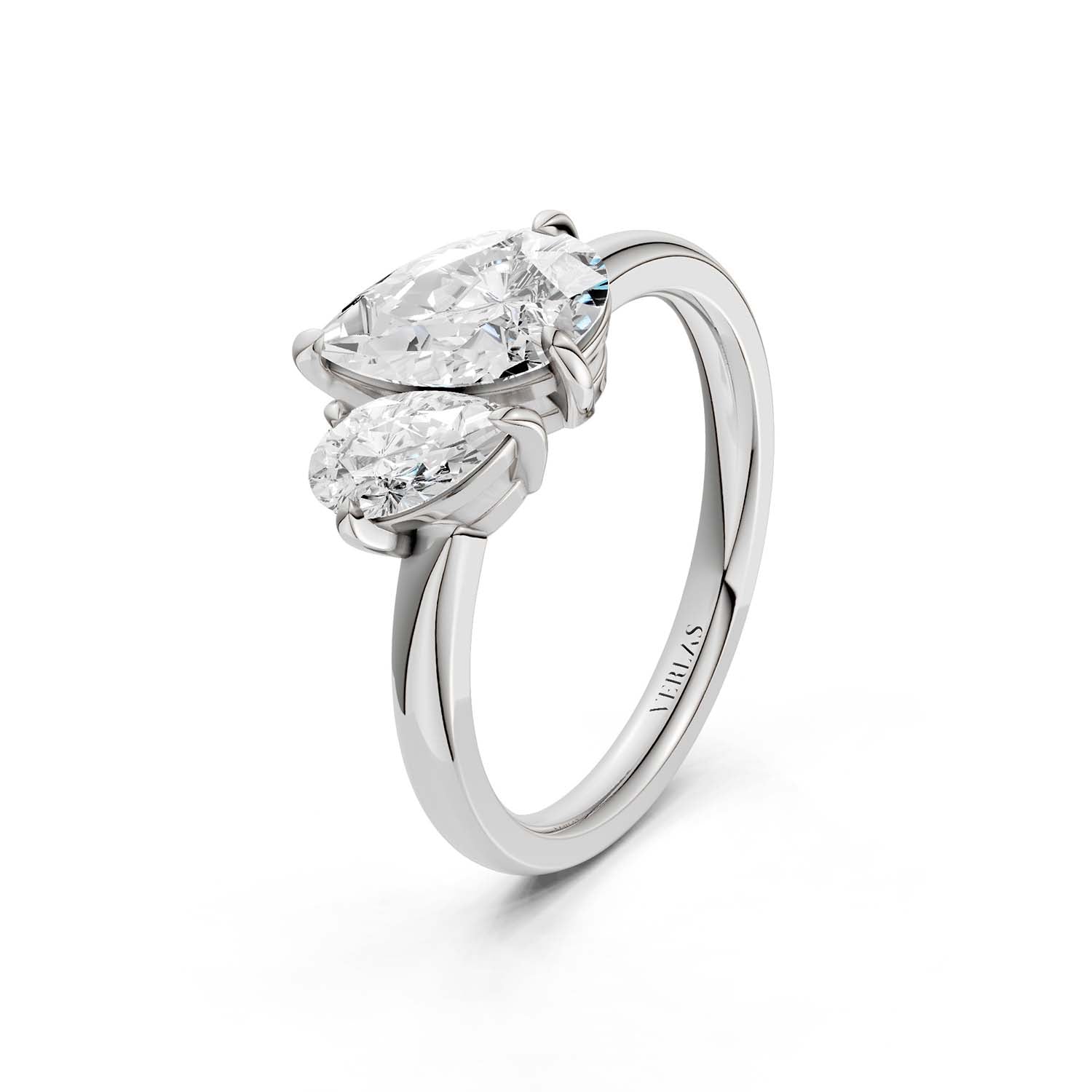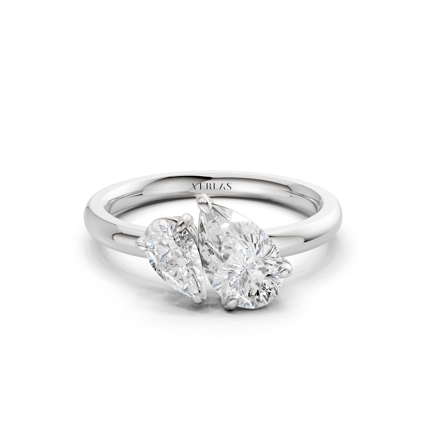 Crafted with love, this Toi et Moi ring showcases two asymmetrical pear-shaped diamonds, representing the beautiful imperfections and unique qualities that make every relationship extraordinary. Nestled delicately upon a shimmering gold shank, these pear diamonds share a harmonious space, symbolizing the intricate dance of love and companionship.