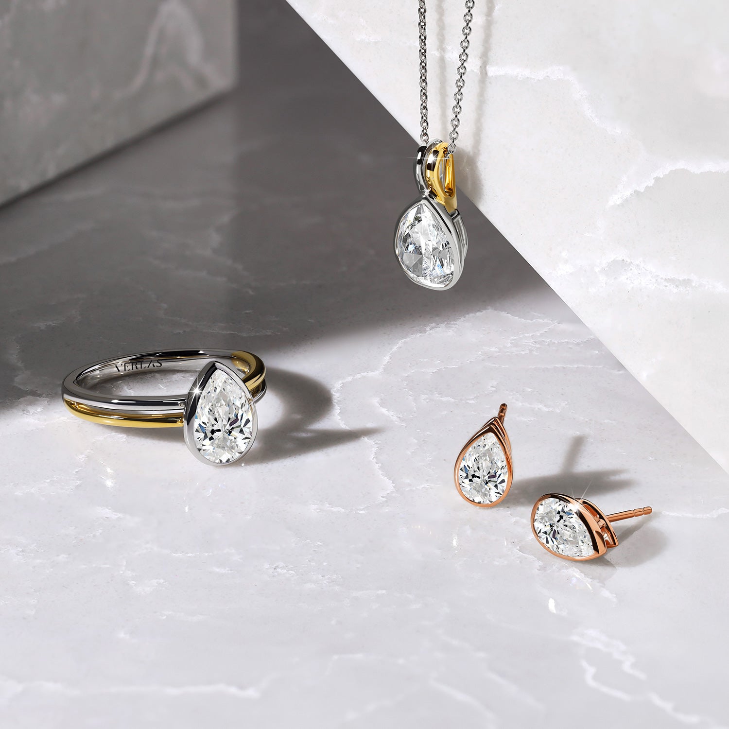Cubic Zirconia (CZ) simulates the beauty of a diamond but differs drastically in its quality and value. Your Try-at-Home replica jewelry is made with CZ to mimic the beauty of real jewelry at a fraction of a cost so you can feel confident in knowing what your real Verlas jewelry will look like.