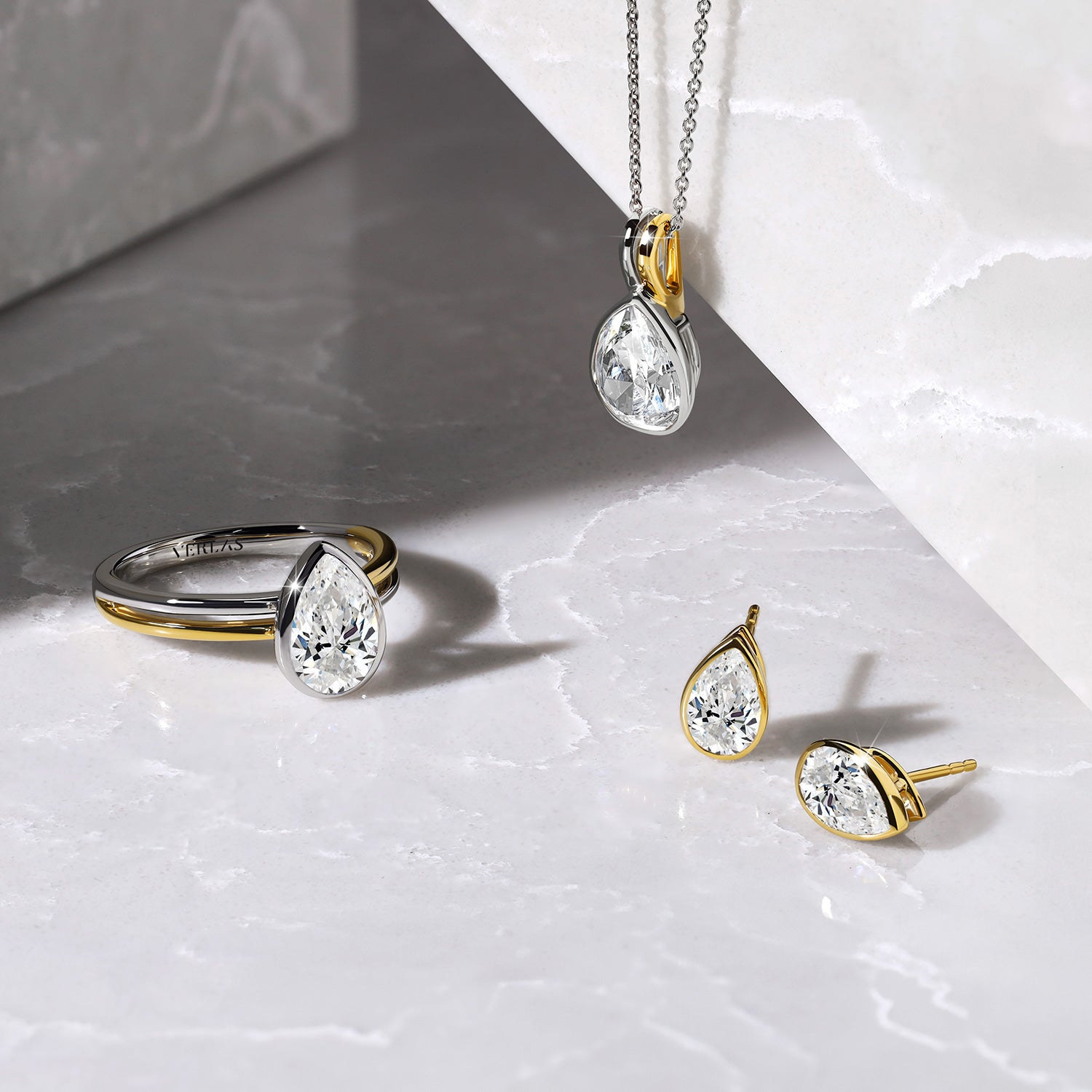 Cubic Zirconia (CZ) simulates the beauty of a diamond but differs drastically in its quality and value. Your Try-at-Home replica jewelry is made with CZ to mimic the beauty of real jewelry at a fraction of a cost so you can feel confident in knowing what your real Verlas jewelry will look like.
