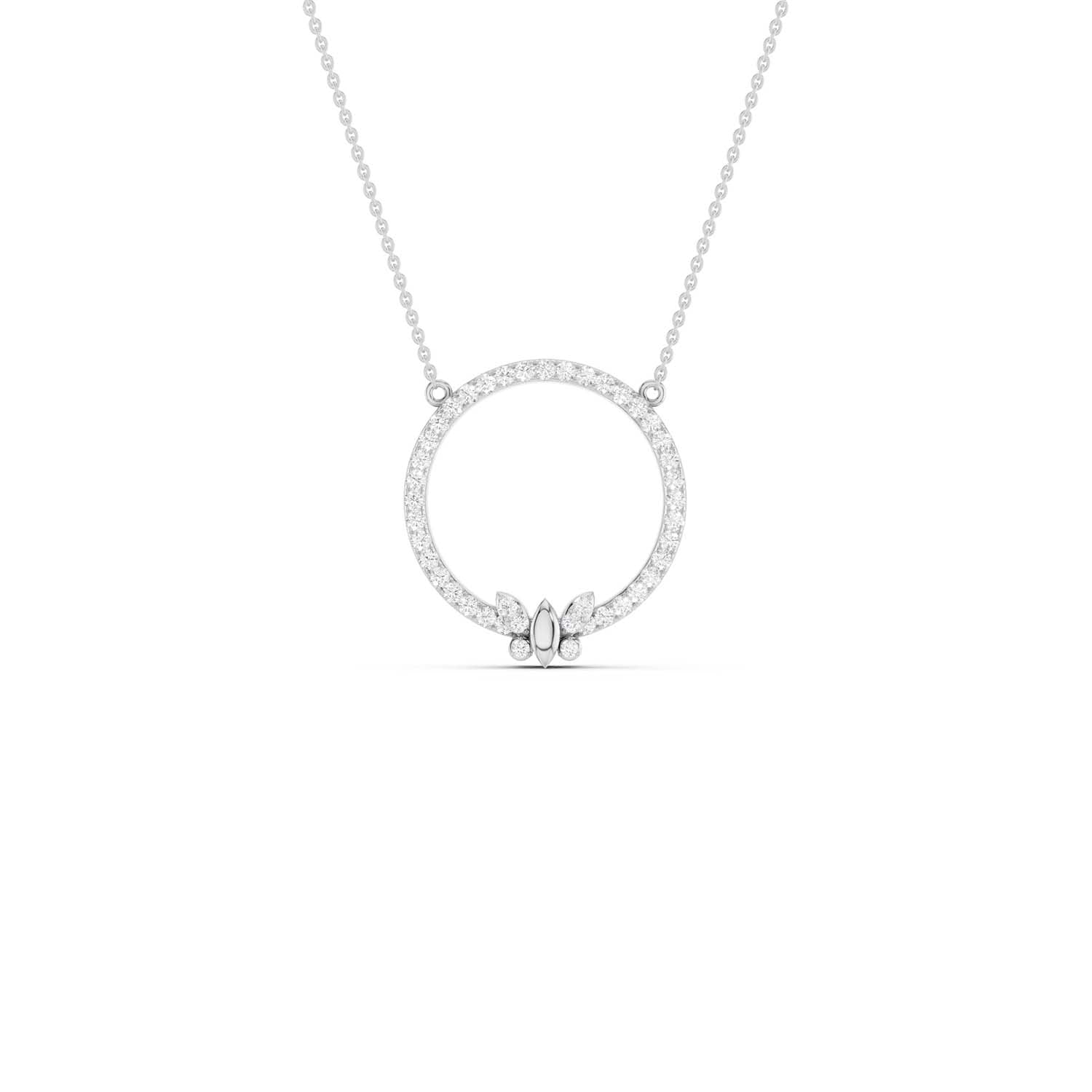 Crafted with love, the Butterfly Circular Silhouette Pendant boasts a flawless circular silhouette, adorned with a dazzling array of brilliant diamonds. A delicate butterfly motif graces its center adding a touch of elegance to it. This diamond necklace design is a symbol of love and care, making it the perfect gift for someone truly special.