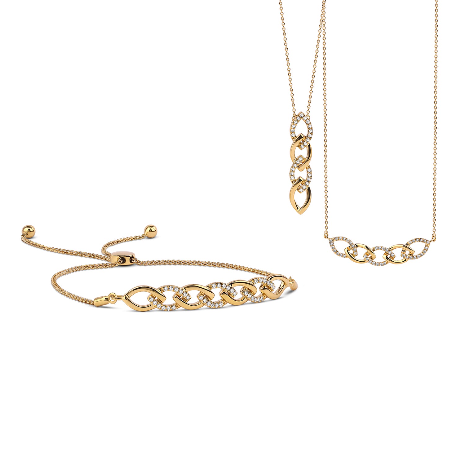Symbolizing deeper connections, Le Bon by Verlas celebrates enduring links of love. This diamond jewelry collection captures the warmth of relationships with radiant gold links set with sparkling diamonds. Its minimal design conveys soft elegance and sophistication from every angle. Stunning, scintillating, and swaying its way into your heart, this collection offers a wide array of earrings, rings, necklaces, and bracelets. Create your personalised linked ensemble with