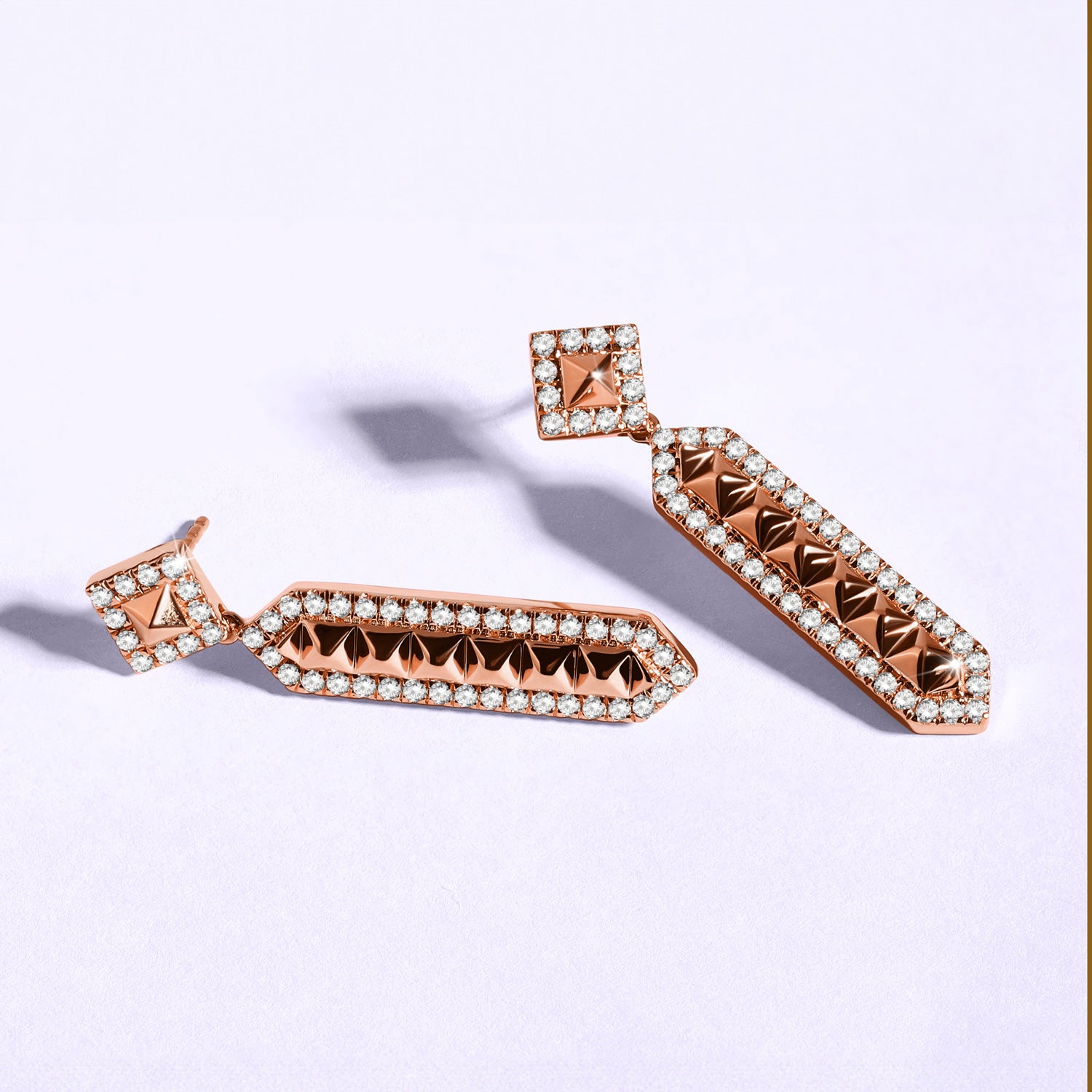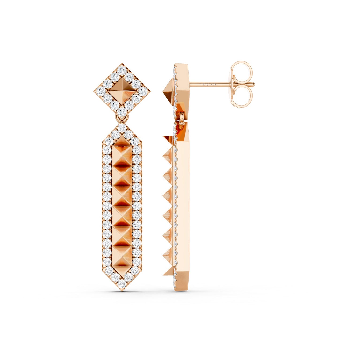 Introducing the Cascading Pyramid Drop Earrings, a modern masterpiece designed for those who appreciate architectural elegance. Featuring striking three-dimensional pyramid motifs, these earrings exude a bold, geometric allure. The pyramids are framed by radiant, ethically sourced lab-grown diamonds, adding a layer of sophistication and sparkle. The design showcases a smaller rectangular stud that anchors the earrings, leading to a larger, statement-making rectangular drop. These diamond earrings are perfect for elevating any look, combining cutting-edge style with timeless luxury.