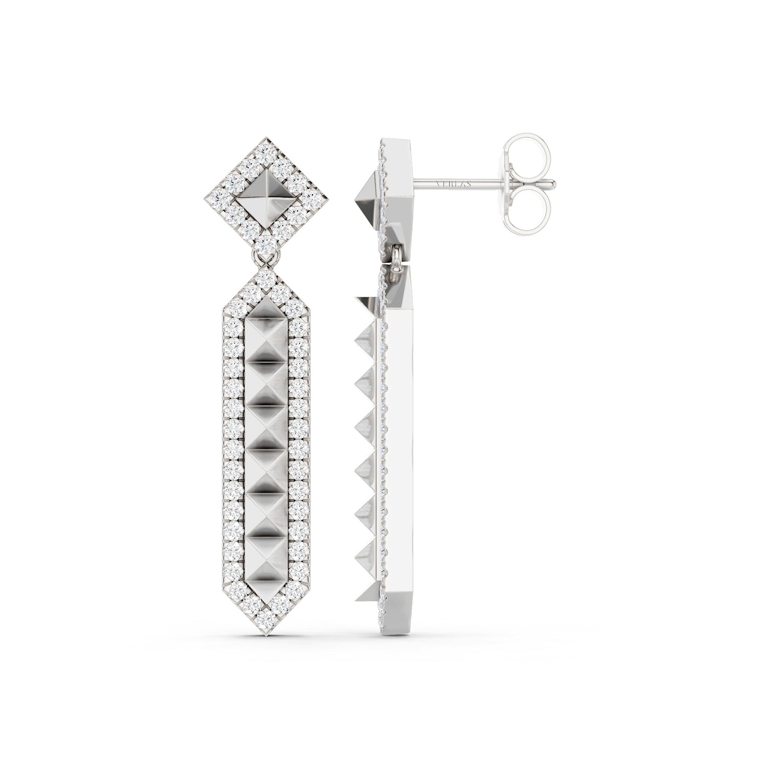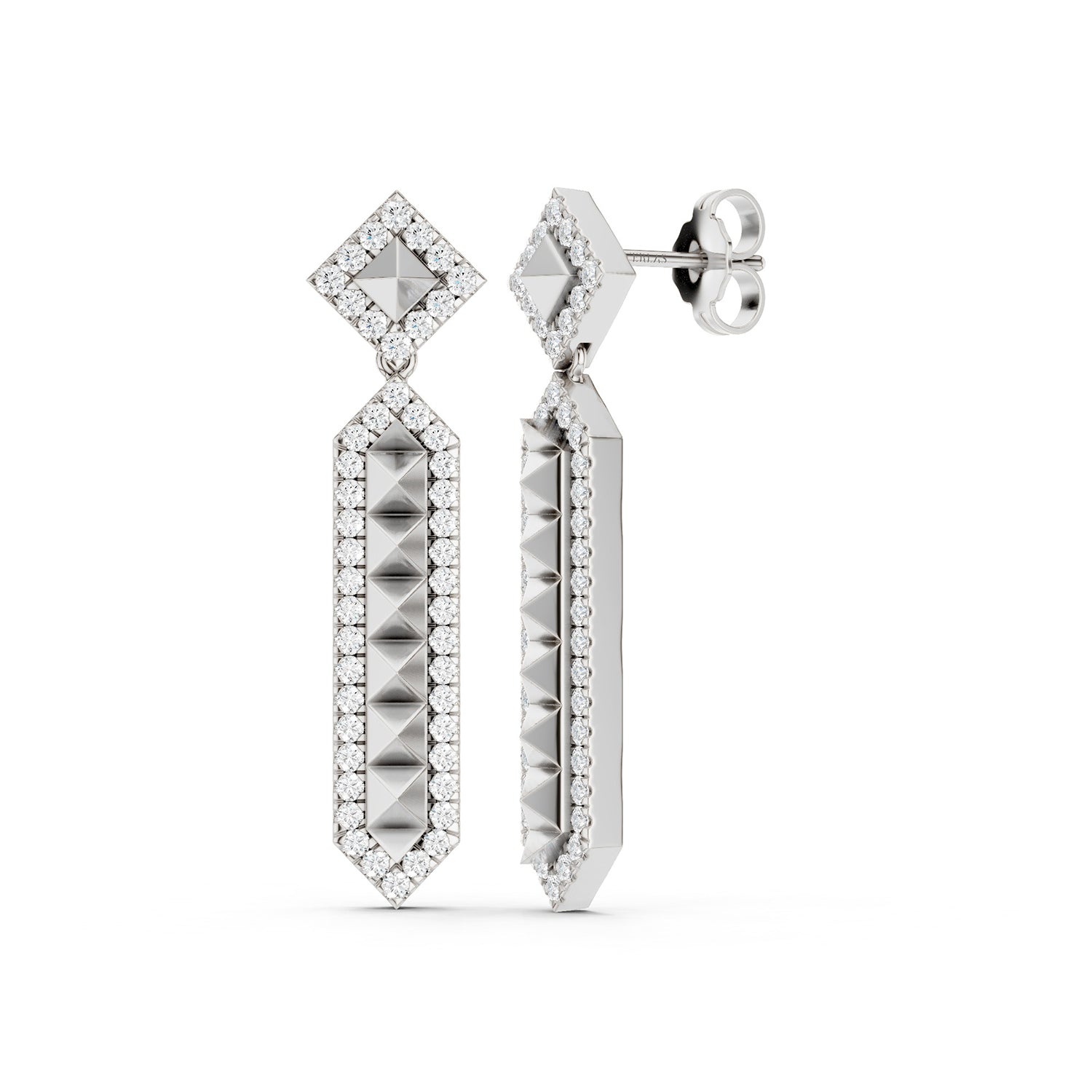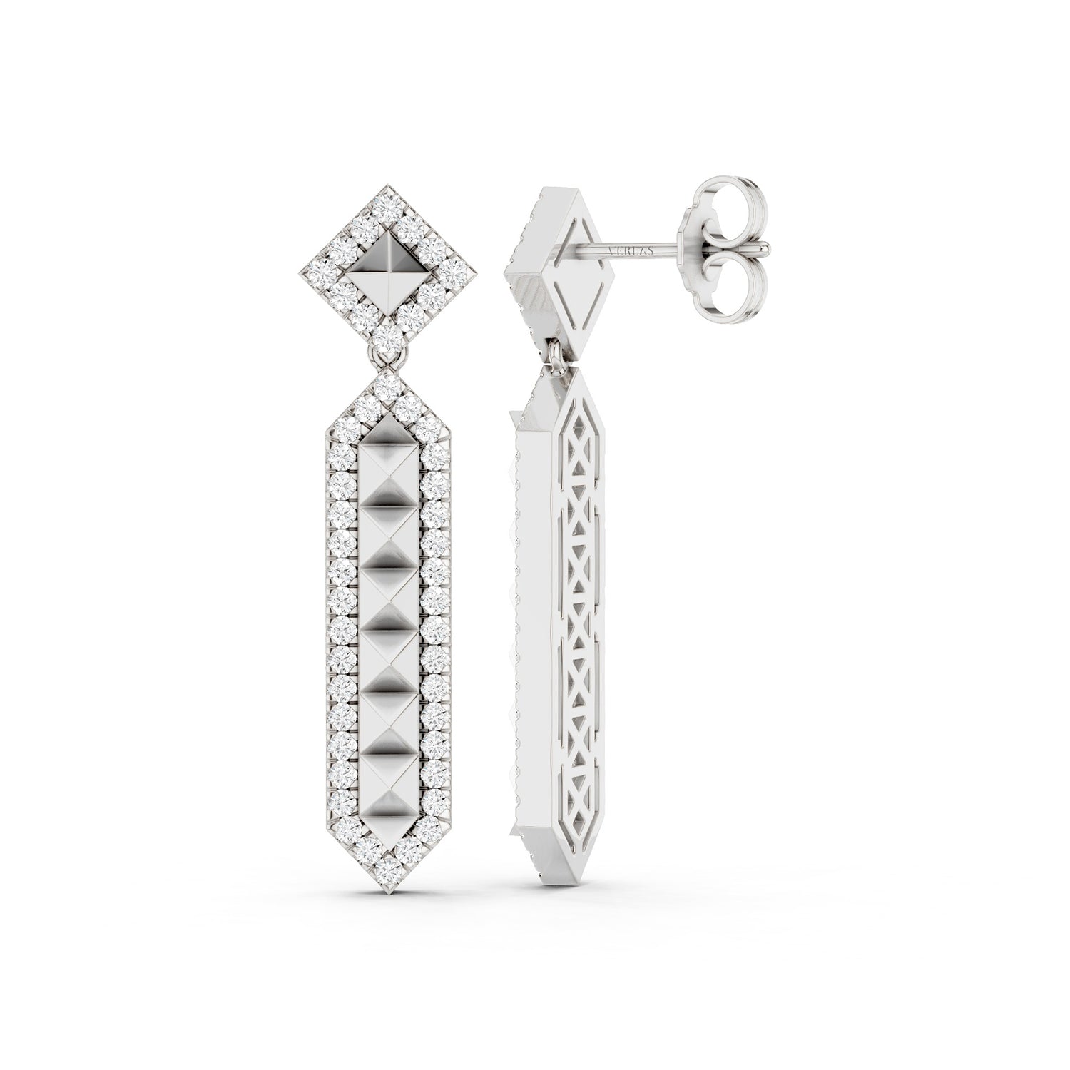 Introducing the Cascading Pyramid Drop Earrings, a modern masterpiece designed for those who appreciate architectural elegance. Featuring striking three-dimensional pyramid motifs, these earrings exude a bold, geometric allure. The pyramids are framed by radiant, ethically sourced lab-grown diamonds, adding a layer of sophistication and sparkle. The design showcases a smaller rectangular stud that anchors the earrings, leading to a larger, statement-making rectangular drop. These diamond earrings are perfect for elevating any look, combining cutting-edge style with timeless luxury.