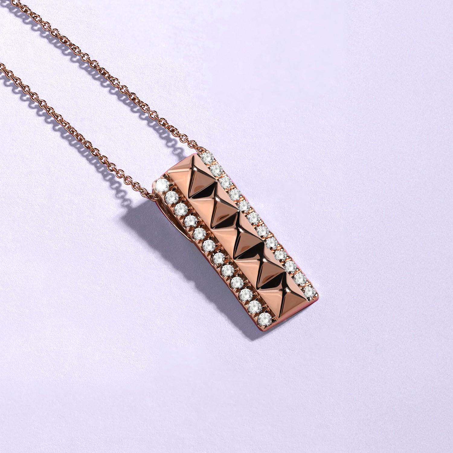 Step into the spotlight with our Cascading Pyramid Pendant Necklace, featuring five mesmerizing pyramid shapes, skillfully crafted and encrusted with shimmering lab-grown pave diamonds that capture and reflect light with every movement. The elegant pyramid design adds a dynamic flair, making them ideal for any occasion—from intimate gatherings to grand celebrations. Lightweight and comfortable, this diamond pendant necklace is designed for effortless wear, ensuring it stays securely in place while you dance the night away. Pair it with a sleek gown for a sophisticated evening look or dress up a casual ensemble for brunch with friends.