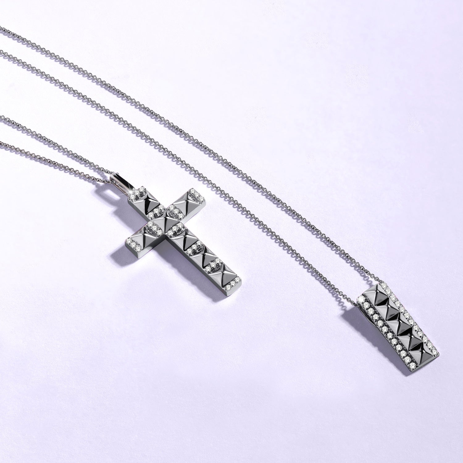 Step into the spotlight with our Cascading Pyramid Pendant Necklace, featuring five mesmerizing pyramid shapes, skillfully crafted and encrusted with shimmering lab-grown pave diamonds that capture and reflect light with every movement. The elegant pyramid design adds a dynamic flair, making them ideal for any occasion—from intimate gatherings to grand celebrations. Lightweight and comfortable, this diamond pendant necklace is designed for effortless wear, ensuring it stays securely in place while you dance the night away. Pair it with a sleek gown for a sophisticated evening look or dress up a casual ensemble for brunch with friends.