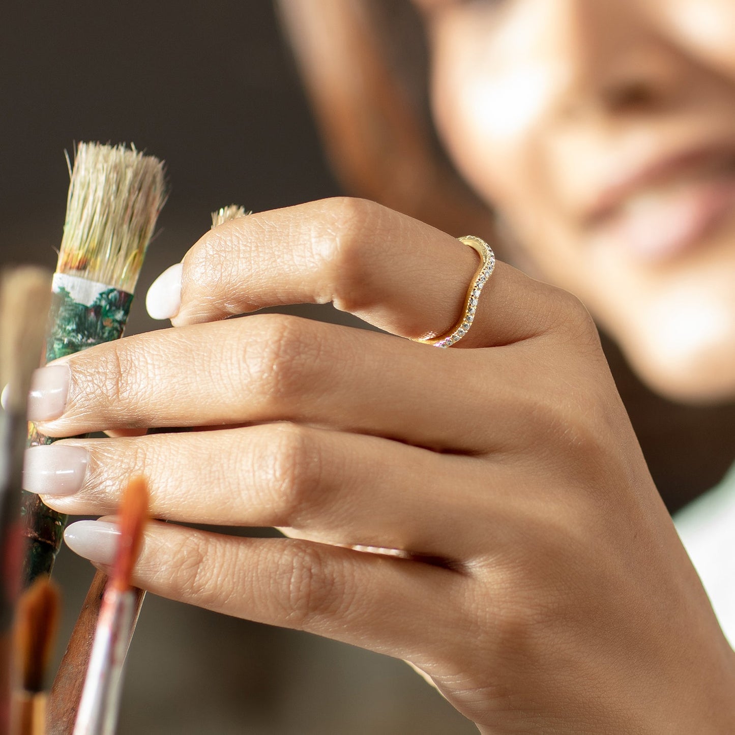 Adorn your finger with this lustrous lab-grown diamond ring that indeed makes for a modern statement piece. The brilliant round cut lab-grown diamonds running across the band for maximum sparkle create a scintillating chevron shape in 14k/18k gold.
