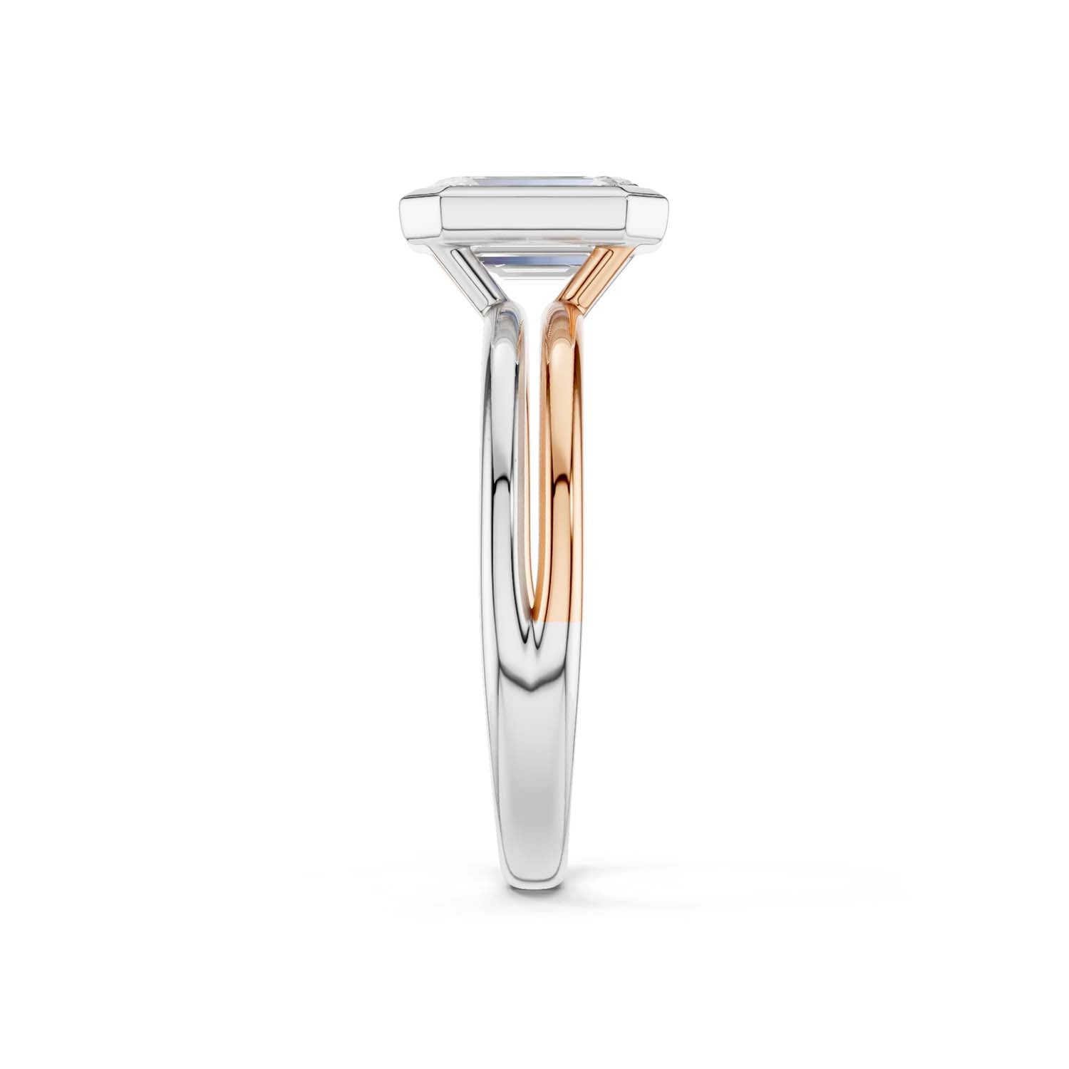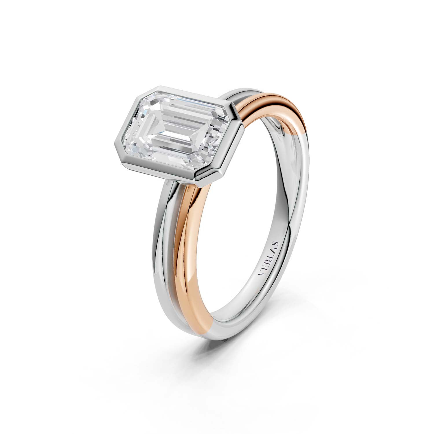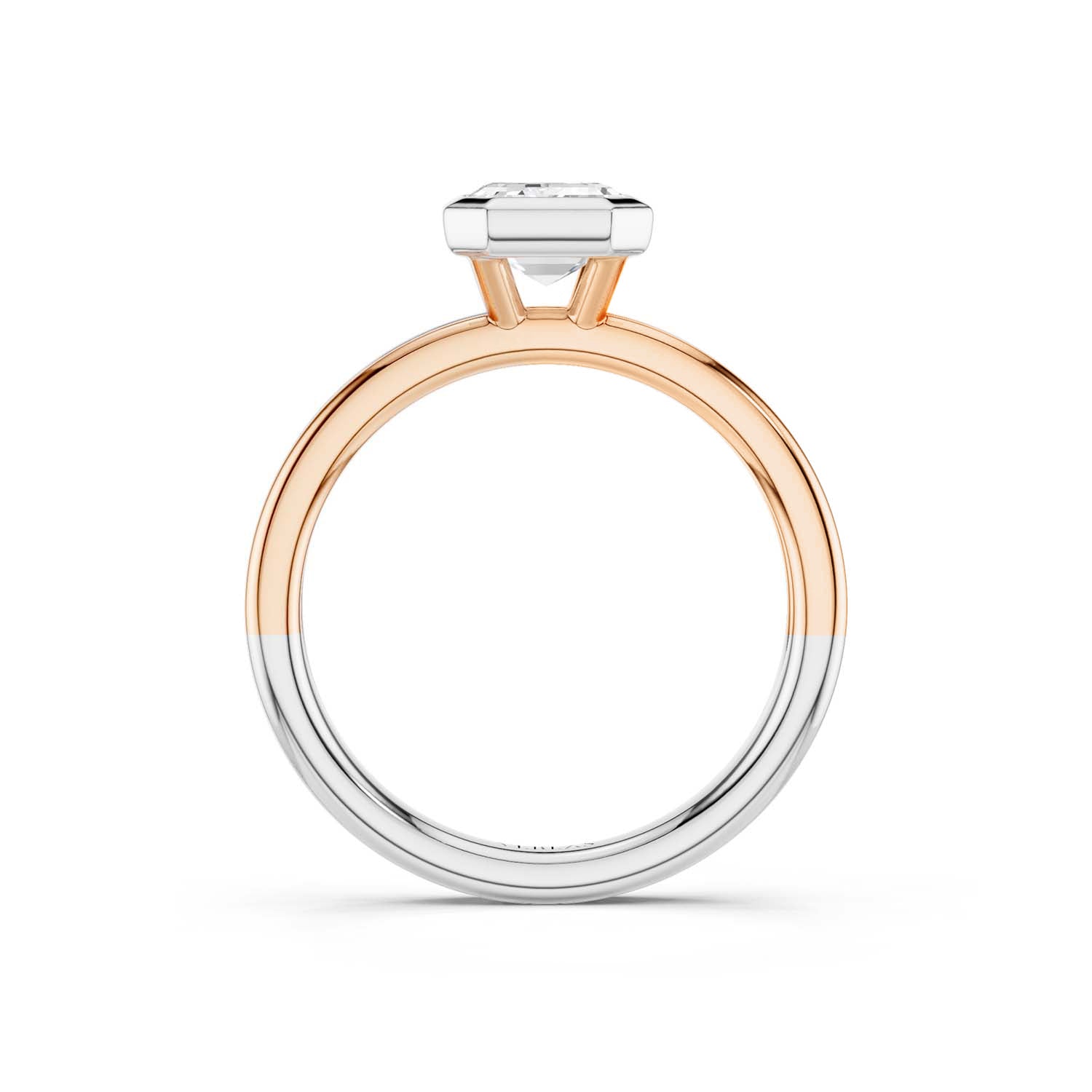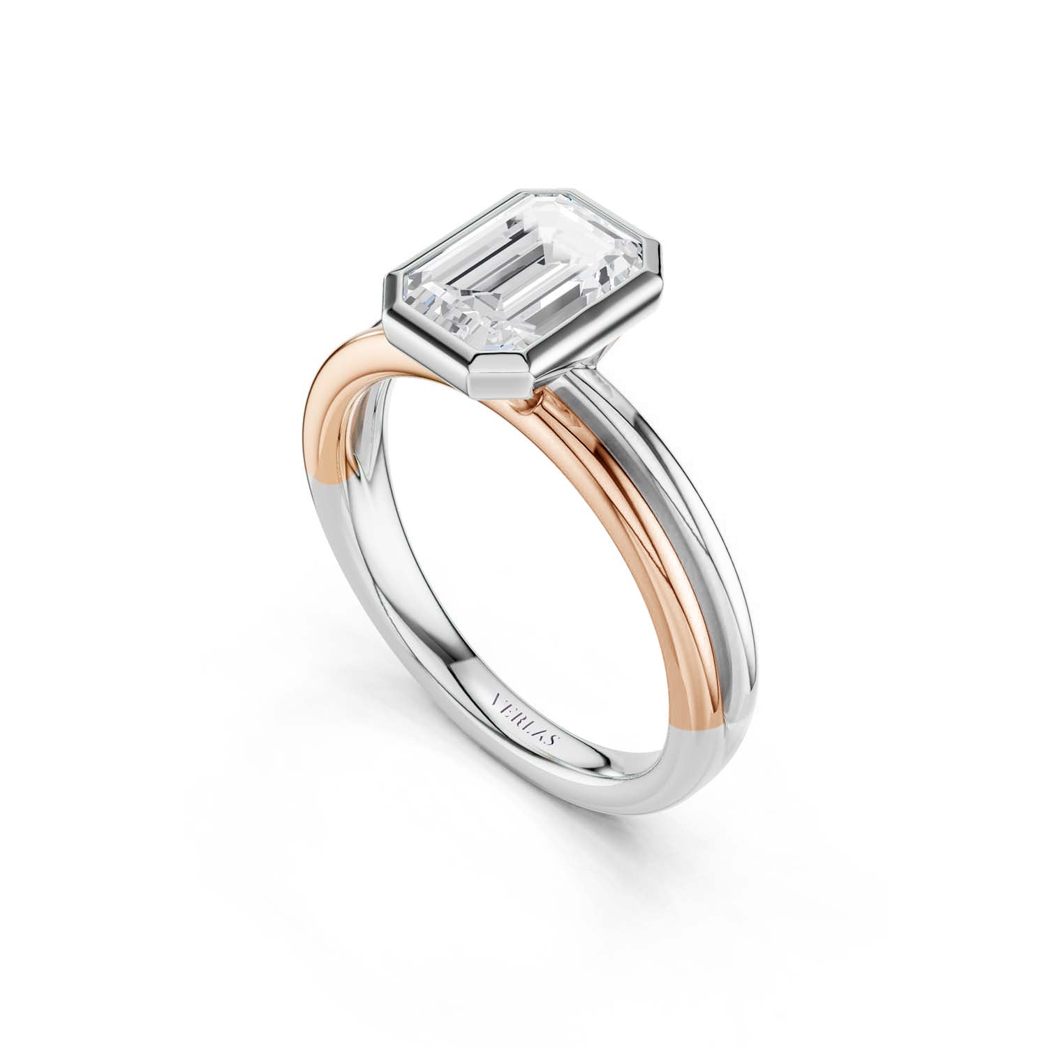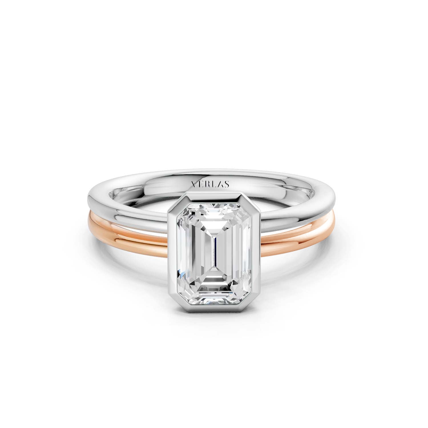 Embrace everlasting love with our Coupled Pear Bezel Ring. At its heart lies a brilliant, lab-grown emerald-shaped diamond delicately nestled within a unique dual-band design. The diamond band combination gleams in radiant white and yellow gold, while the other exudes warmth in white and rose gold, adding a personalized touch. This solitaire engagement ring is ideal for marking special moments. Also available in the all-white gold setting.