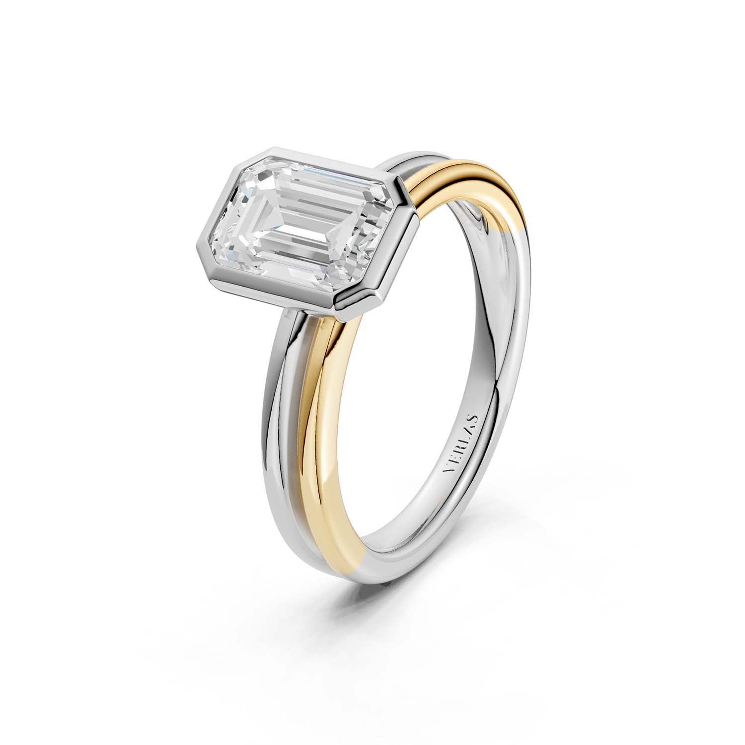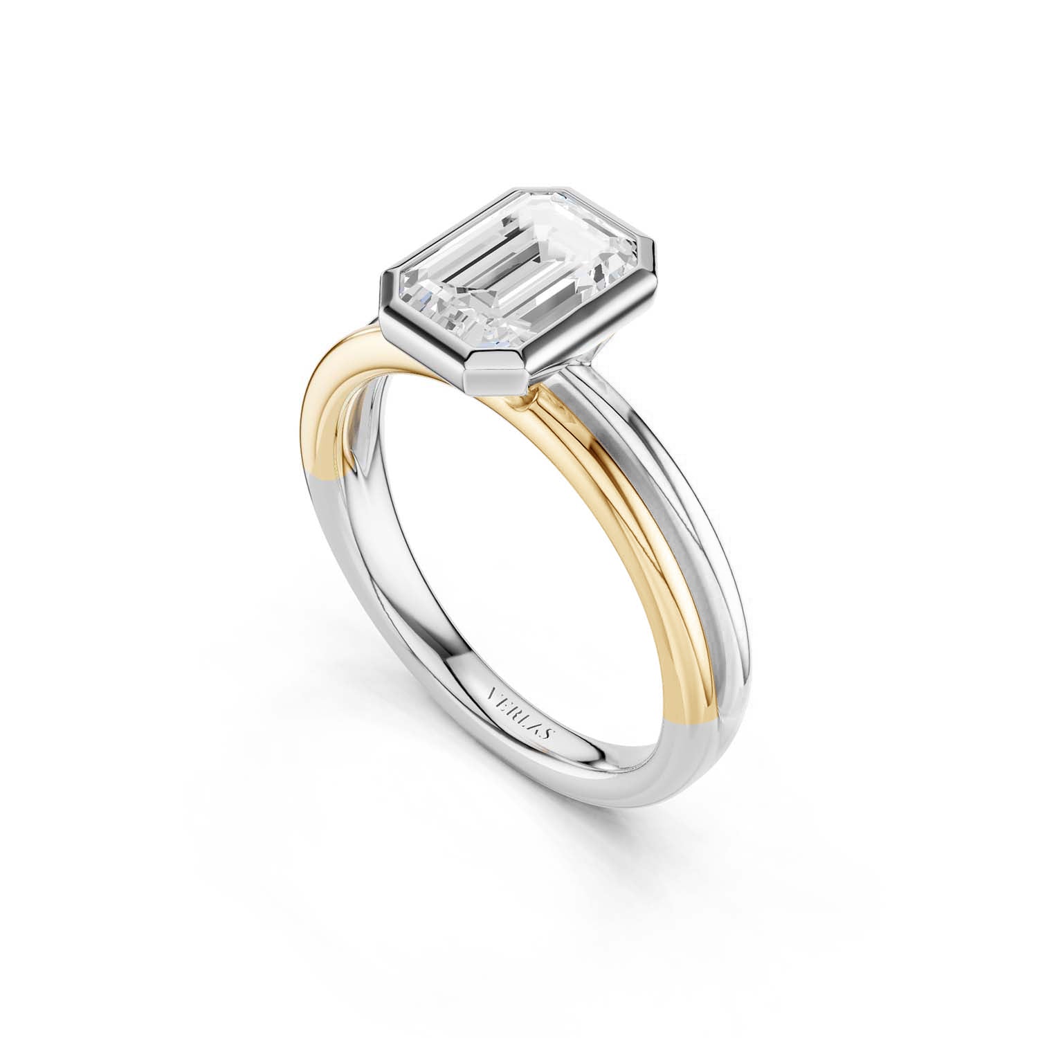 Embrace everlasting love with our Coupled Pear Bezel Ring. At its heart lies a brilliant, lab-grown emerald-shaped diamond delicately nestled within a unique dual-band design. The diamond band combination gleams in radiant white and yellow gold, while the other exudes warmth in white and rose gold, adding a personalized touch. This solitaire engagement ring is ideal for marking special moments. Also available in the all-white gold setting.