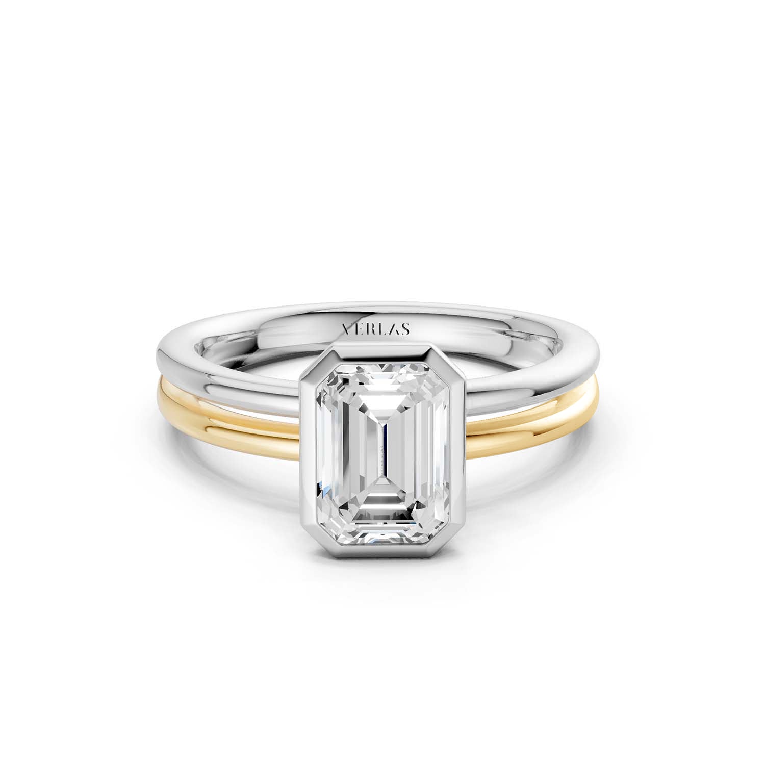 Embrace everlasting love with our Coupled Pear Bezel Ring. At its heart lies a brilliant, lab-grown emerald-shaped diamond delicately nestled within a unique dual-band design. The diamond band combination gleams in radiant white and yellow gold, while the other exudes warmth in white and rose gold, adding a personalized touch. This solitaire engagement ring is ideal for marking special moments. Also available in the all-white gold setting.