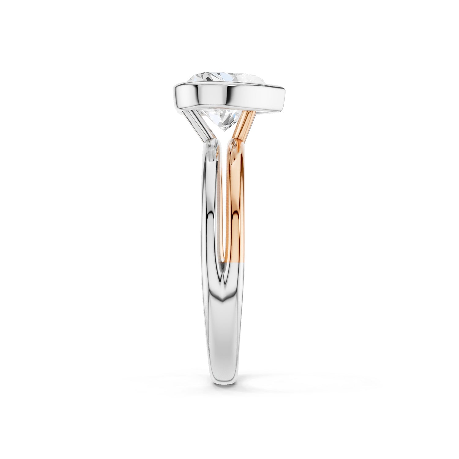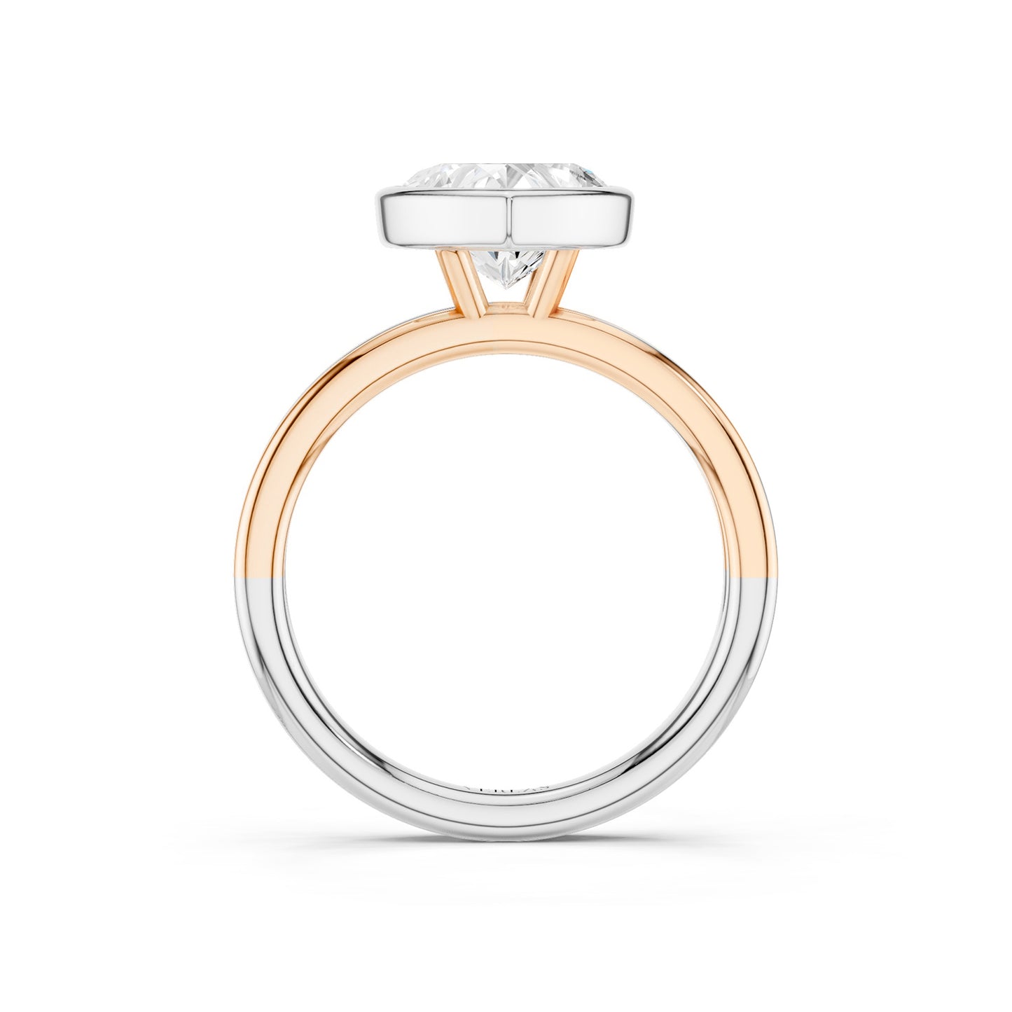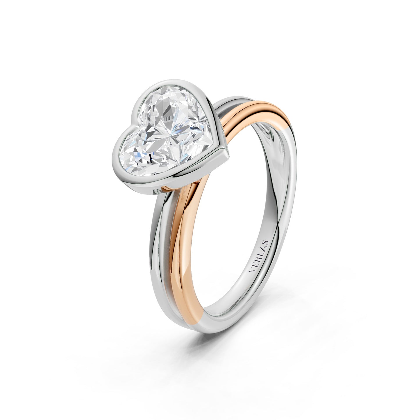 Introducing our Coupled Heart Bezel Ring—a timeless symbol of love and devotion. This exquisite solitaire ring showcases a lab-grown, heart-shaped diamond set in a sleek bezel setting, creating a captivating focal point. The unique dual-band design offers a striking contrast with white and yellow gold options or a romantic blend of white and rose gold, perfectly framing the diamond’s radiant sparkle. Whether it’s a heartfelt engagement or a cherished anniversary, this diamond ring seamlessly combines classic elegance with a contemporary twist, making it an unforgettable statement of commitment.