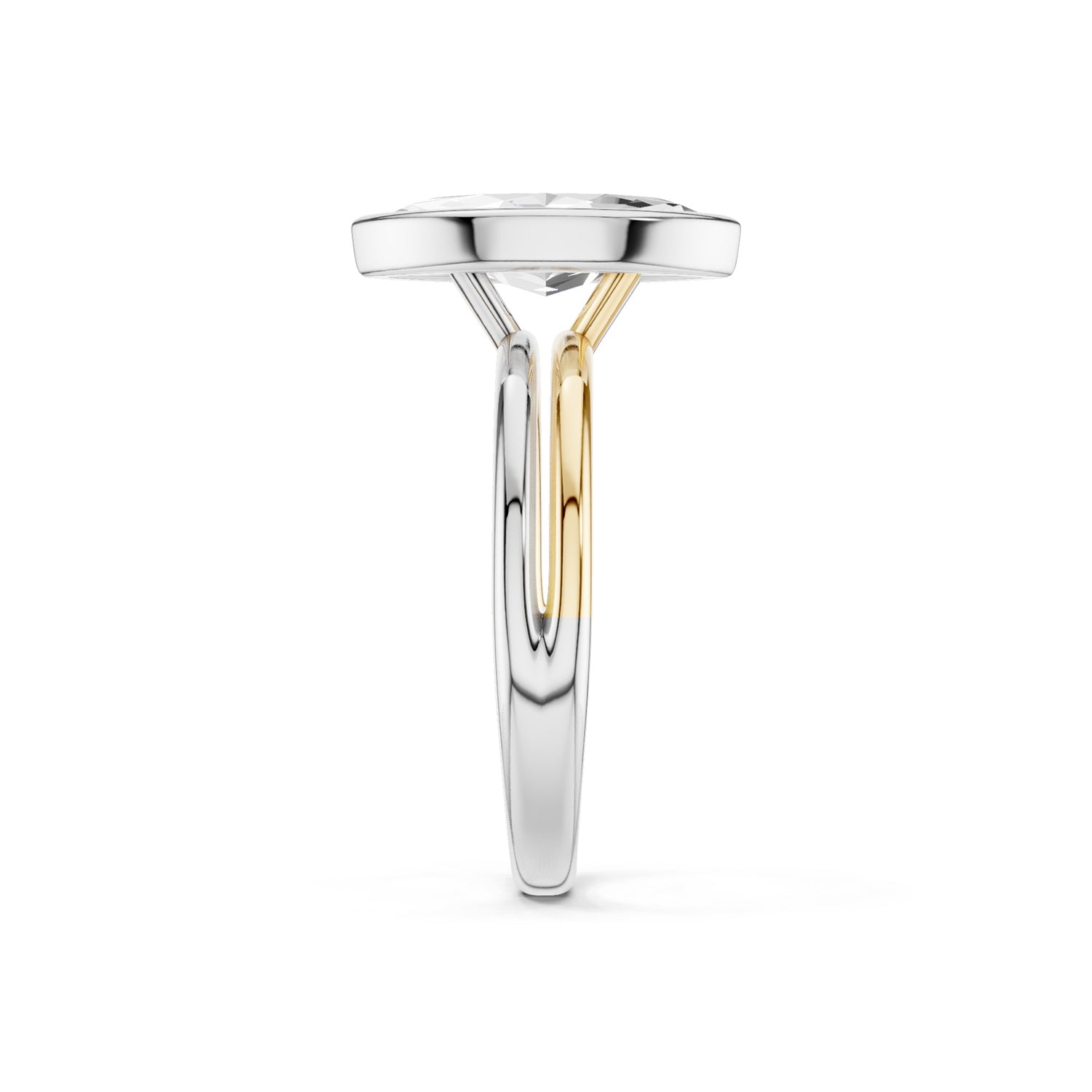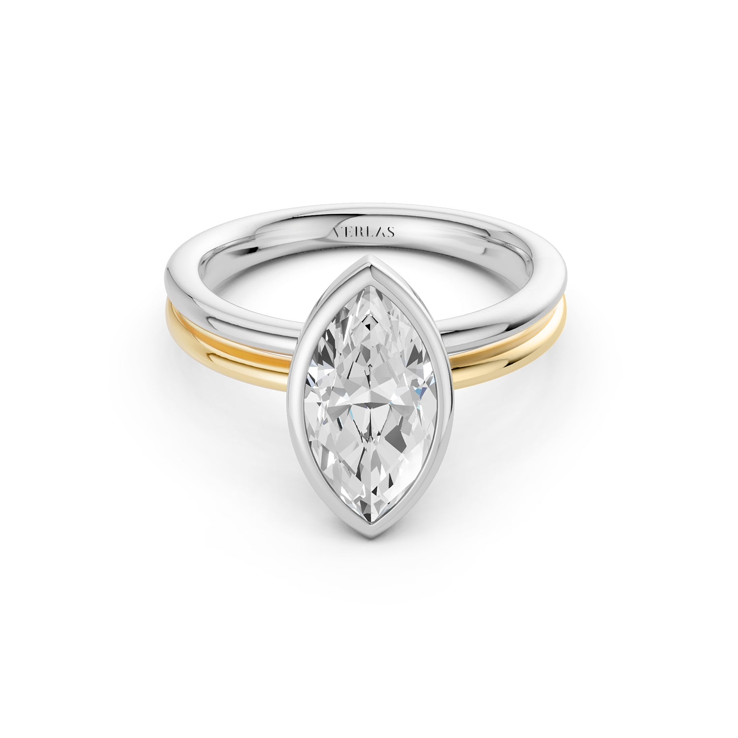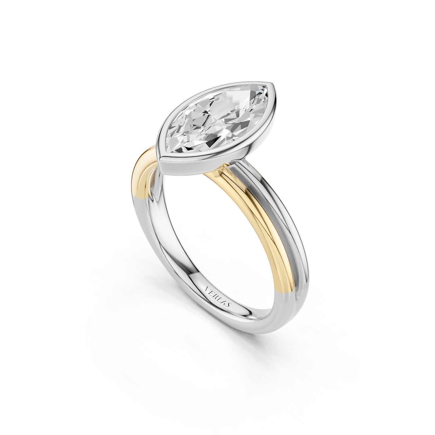 Our Coupled Marquise Bezel Ring is a captivating symbol of love and elegance, reimagined for those seeking modern sophistication. This exquisite solitaire ring showcases a bezel-set, lab-grown marquise-cut diamond, celebrated for its elongated, eye-catching shape that sparkles brilliantly from every angle. The ring features a unique dual-band design, available in a choice of lustrous white and yellow gold or the romantic pairing of white and rose gold, creating a striking contrast that enhances the diamond's radiance.