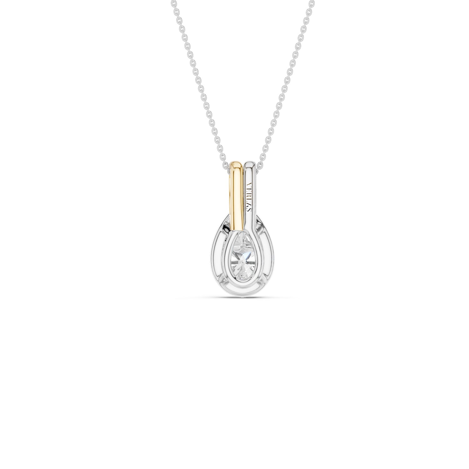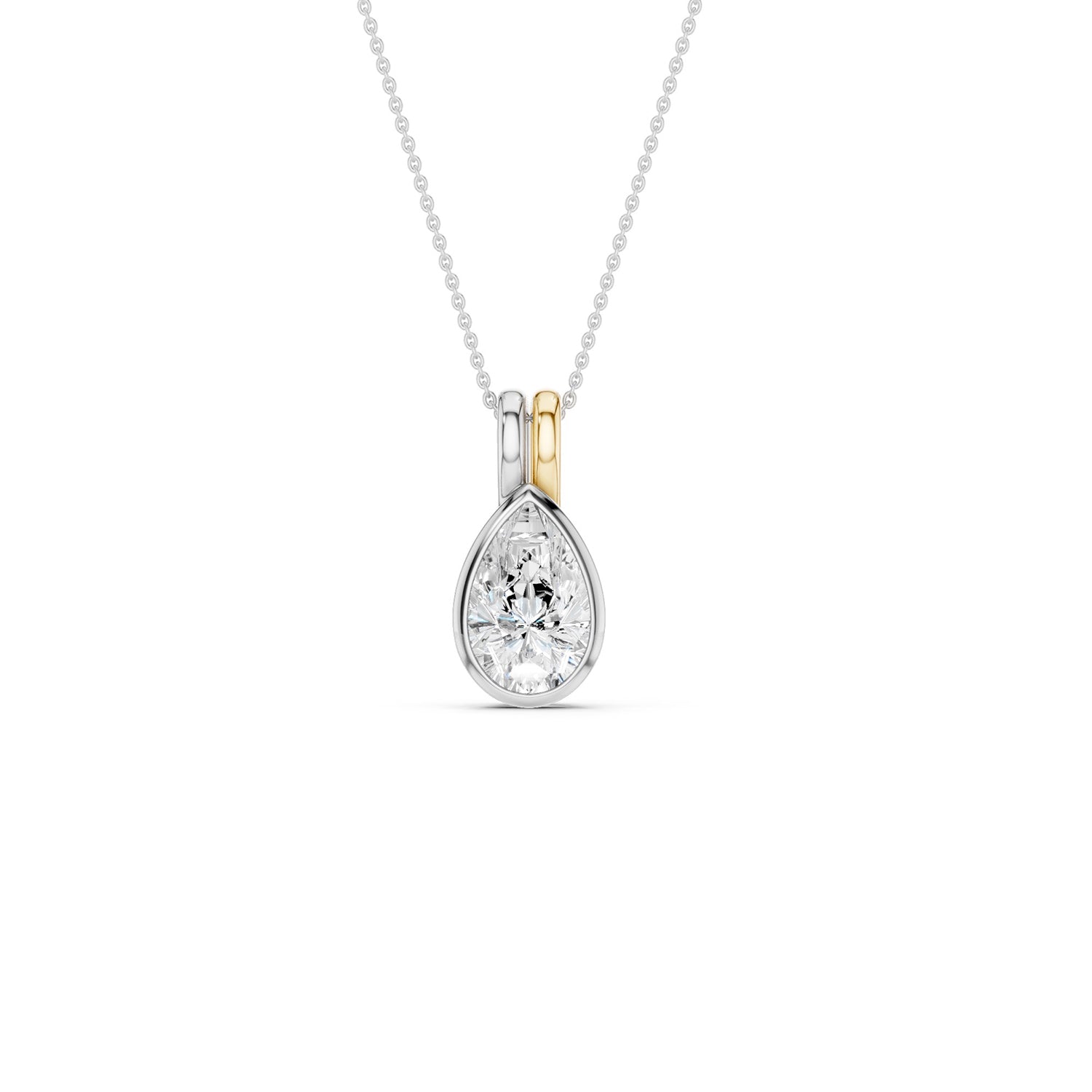 Introducing our Coupled Pear Bezel Necklace, which features a stunning bezel-set pear-shaped lab-grown diamond crafted with precision and care. What sets this diamond necklace apart is its unique double bail design, where two bails run parallel to each other. Crafted in a blend of white and rose gold as well as white and yellow gold, the bails add a touch of modern sophistication to the classic solitaire pendant. Whether worn casually or for a special occasion, this necklace effortlessly combines timeless beauty with contemporary style.