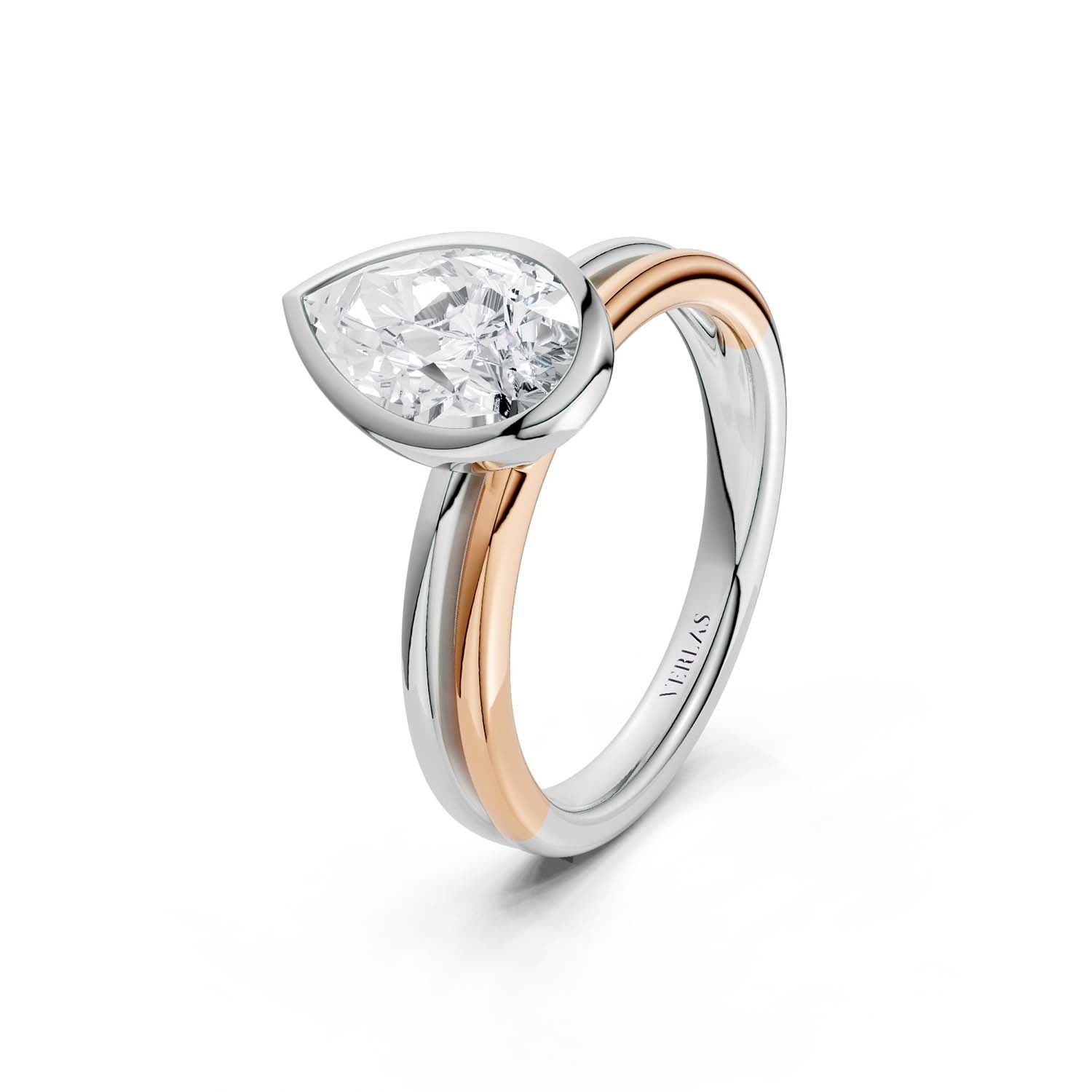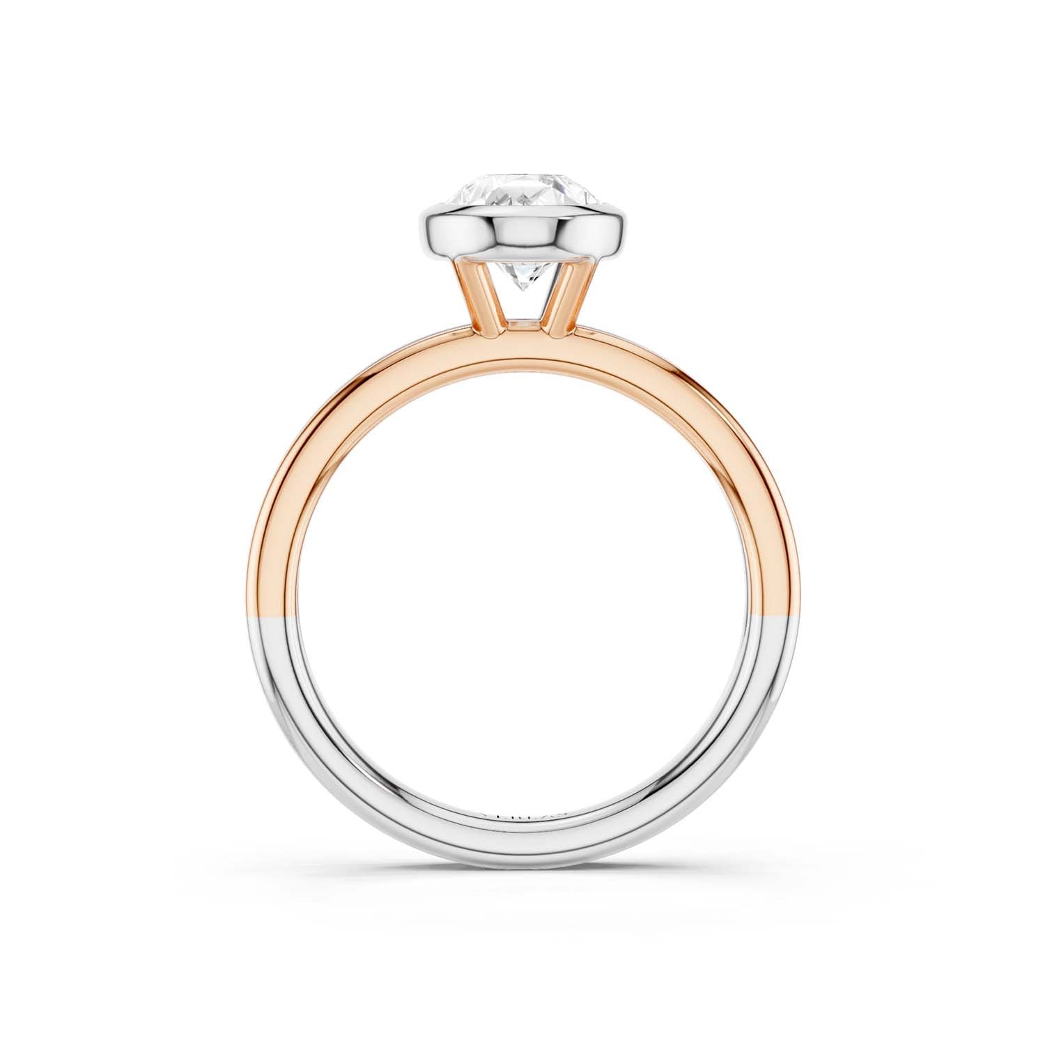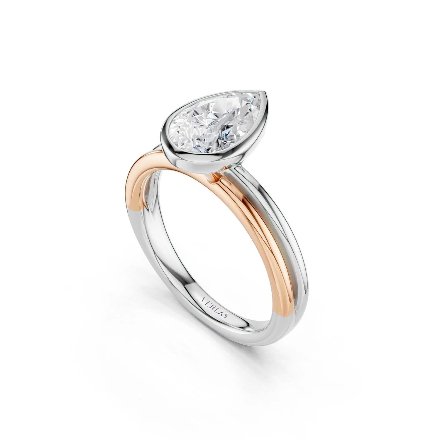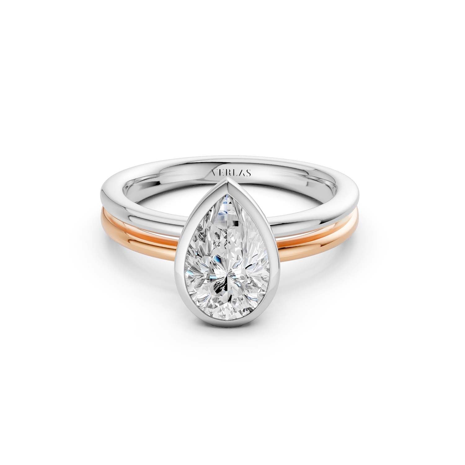 Celebrate love and timeless elegance with our Coupled Pear Bezel Ring, a stunning choice for engagements and anniversaries. Nestled within a unique dual-band design, this solitaire diamond ring features a bezel-set pear-shaped diamond exquisitely crafted to radiate brilliance. Choose between dual bands of pristine white and rose gold or the charming white and yellow gold combination tailored to complement your style. Also available in the all-white gold setting.