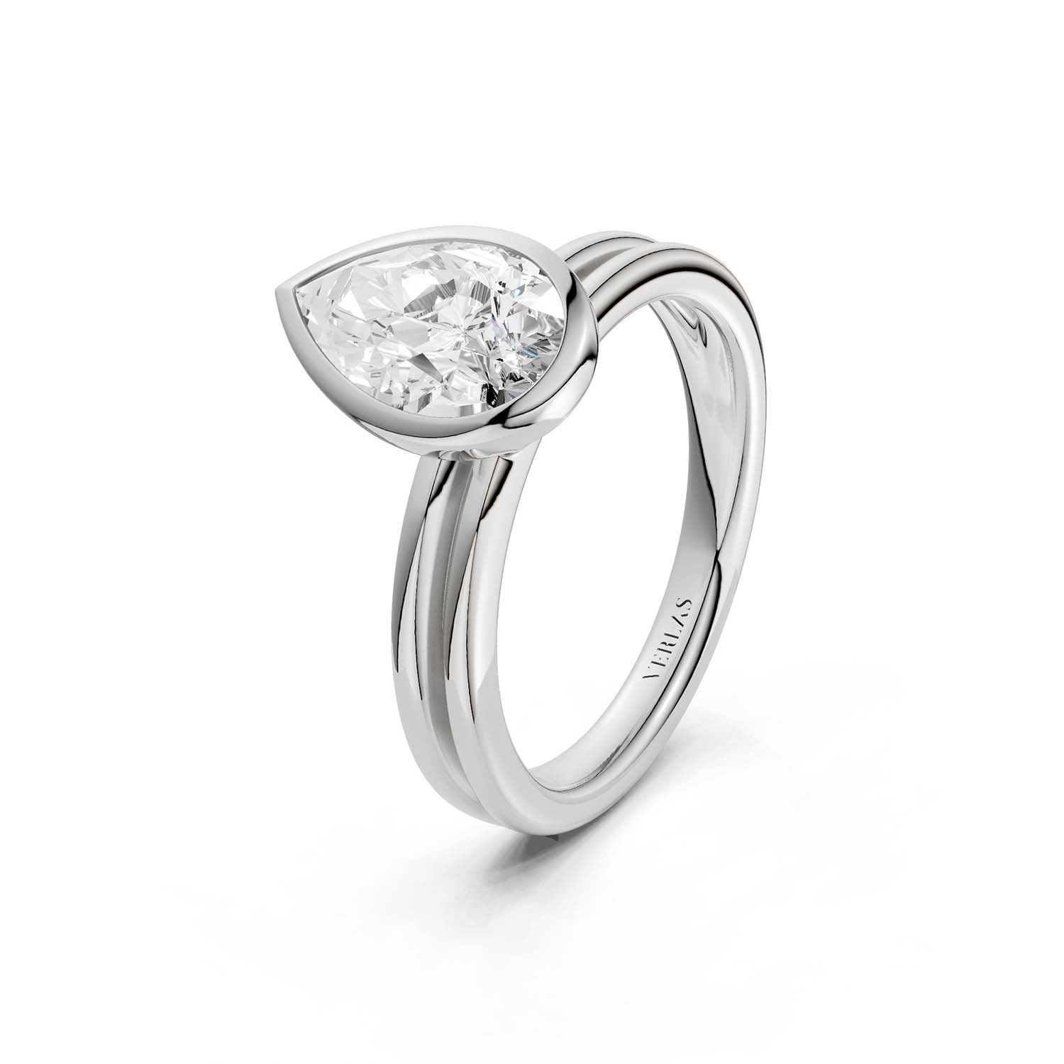 Celebrate love and timeless elegance with our Coupled Pear Bezel Ring, a stunning choice for engagements and anniversaries. Nestled within a unique dual-band design, this solitaire diamond ring features a bezel-set pear-shaped diamond exquisitely crafted to radiate brilliance. Choose between dual bands of pristine white and rose gold or the charming white and yellow gold combination tailored to complement your style. Also available in the all-white gold setting.