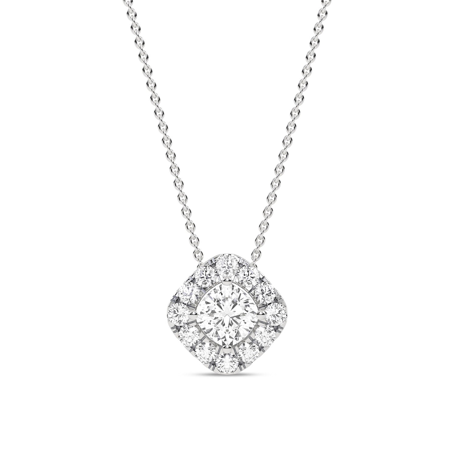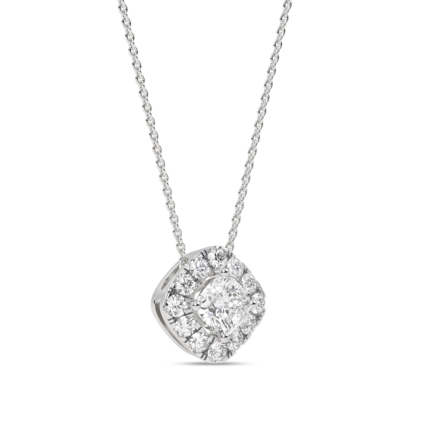 Elevate your style with this elegant Cushion Halo Diamond Necklace. In this necklace, a cushion-cut diamond pendant suspends from a delicate solid gold chain. The halo of diamonds surrounding the center stone adds a touch of sparkle to any outfit. This necklace is a true embodiment of beauty and conscience.