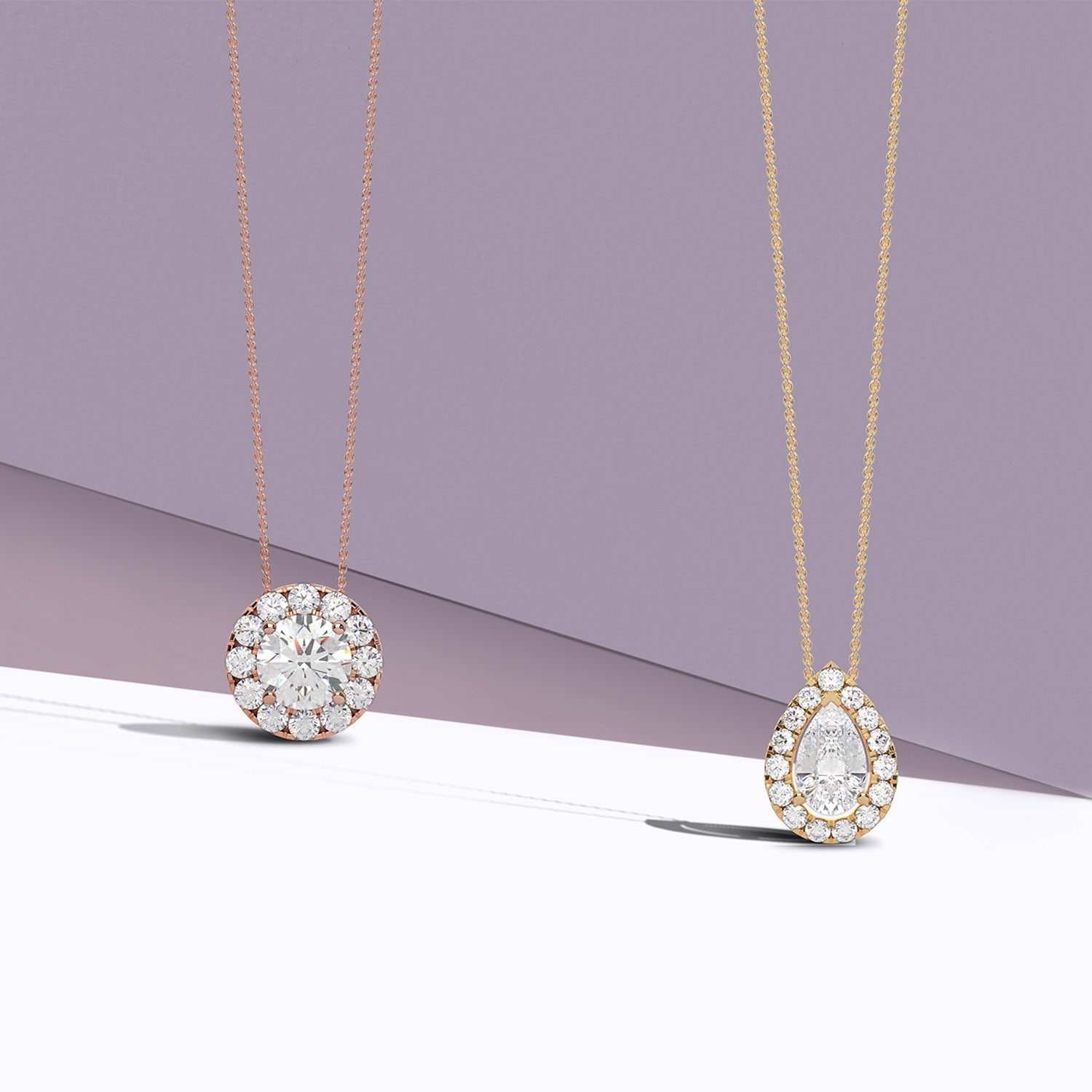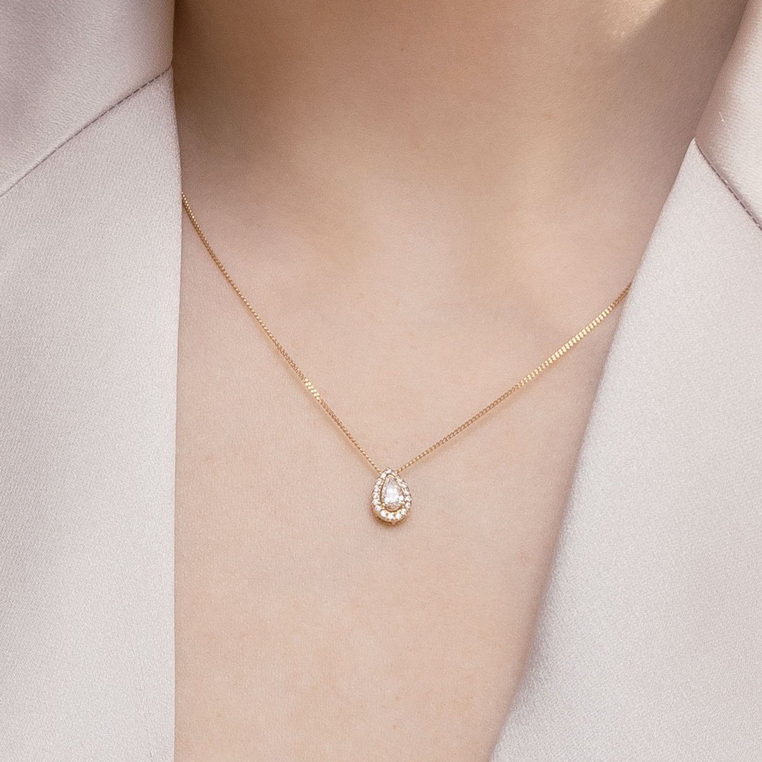 This Dewdrop Halo Necklace features a dewdrop-shaped diamond surrounded by a halo of tiny diamonds. The dewdrop-like setting creates a breathtaking visual experience, making this diamond pendant necklace perfect for any occasion, whether it’s a night out or a day at the office. It’s versatile enough to be worn with any outfit, from casual to formal.