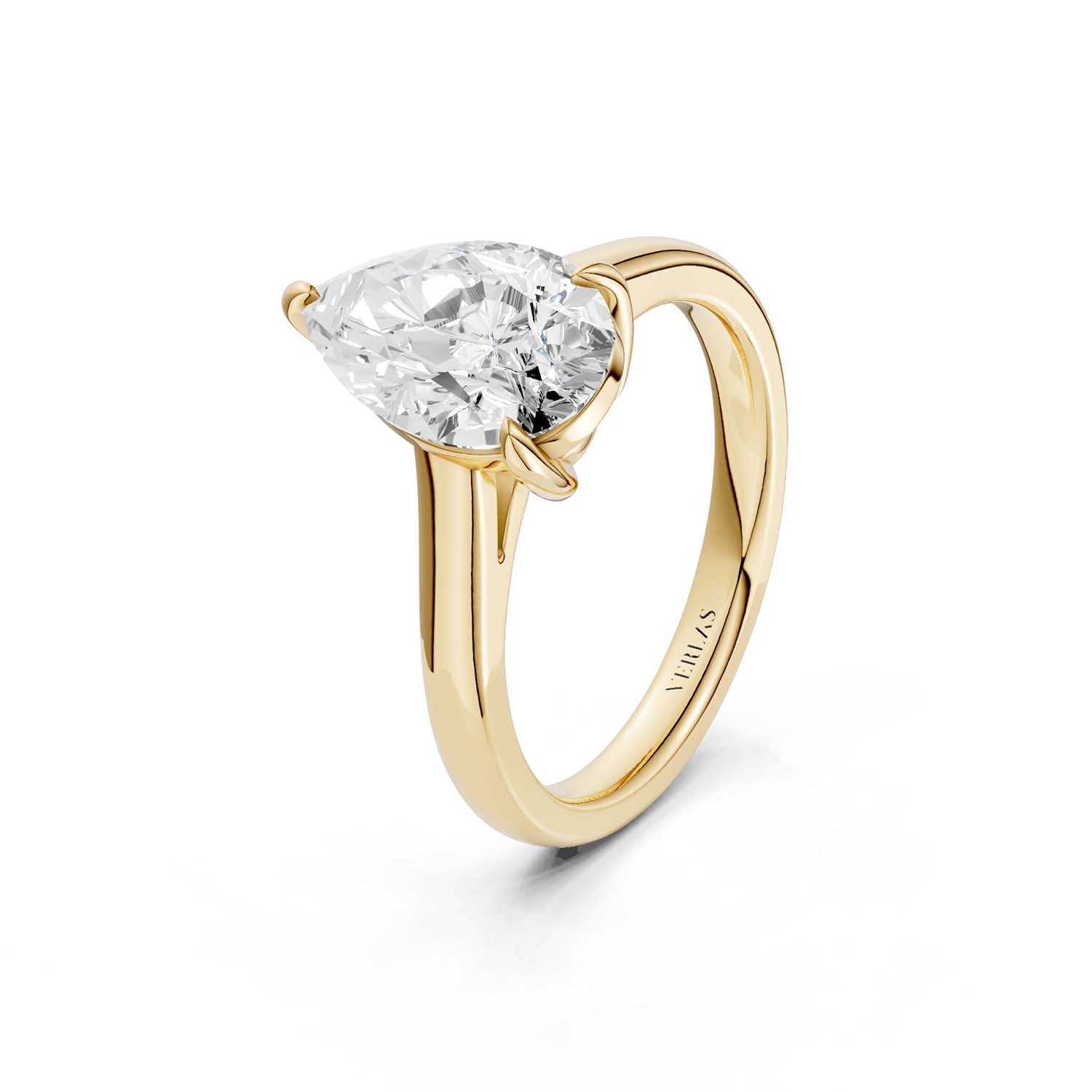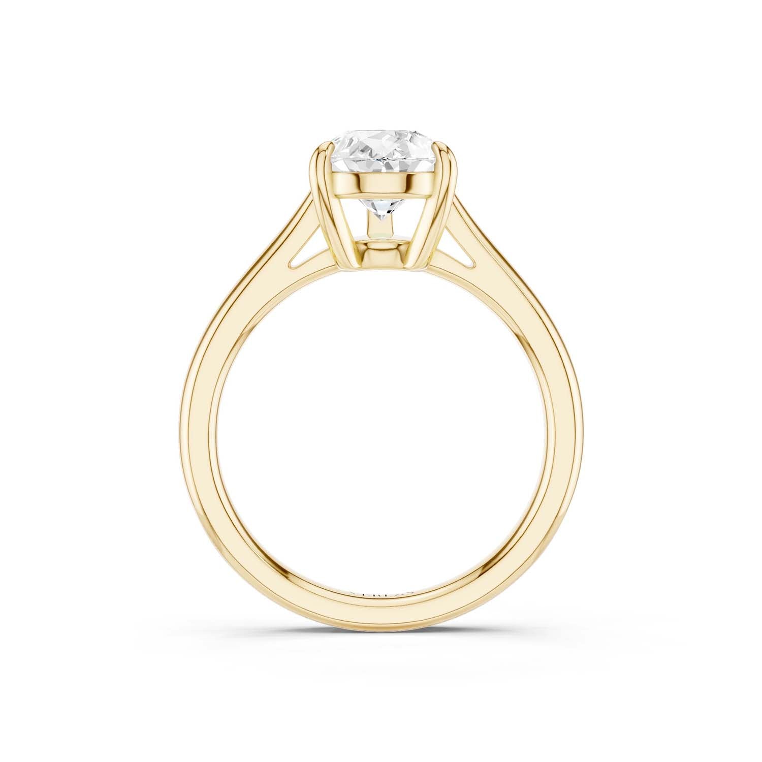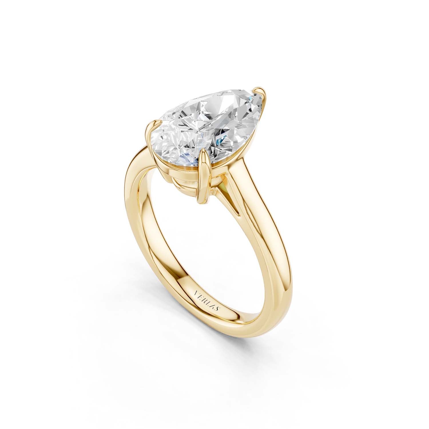 This elegant lab-created diamond solitaire ring features an open basket with three claw prongs that cradle the center dewdrop shape diamond. The fine gold band adds to the classic look of the design.