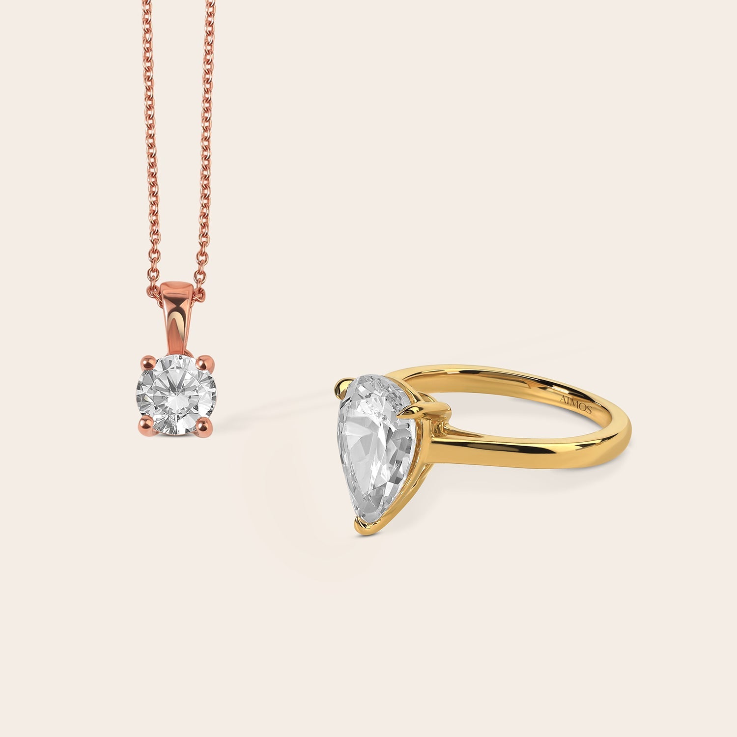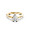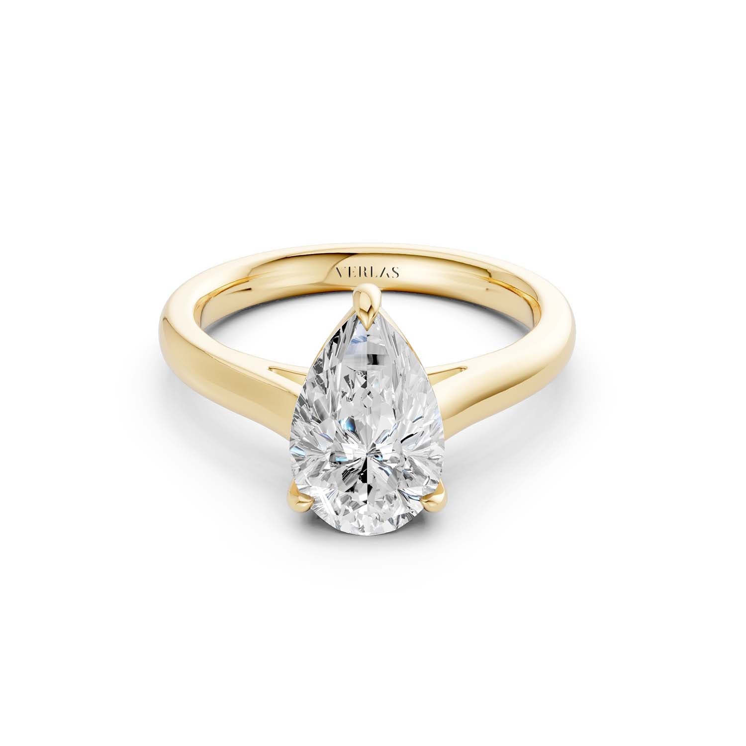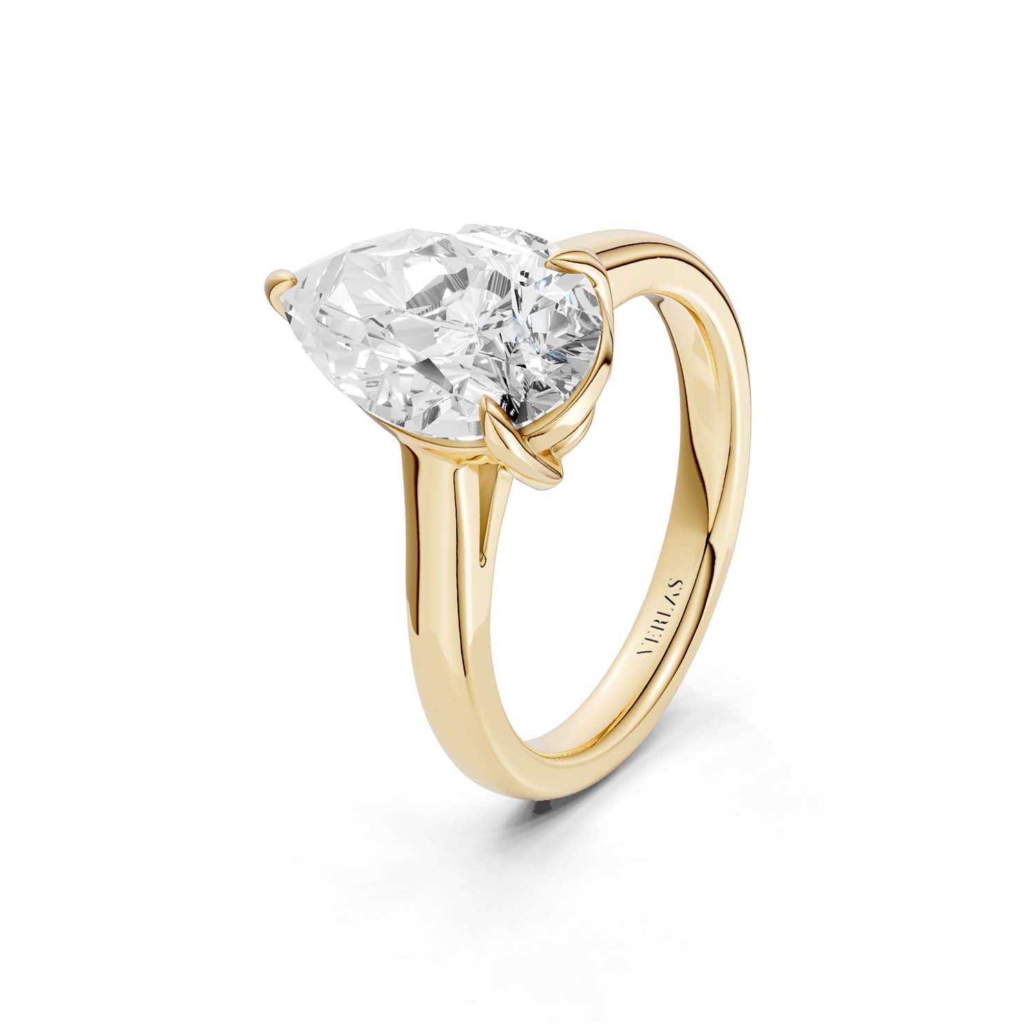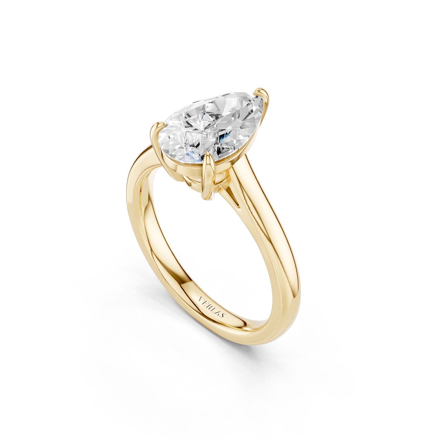 This elegant lab-created diamond solitaire ring features an open basket with three claw prongs that cradle the center dewdrop shape diamond. The fine gold band adds to the classic look of the design.