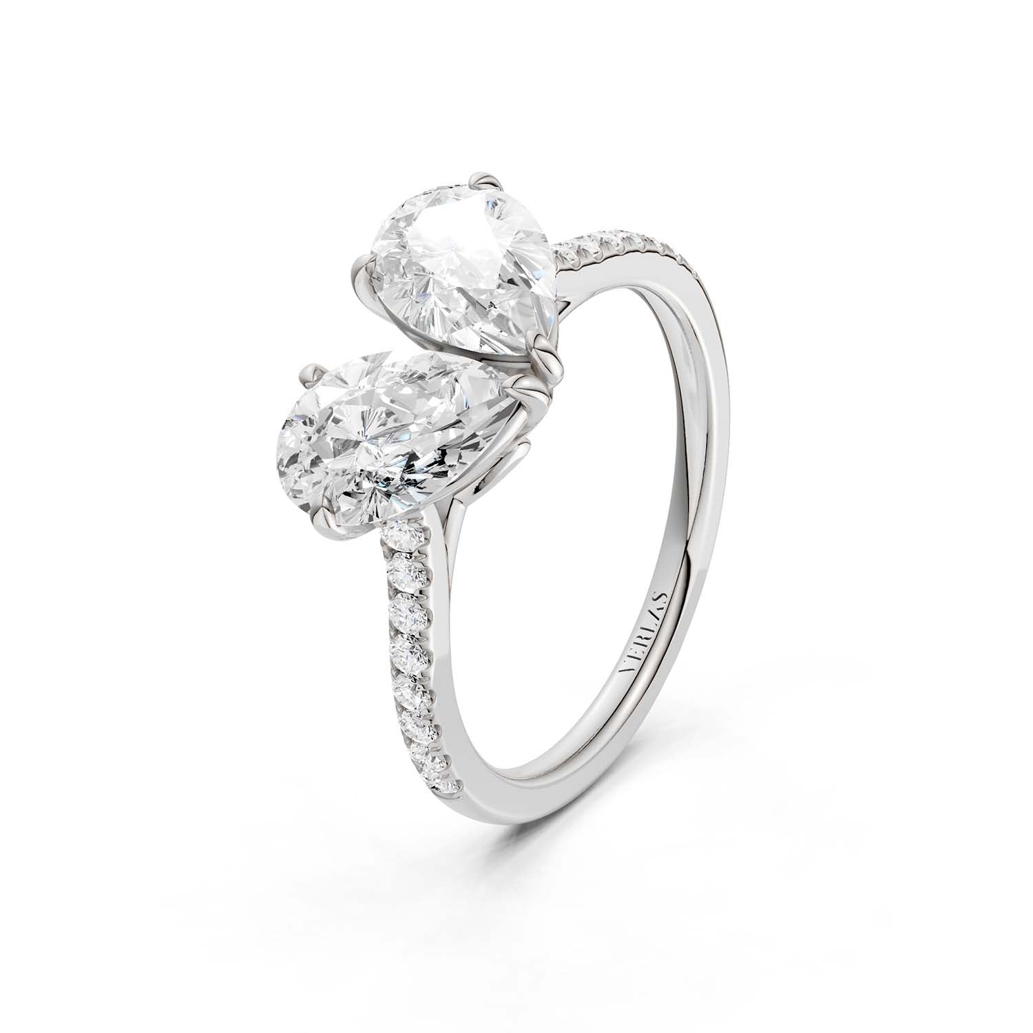 This Toi et Moi r ing beautifully encapsulates the essence of two souls intertwined in an inseparable embrace. Gracefully designed, this ring features two beautiful pear-shaped diamonds that come together to form a heart shape and is delicately set in a band of lustrous round diamonds.