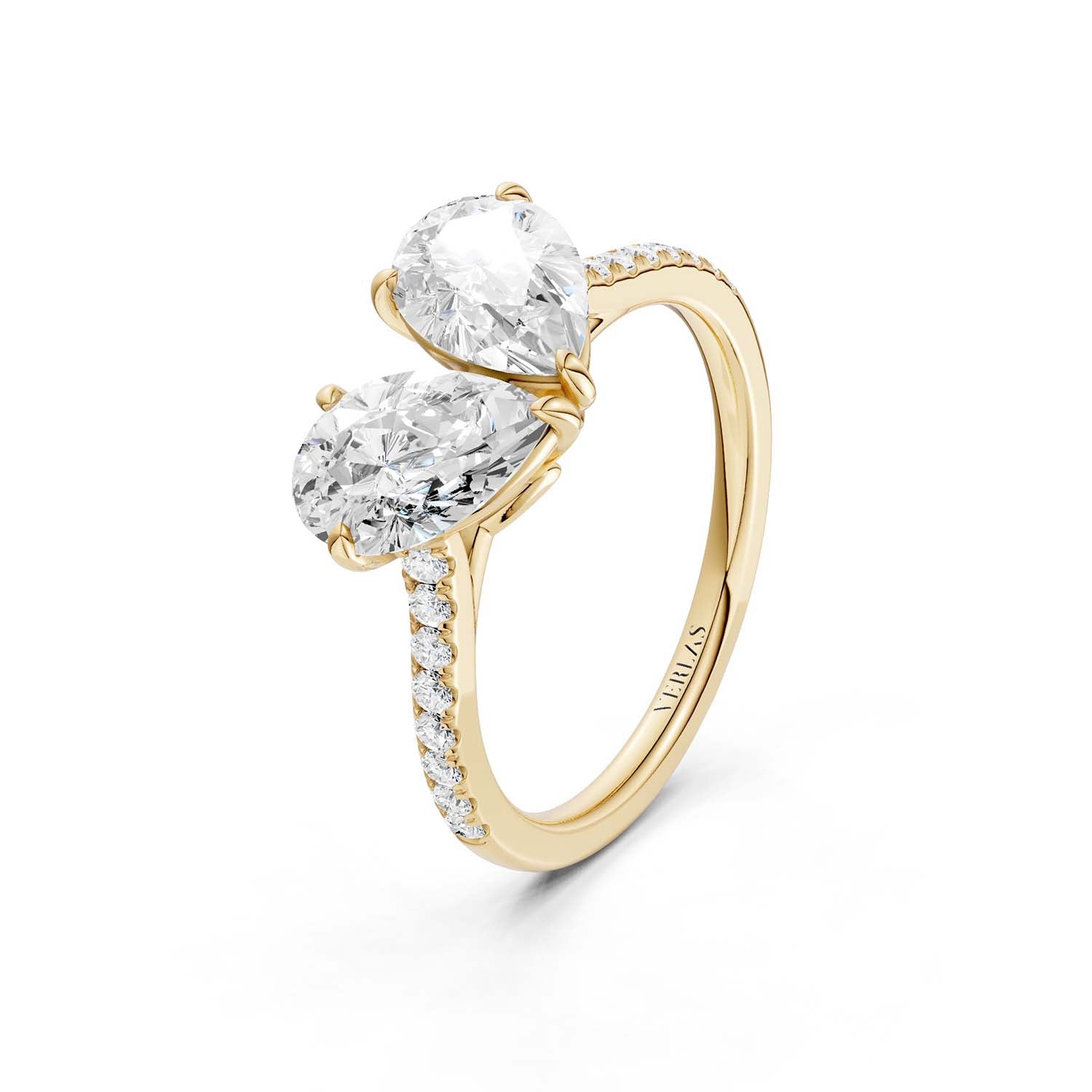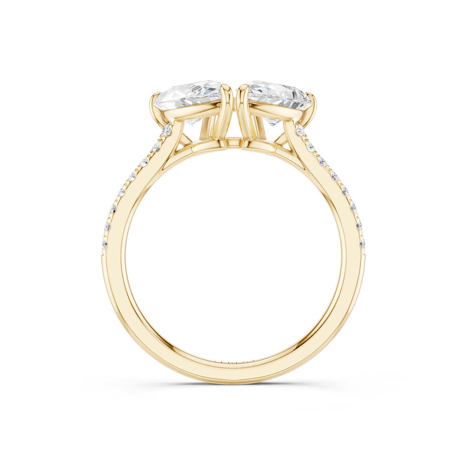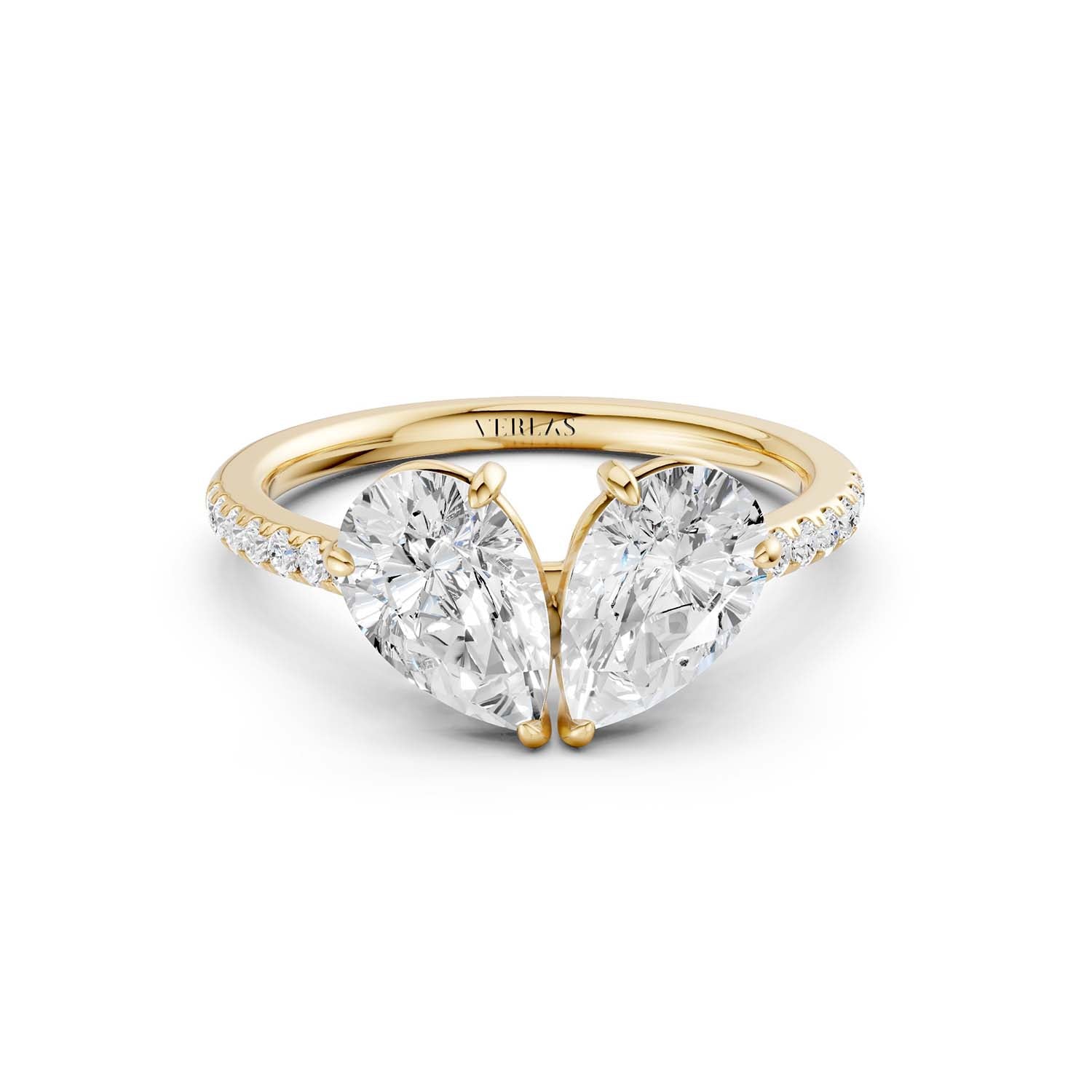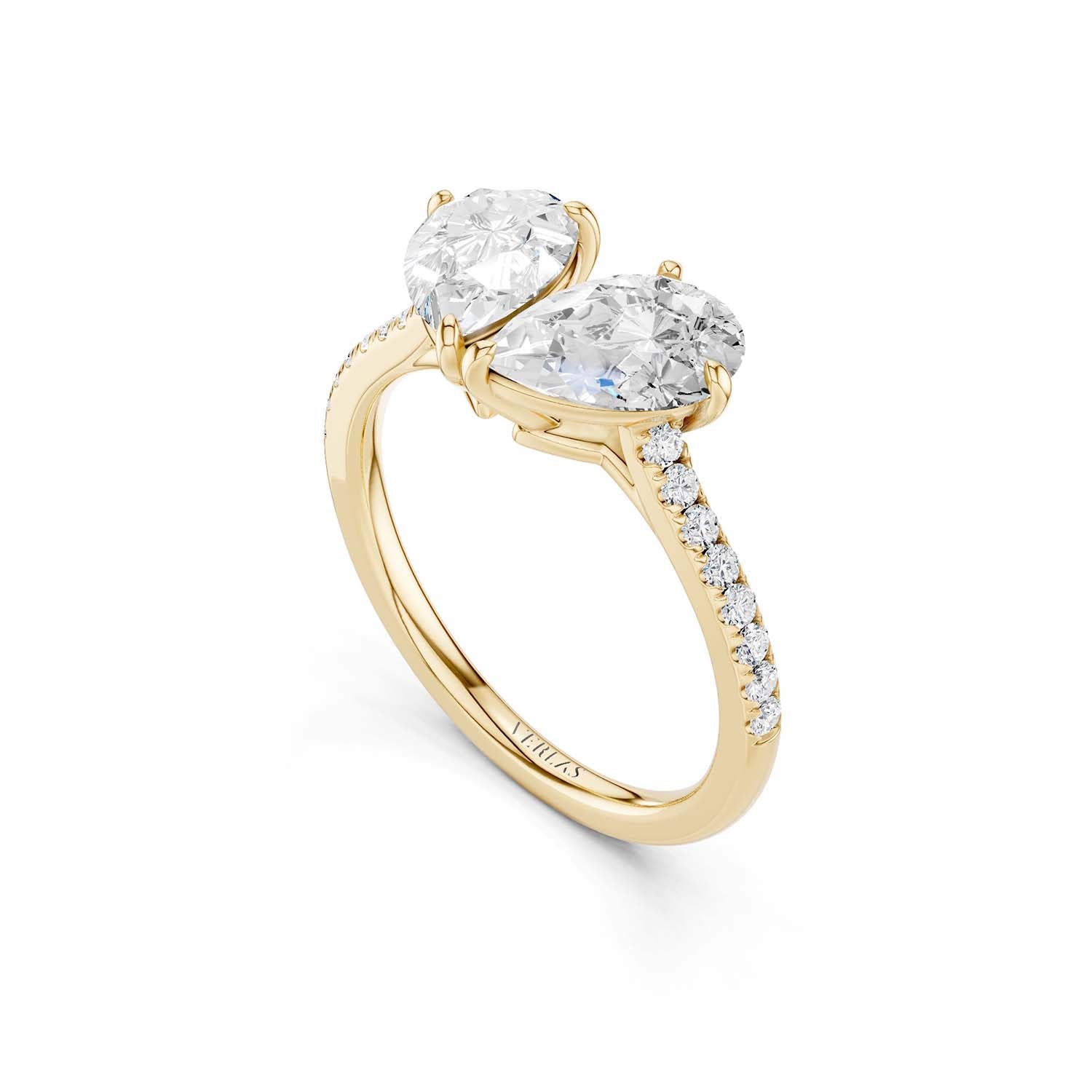 This Toi et Moi r ing beautifully encapsulates the essence of two souls intertwined in an inseparable embrace. Gracefully designed, this ring features two beautiful pear-shaped diamonds that come together to form a heart shape and is delicately set in a band of lustrous round diamonds.