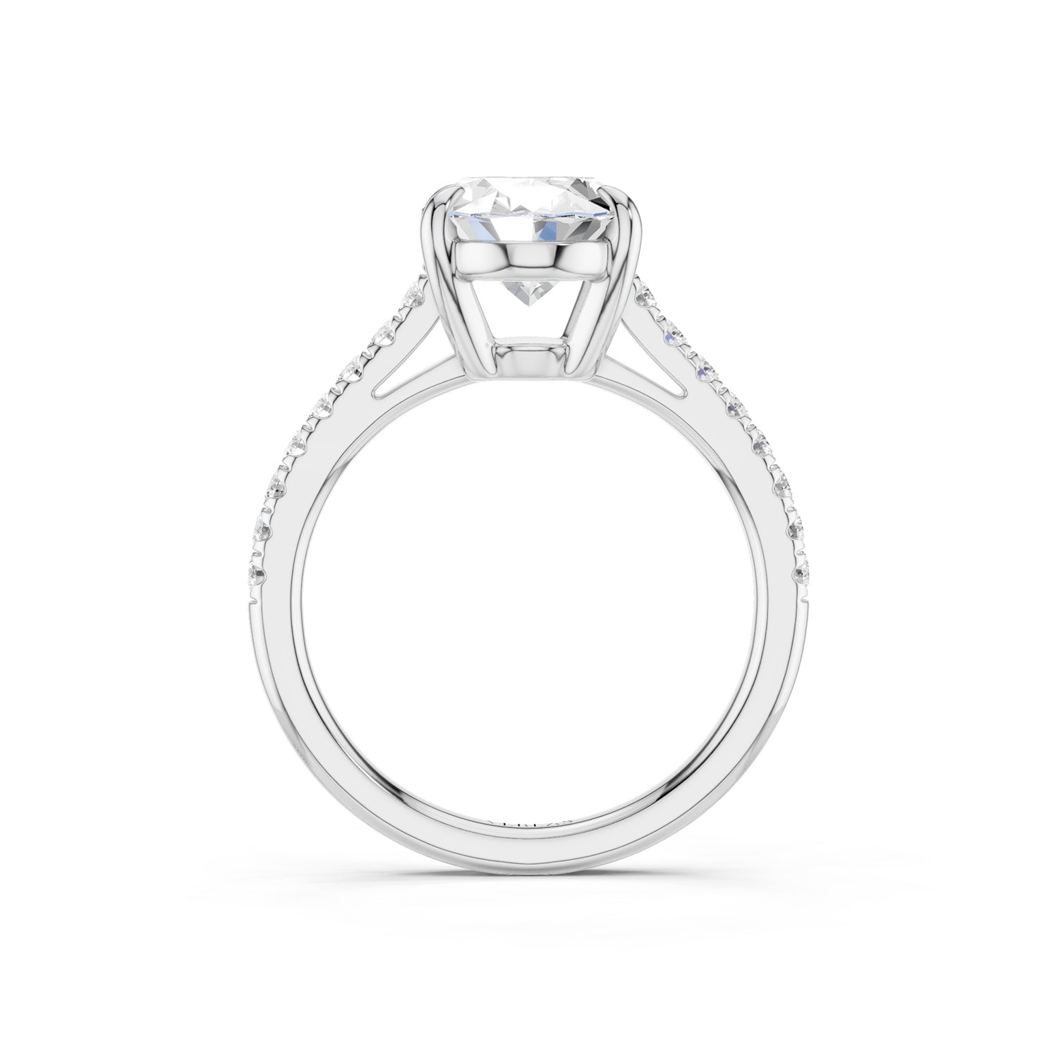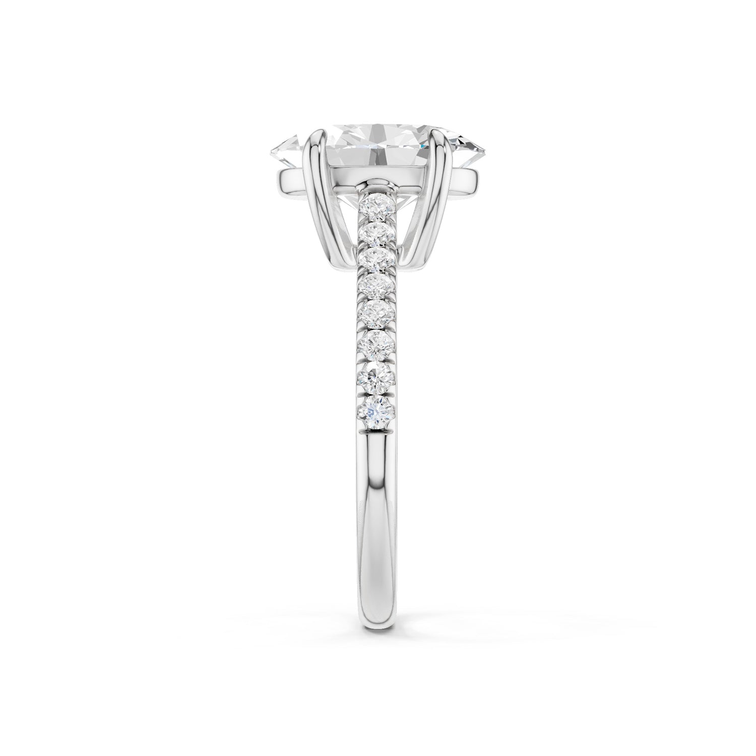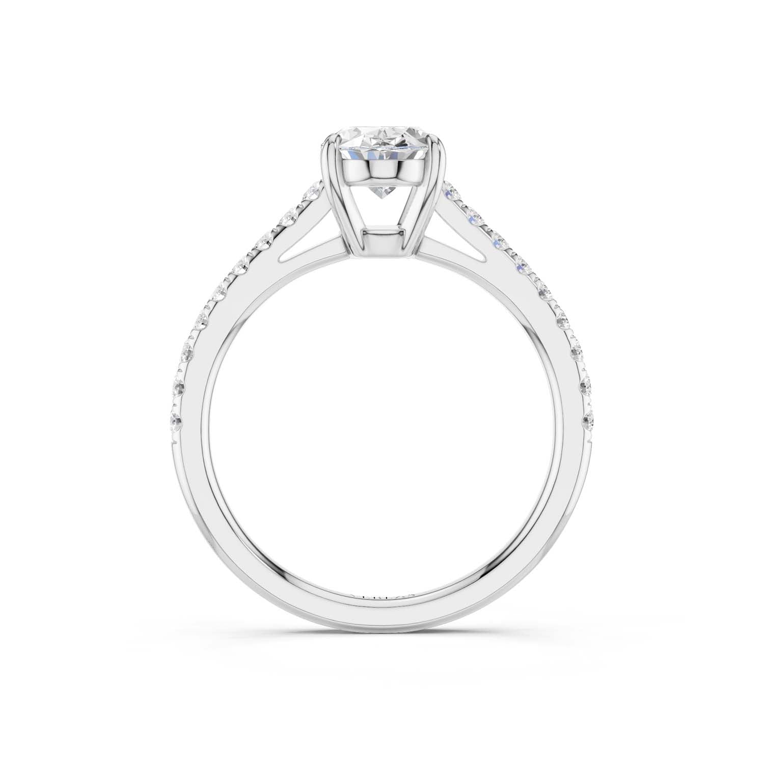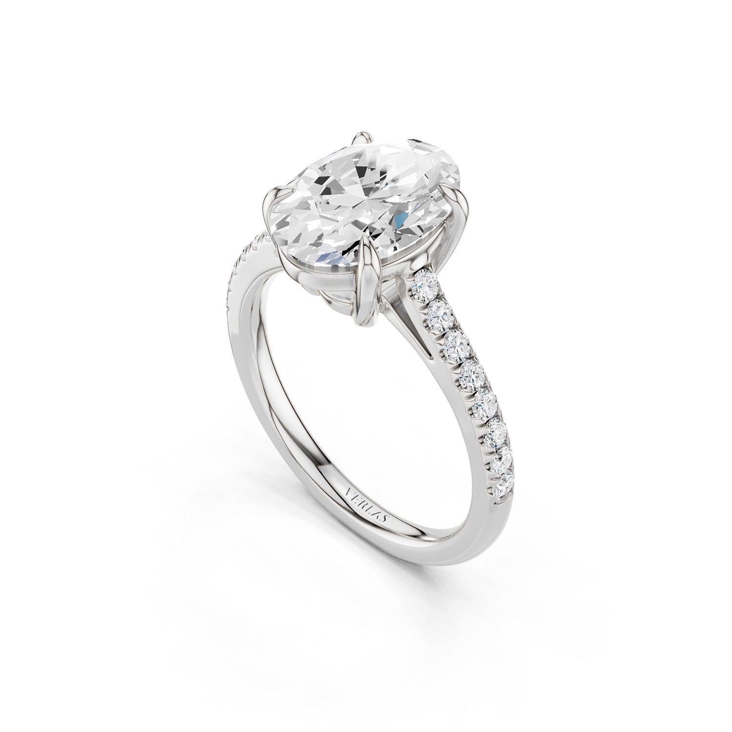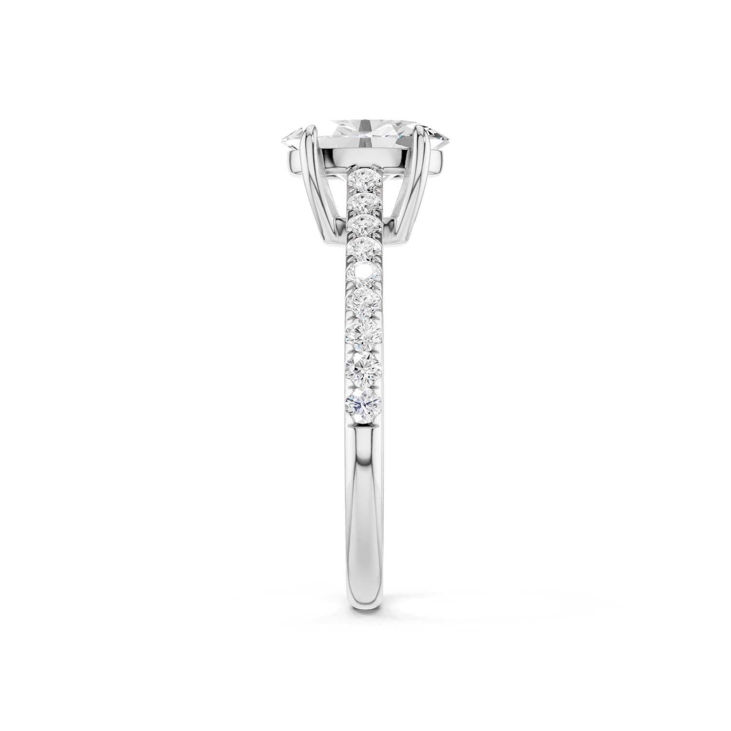 This dainty lab-created oval diamond engagement ring features lab-grown diamonds with sheer sparkle that extends halfway around the ring. The prong-set center diamond is complemented by glittering micro pave diamonds along the shank, giving it an elegant, chic look.