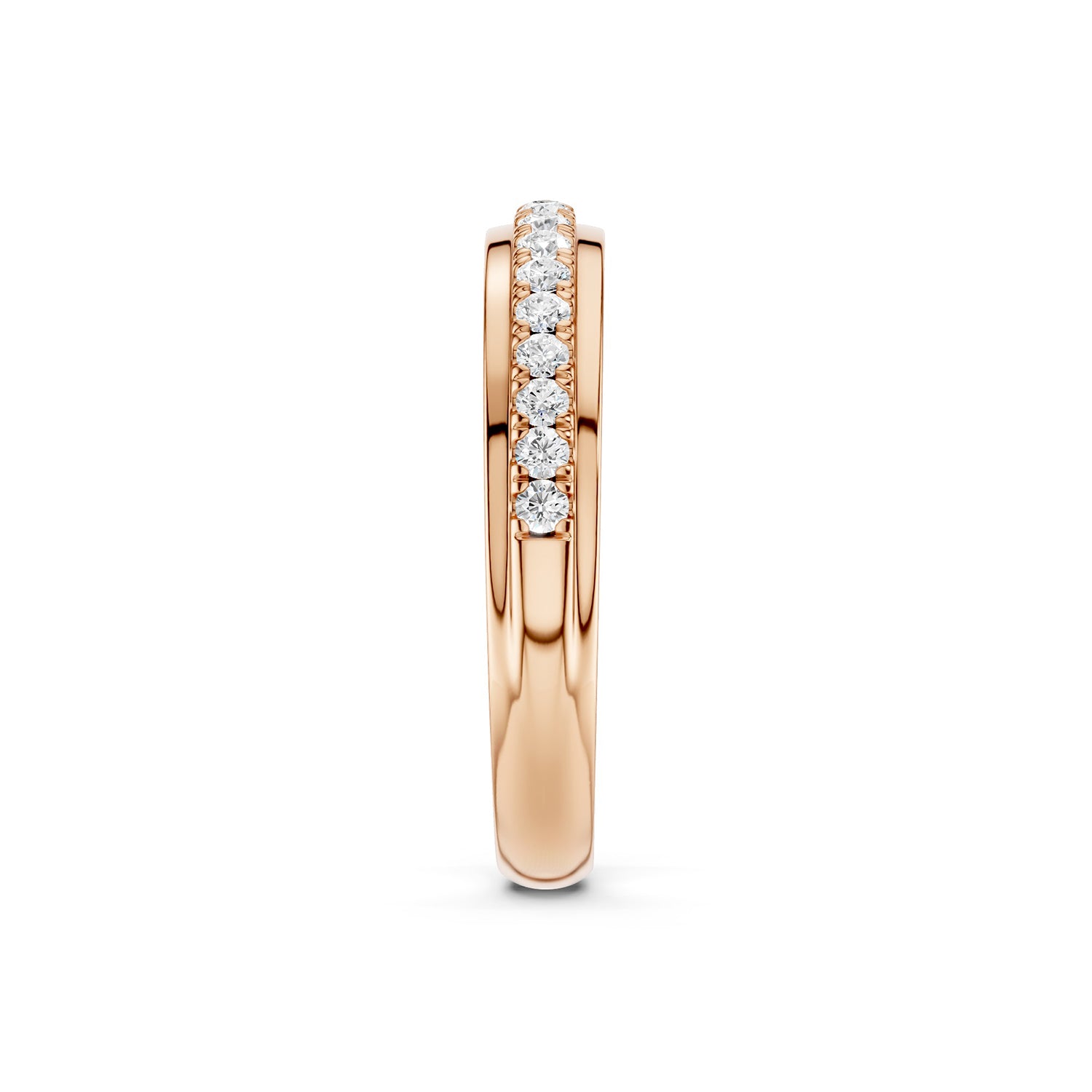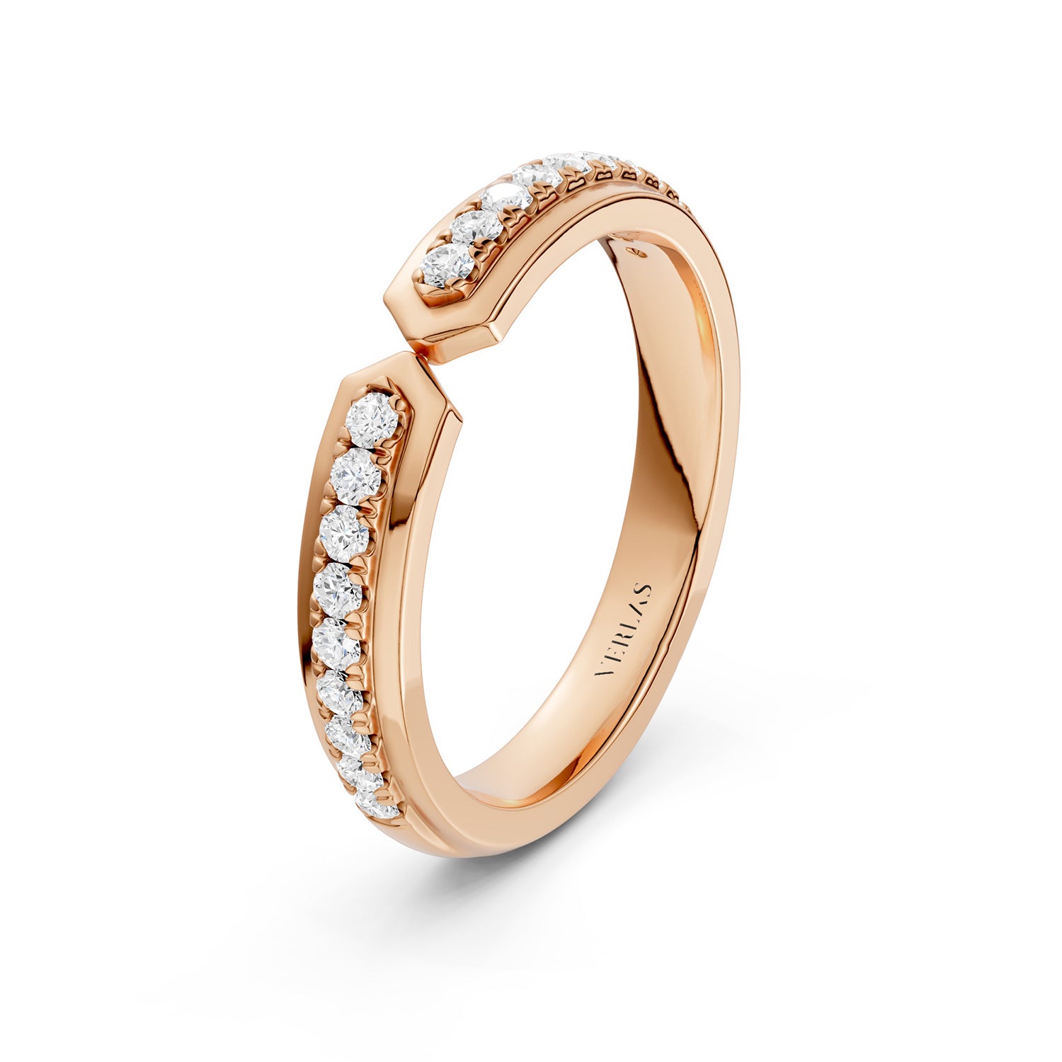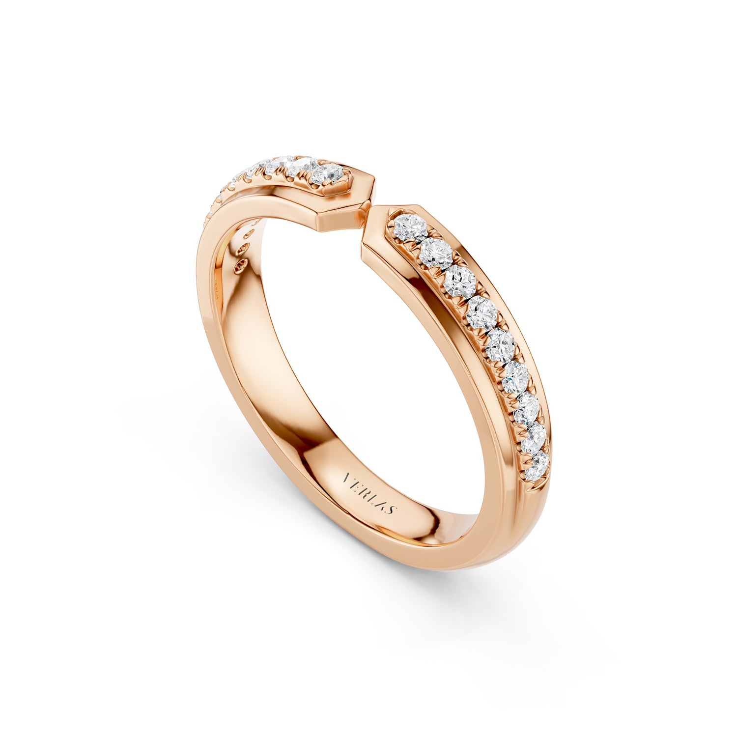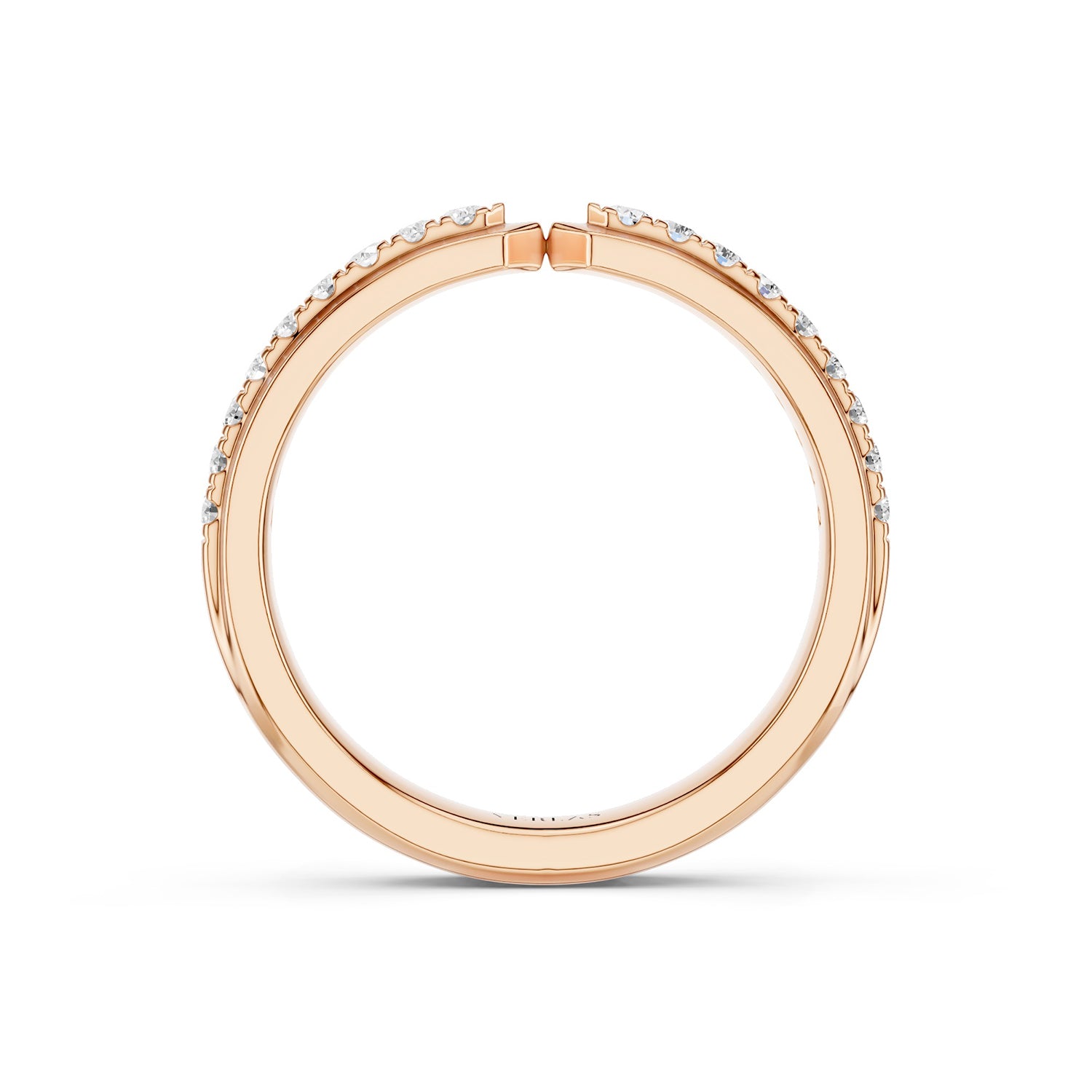 The Embrace Band’s striking appearance is characterized by a row of dazzling diamonds, thoughtfully interspersed with a pinch design at the center. This unique detail adds depth and character to the band, creating an engaging visual that sets it apart as an exceptional diamond stacking ring.