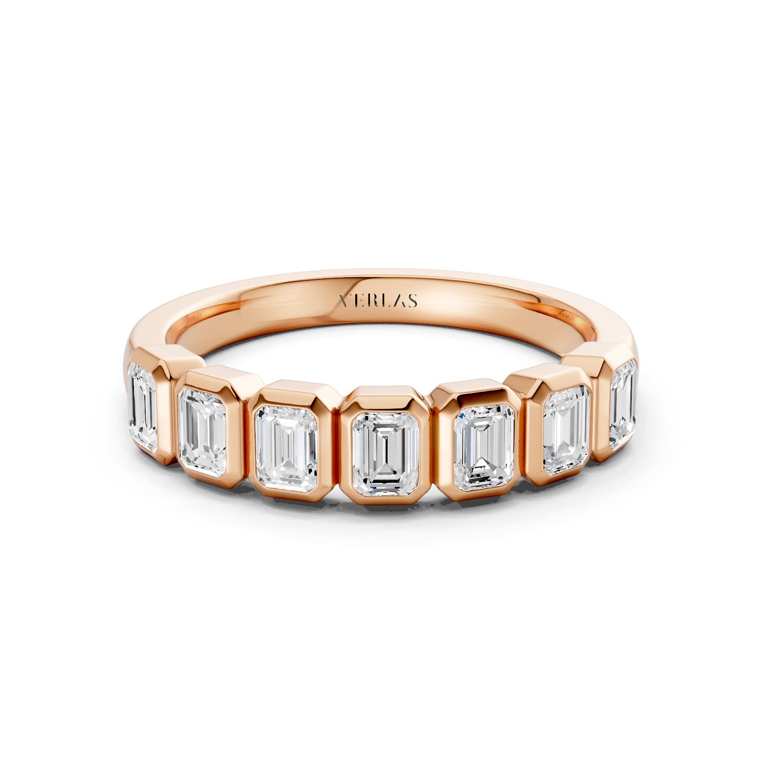 Sleek elegance with a modern edge—this Emerald Bezel-Set Half-Eternity Diamond Band presents lab-grown emerald-cut diamonds beautifully encased in smooth bezels across half the band—perfect as a wedding band, stacking design, or an incredibly chic everyday sparkle.