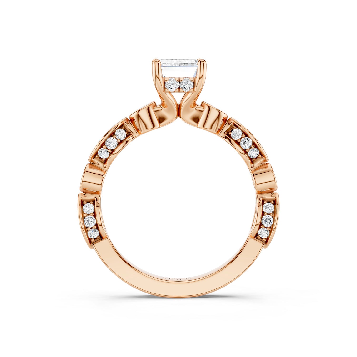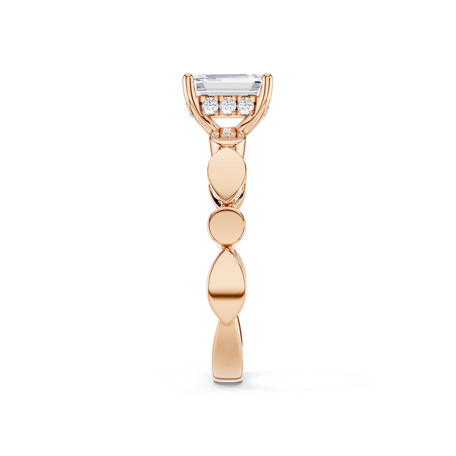 A striking emerald-cut lab-grown diamond takes center stage in this hidden halo ring, designed with marquise and round-shaped motifs along the band. Polished gold meets shimmering accent diamonds for a bold, textured look. With secret sparkle from every angle, this engagement ring is timeless, modern, and unforgettable.