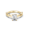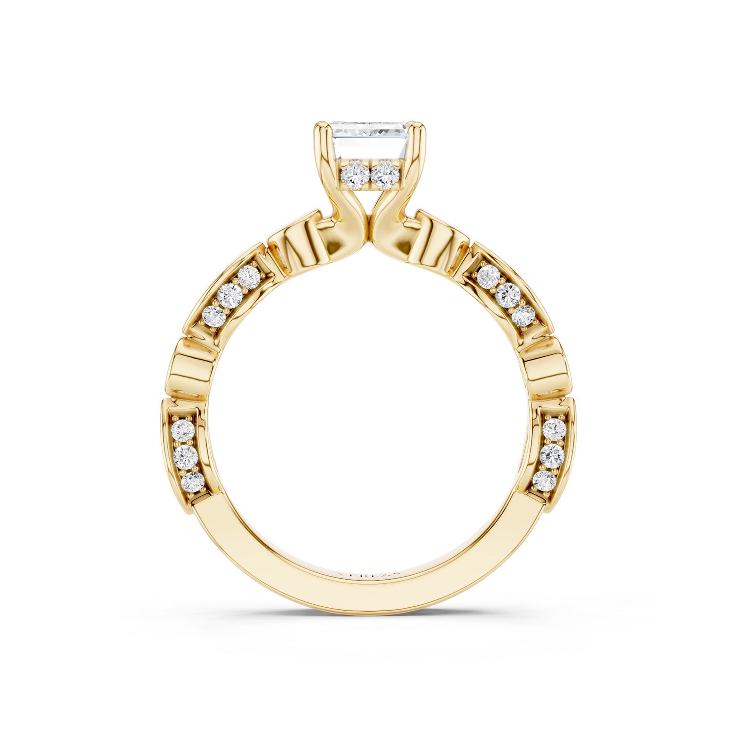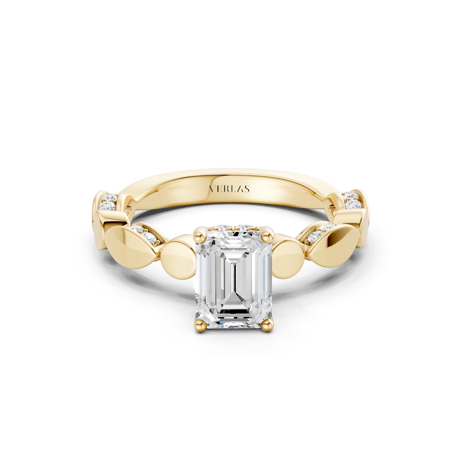 A striking emerald-cut lab-grown diamond takes center stage in this hidden halo ring, designed with marquise and round-shaped motifs along the band. Polished gold meets shimmering accent diamonds for a bold, textured look. With secret sparkle from every angle, this engagement ring is timeless, modern, and unforgettable.