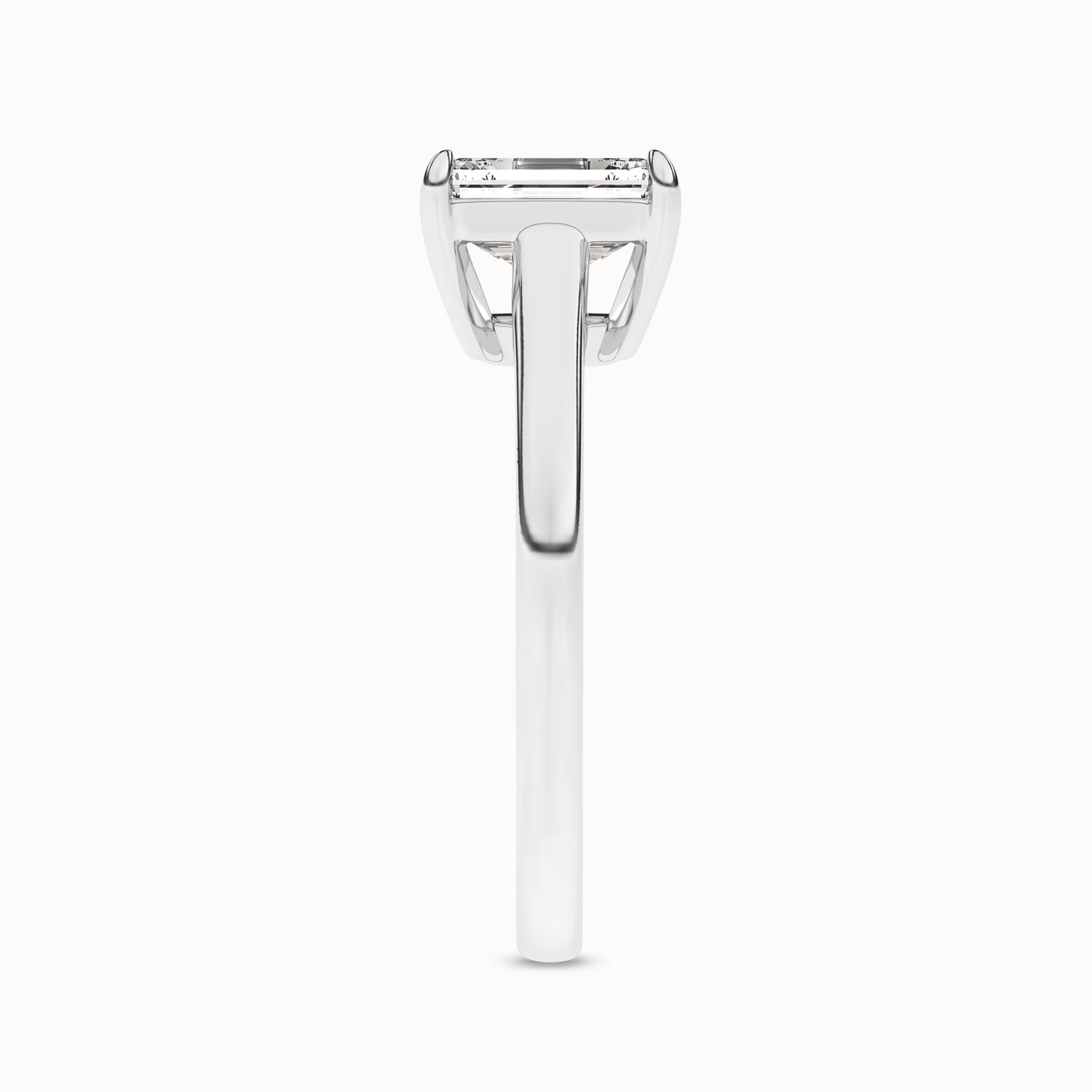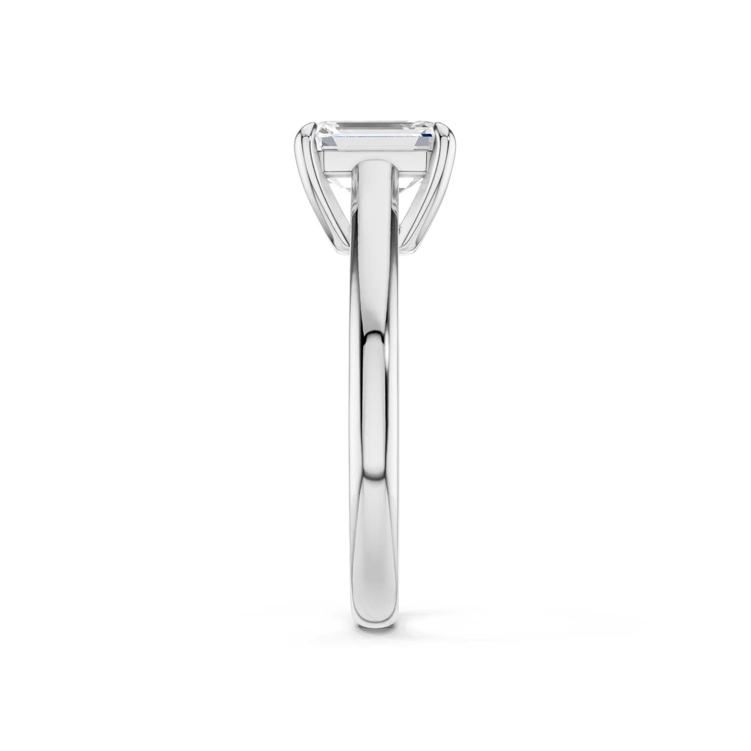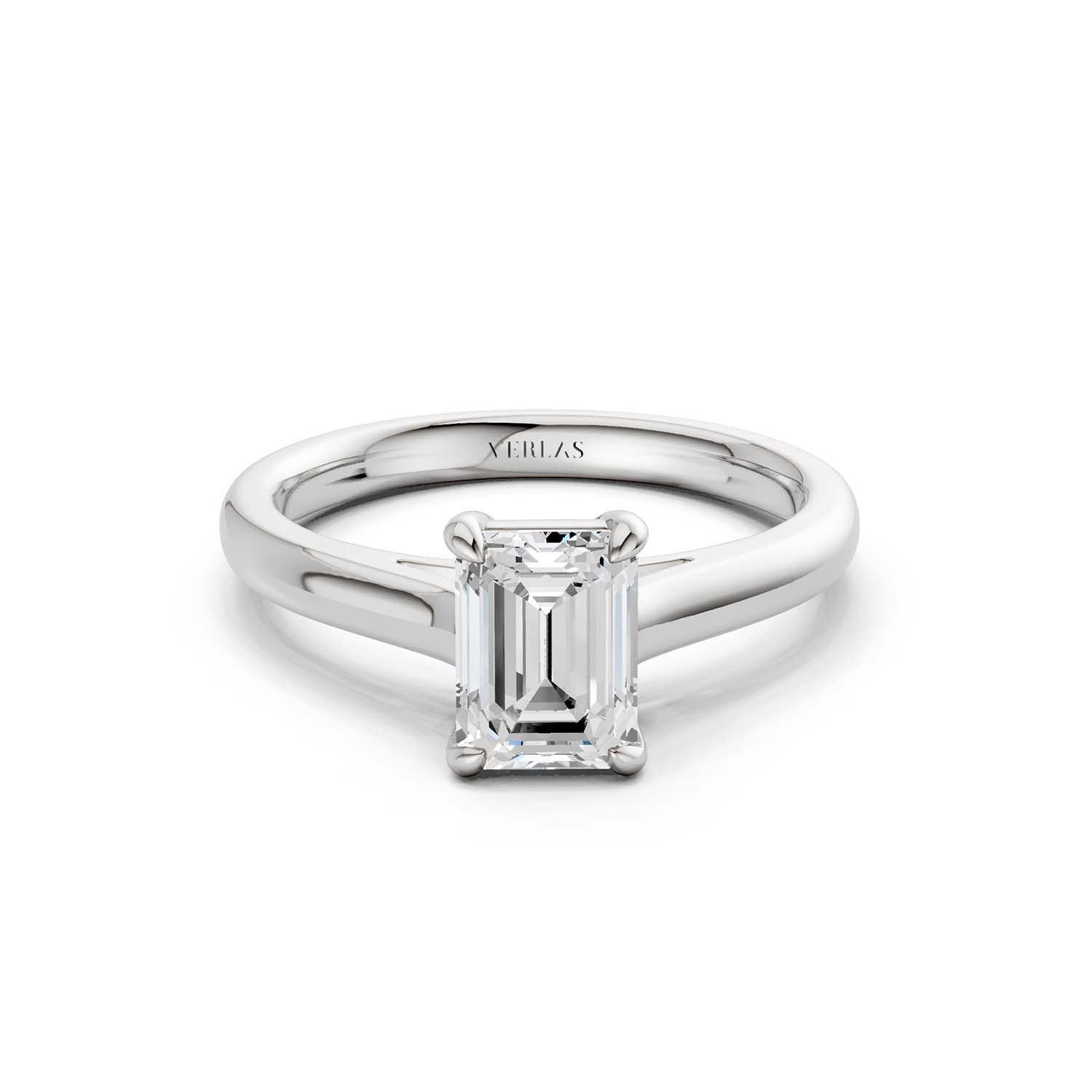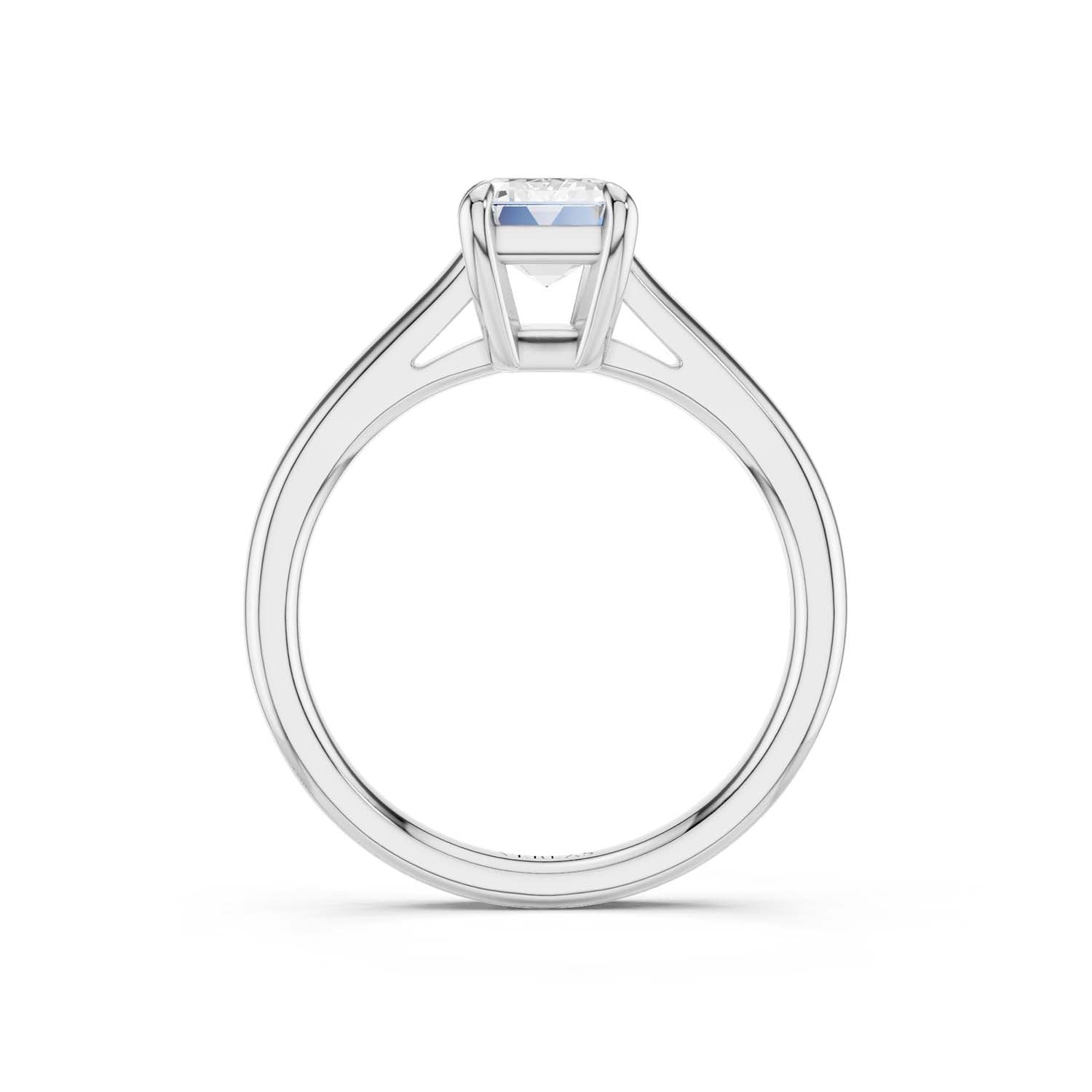 This elegant solitaire ring features an open basket with claw prongs that cradle the center emerald shape lab-grown diamond solitaire. The simple yet classic band style adds to the sleek, contemporary look of the design.