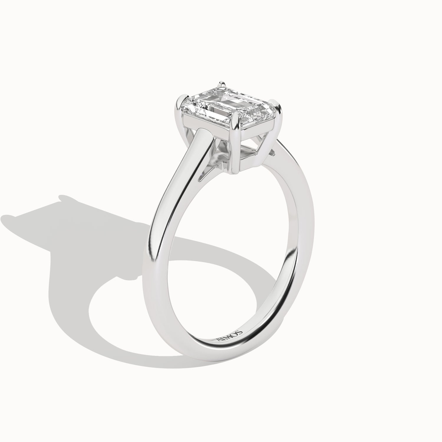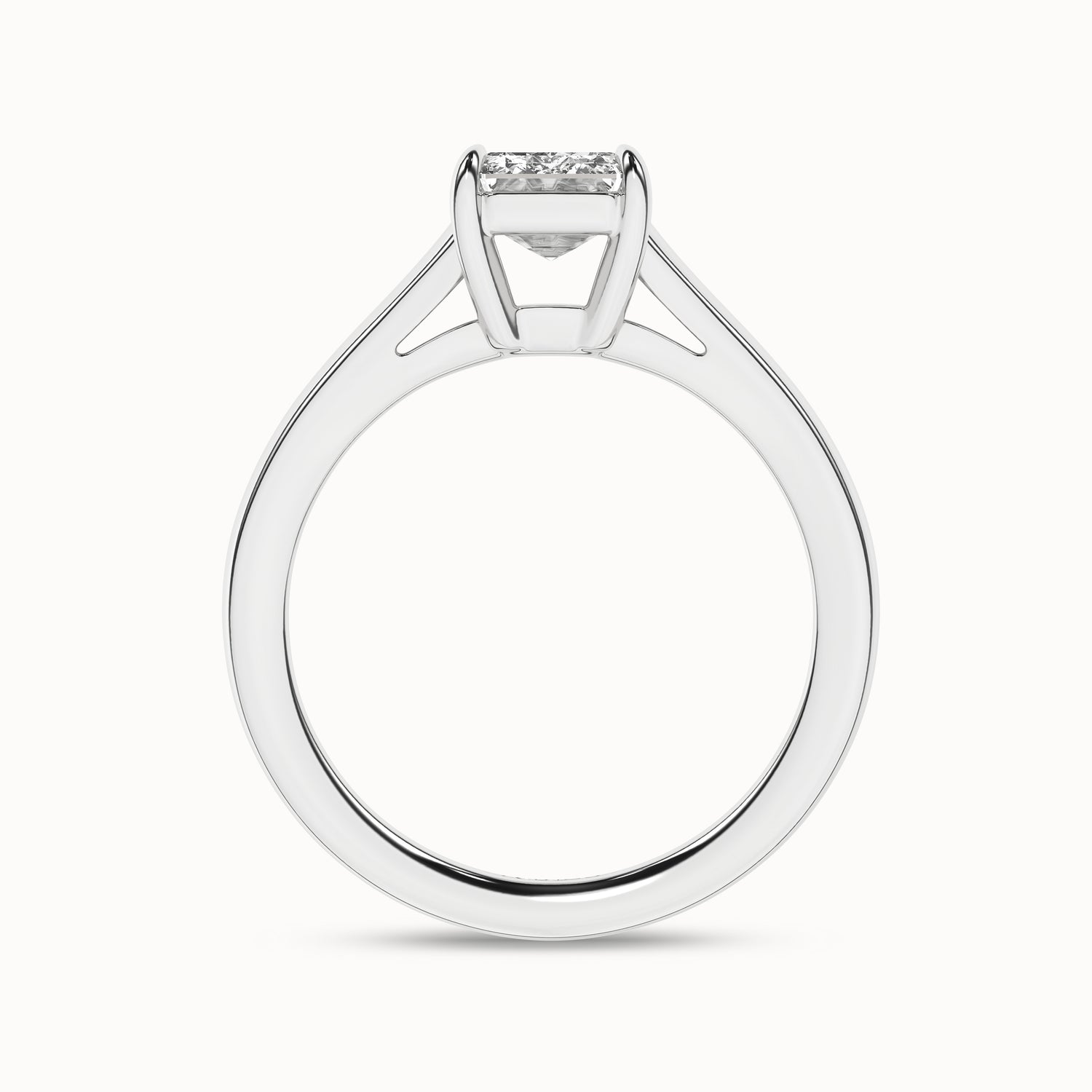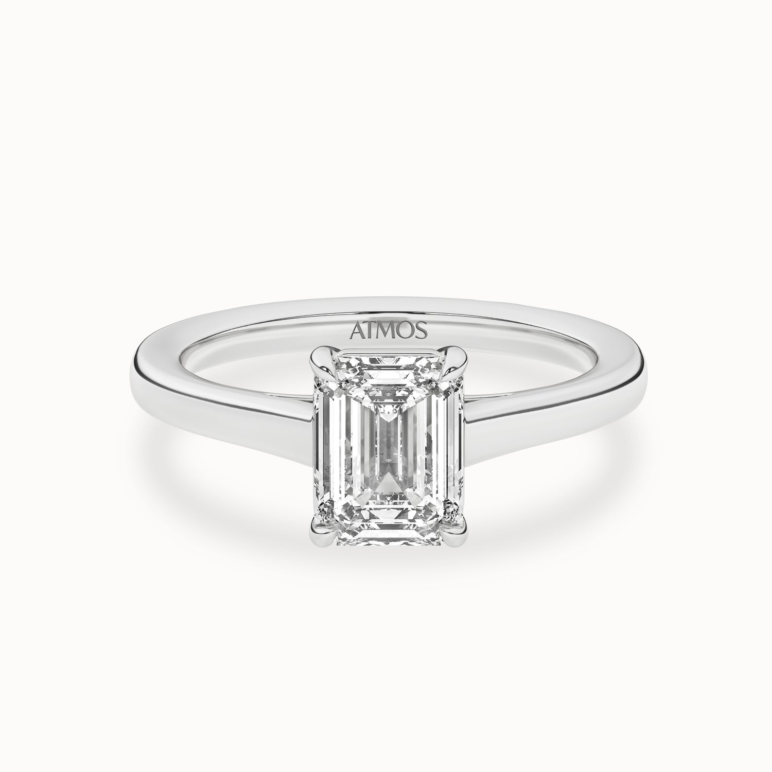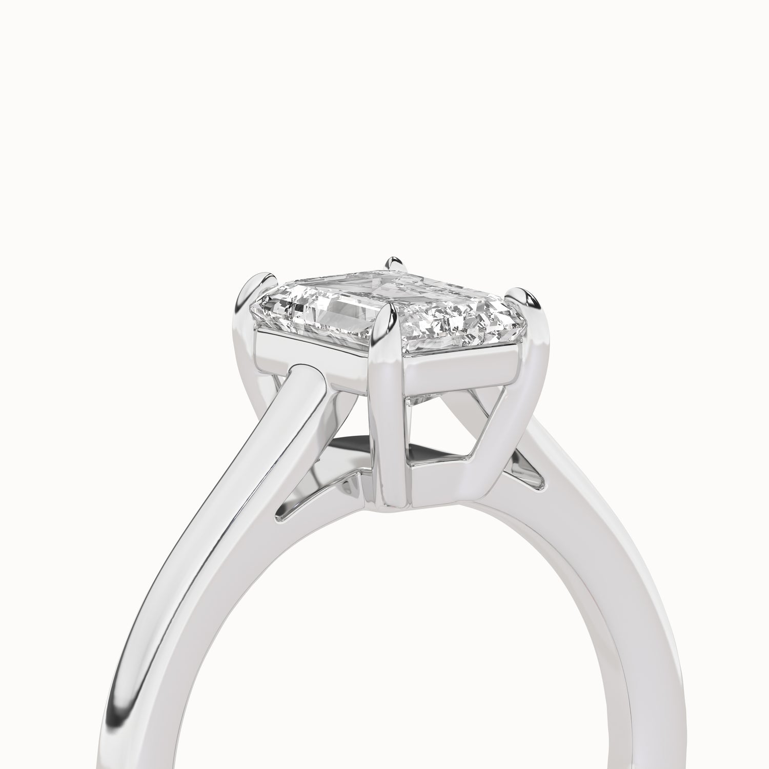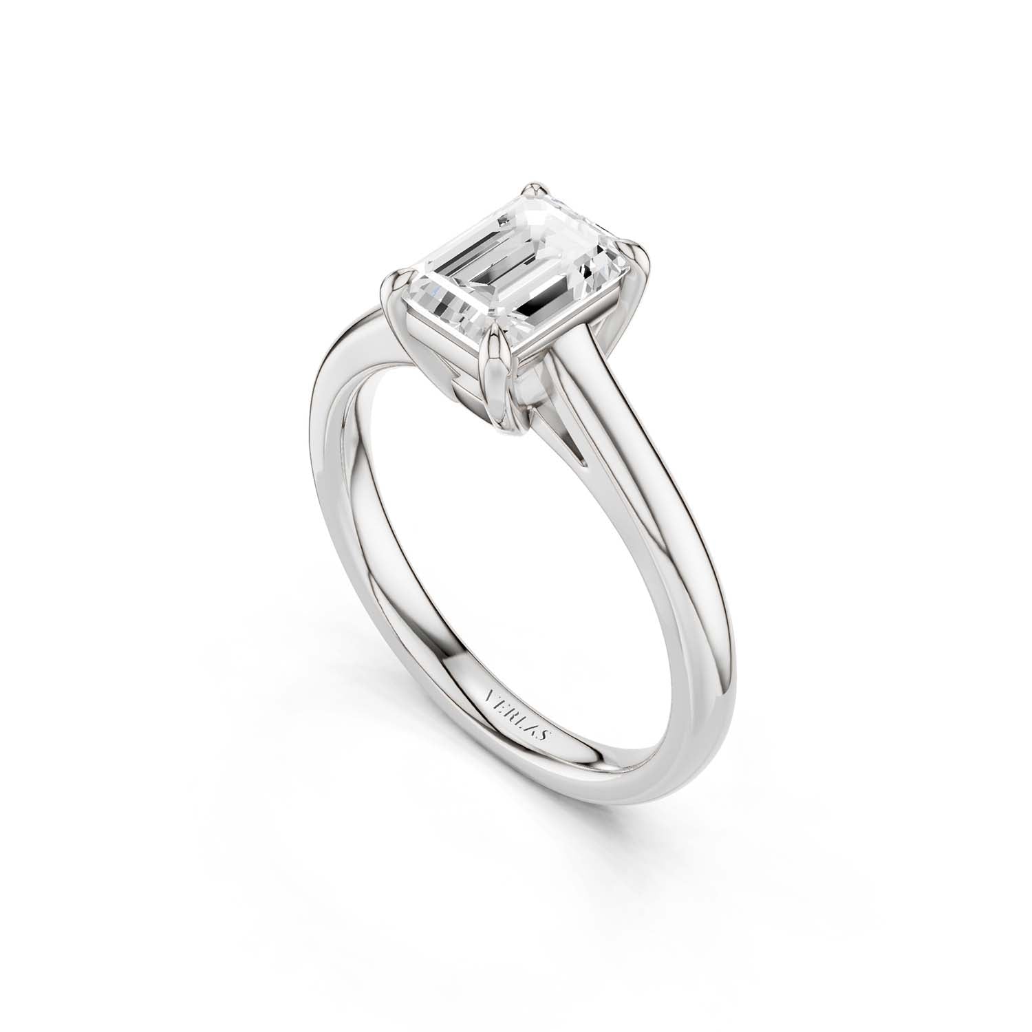 This elegant solitaire ring features an open basket with claw prongs that cradle the center emerald shape lab-grown diamond solitaire. The simple yet classic band style adds to the sleek, contemporary look of the design.