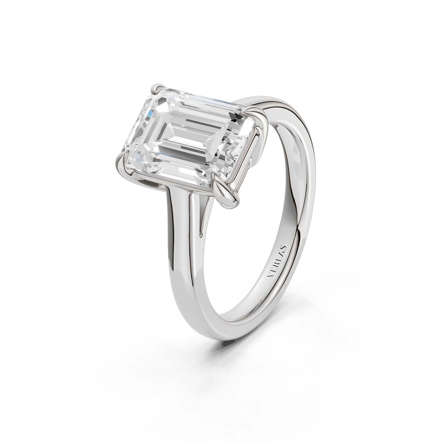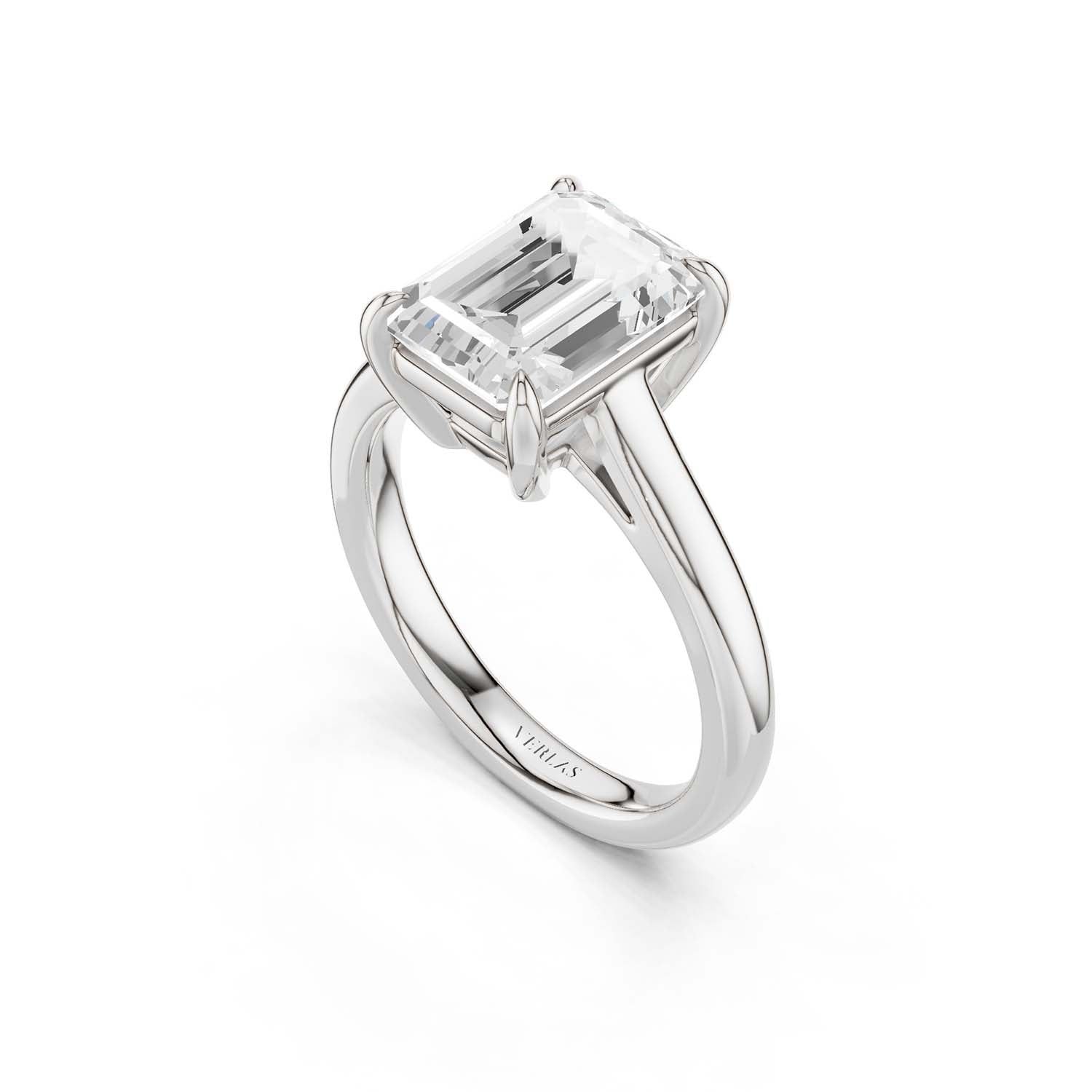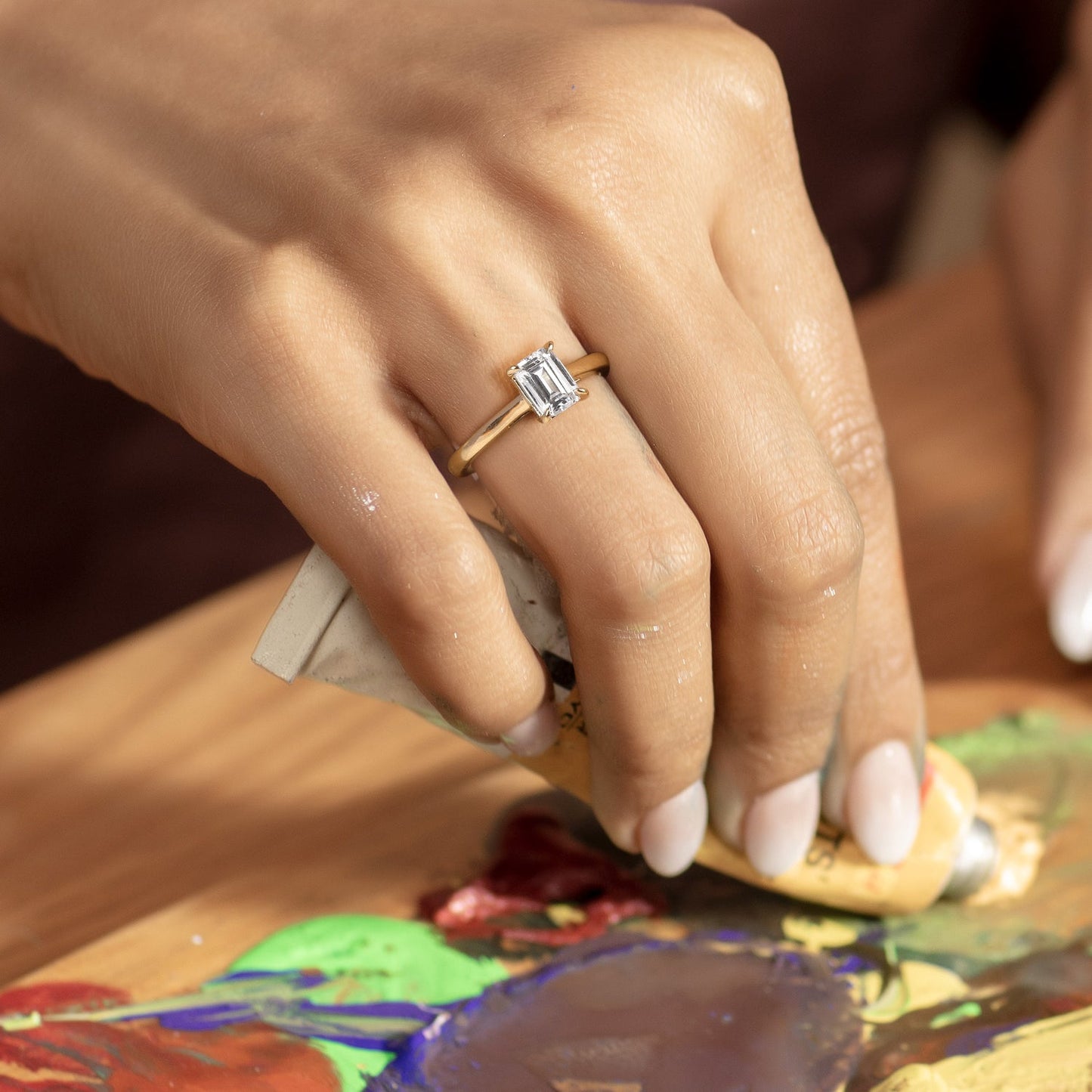 This elegant solitaire ring features an open basket with claw prongs that cradle the center emerald shape lab-grown diamond solitaire. The simple yet classic band style adds to the sleek, contemporary look of the design.