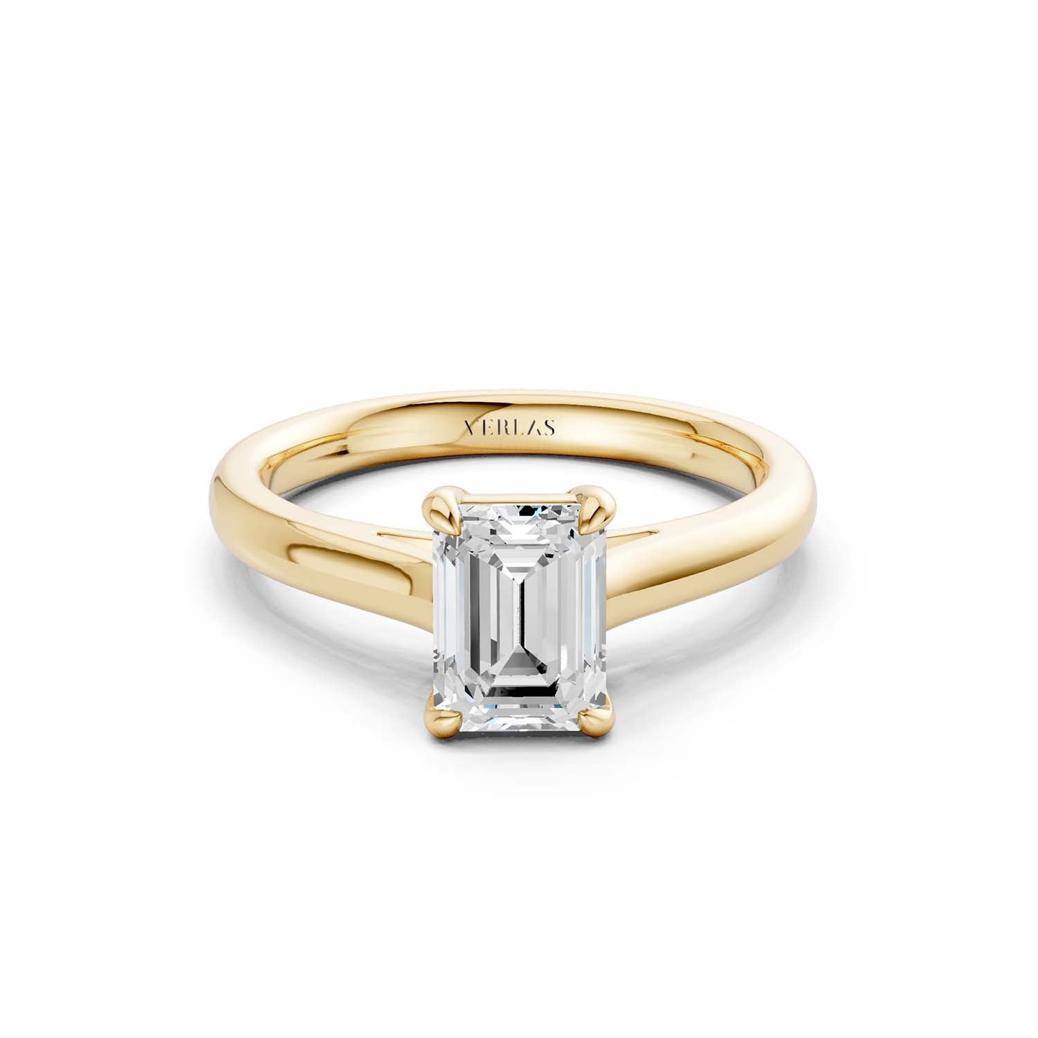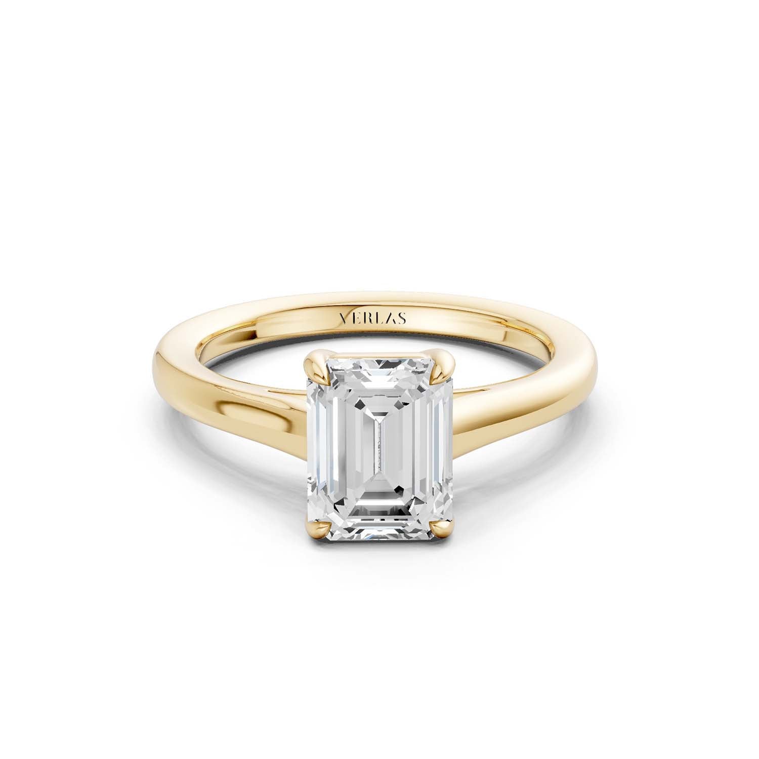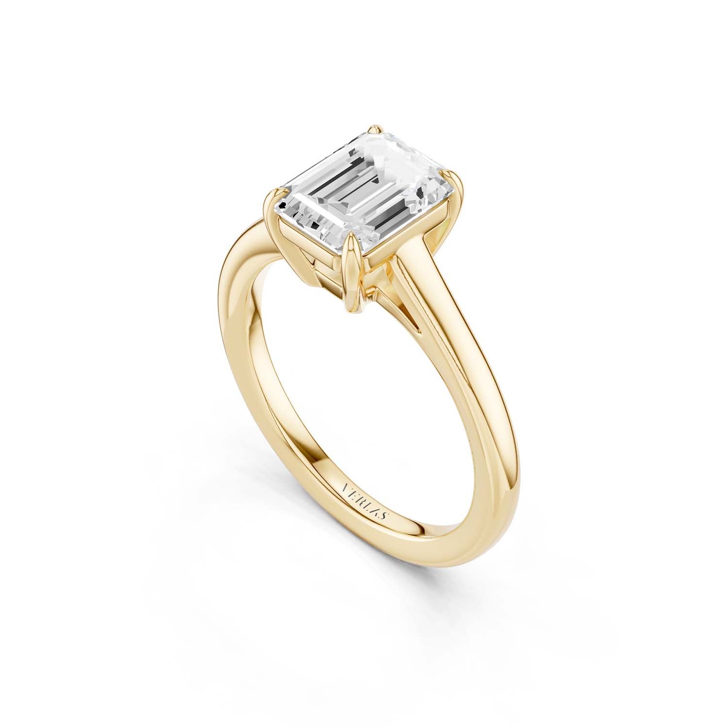 This elegant solitaire ring features an open basket with claw prongs that cradle the center emerald shape lab-grown diamond solitaire. The simple yet classic band style adds to the sleek, contemporary look of the design.