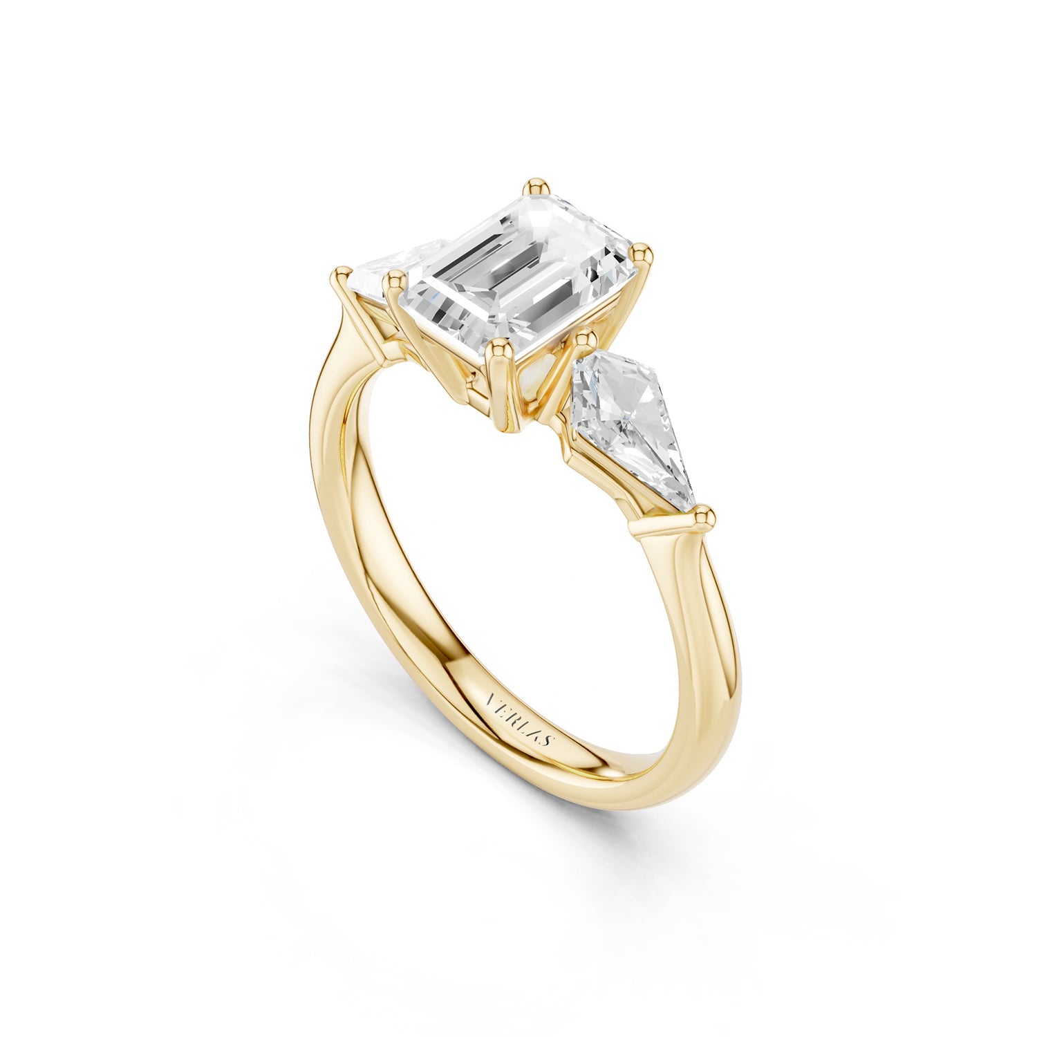 A bold twist on the three-stone classic, the Princess-Kite Trinity Diamond Ring features a striking princess-cut lab-grown diamond at its center, framed by two kite-shaped side diamonds. This modern yet timeless design celebrates love’s journey—past, present, and future.